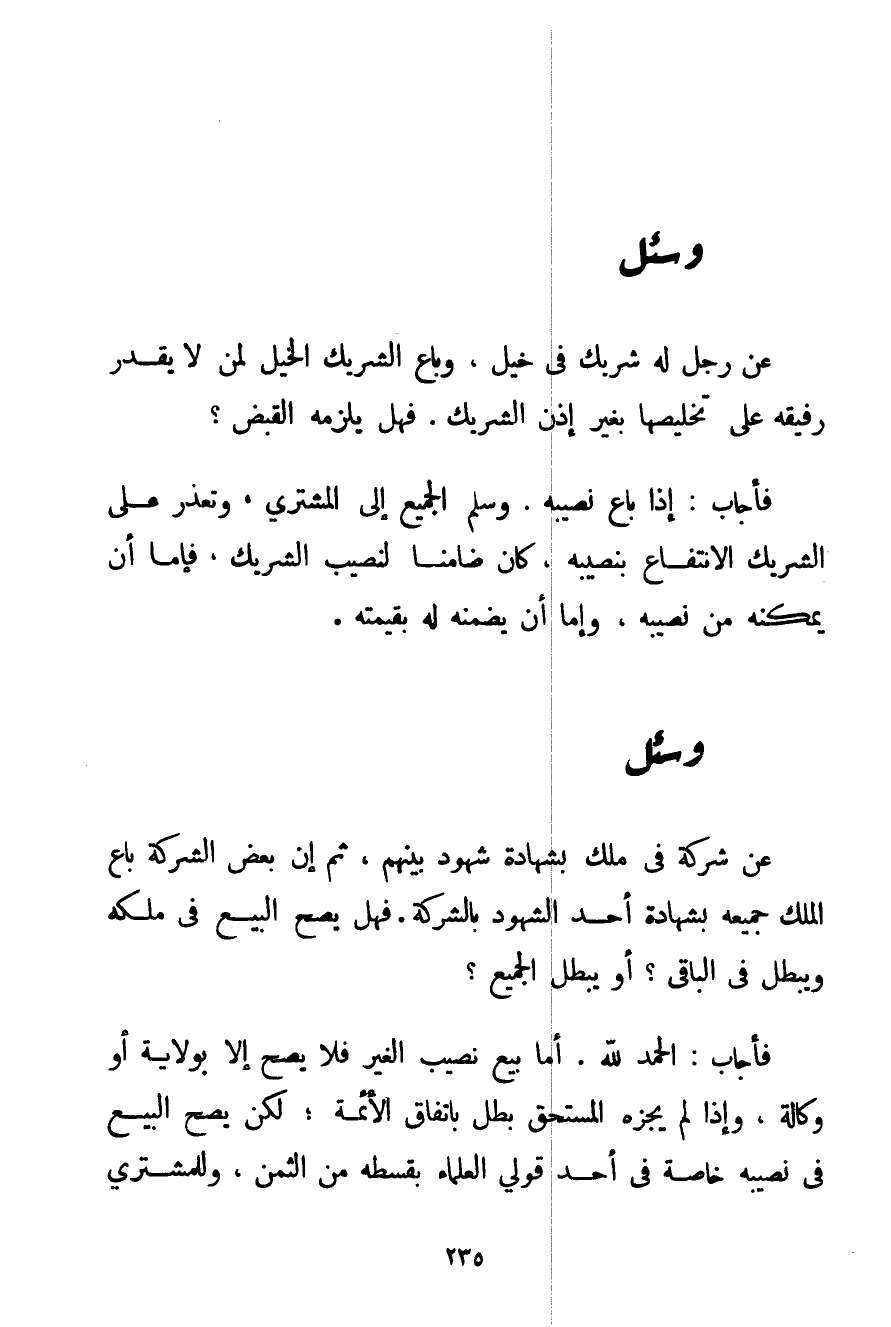 عَنْ شَرِكَةٍ فِي مِلْكٍ بِشَهَادَةِ شُهُودٍ بَيْنَهُمْ ثُمَّ إنَّ بَعْضَ الشَّرِكَةِ بَاعَ الْمِلْكَ جَمِيعَهُ بِشَهَادَةِ أَحَدِ الشُّهُودِ بِالشَّرِكَةِ. فَهَلْ يَصِحُّ الْبَيْعُ فِي مِلْكِهِ وَيَبْطُلُ فِي الْبَاقِي؟ أَوْ يَبْطُلُ الْجَمِيعُ؟