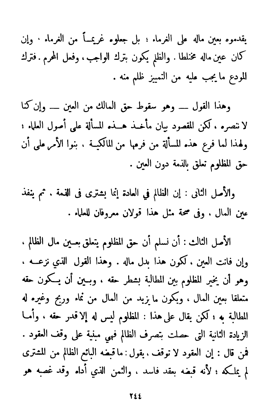 الْأَصْلُ الثَّالِثُ: أَنْ نُسَلِّمَ أَنَّ حَقَّ الْمَظْلُومِ يَتَعَلَّقُ بِعَيْنِ مَالِ الظَّالِمِ وَإِنْ فَاتَتْ الْعَيْنُ لِكَوْنِ هَذَا بَدَلُ مَالِهِ. وَهَذَا الْقَوْلُ الَّذِي نَزَعَهُ وَهُوَ أَنْ يُخَيِّرَ الْمَظْلُومَ بَيْنَ الْمُطَالَبَةِ بِشَطْرِ حَقِّهِ وَبَيْنَ أَنْ يَكُونَ حَقُّهُ مُتَعَلِّقًا بِعَيْنِ الْمَالِ وَيَكُونُ مَا يَزِيدُ مِنْ الْمَالِ مِنْ نَمَاءٍ وَرِبْحٍ وَغَيْرِهِ لَهُ الْمُطَالَبَةُ بِهِ؛ لَكِنْ يُقَالُ عَلَى هَذَا: الْمَظْلُومُ لَيْسَ لَهُ إلَّا قَدْرُ حَقِّهِ وَأَمَّا الزِّيَادَةُ الثَّانِيَةُ الَّتِي حَصَلَتْ بِتَصَرُّفِ الظَّالِمِ فَهِيَ مَبْنِيَّةٌ عَلَى وَقْفِ الْعُقُودِ. فَمَنْ قَالَ: إنَّ الْعُقُودَ لَا تُوقَفُ يَقُولُ: مَا قَبَضَهُ الْبَائِعُ الظَّالِمُ مِنْ الْمُشْتَرِي لَمْ يَمْلِكْهُ؛ لِأَنَّهُ قَبَضَهُ بِعَقْدٍ فَاسِدٍ وَالثَّمَنُ الَّذِي أَدَّاهُ وَقَدْ غَصَبَهُ هُوَ