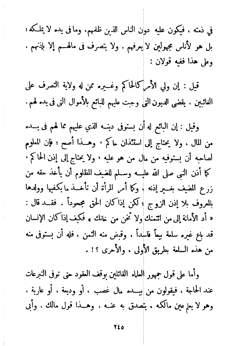 فِي ذِمَّتِهِ فَيَكُونُ عَلَيْهِ دُونَ النَّاسِ الَّذِينَ ظَلَمَهُمْ وَمَا فِي يَدِهِ لَا يَمْلِكُهُ؛ بَلْ هُوَ لِأُنَاسٍ مَجْهُولِينَ لَا يَعْرِفُهُمْ. وَلَا يَتَصَرَّفُ فِي مَالِهِمْ إلَّا بِإِذْنِهِمْ. وَعَلَى هَذَا فَفِيهِ قَوْلَانِ: قِيلَ: إنَّ وَلِيَّ الْأَمْرِ كَالْحَاكِمِ وَغَيْرِهِ مِمَّنْ لَهُ وِلَايَةُ التَّصَرُّفِ عَلَى الْغَائِبِينَ يَقْضِي الدُّيُونَ الَّتِي وَجَبَتْ عَلَيْهِمْ لِلْبَائِعِ بِالْأَمْوَالِ الَّتِي فِي يَدِهِ لَهُمْ. وَقِيلَ: إنَّ الْبَائِعَ لَهُ أَنْ يَسْتَوْفِيَ دَيْنَهُ الَّذِي عَلَيْهِمْ مِمَّا لَهُمْ فِي يَدِهِ مِنْ الْمَالِ وَلَا يَحْتَاجُ إلَى اسْتِئْذَانِ حَاكِمٍ وَهَذَا أَصَحُّ؛ فَإِنَّ الْمَعْلُومَ لِصَاحِبِهِ أَنْ يَسْتَوْفِيَهُ مِنْ مَالِ مَنْ هُوَ عَلَيْهِ وَلَا يَحْتَاجُ إلَى إذْنِ الْحَاكِمِ كَمَا أَذِنَ النَّبِيُّ صَلَّى اللَّهُ عَلَيْهِ وَسَلَّمَ لِلضَّيْفِ الْمَظْلُومِ أَنْ يَأْخُذَ حَقَّهُ مِنْ زَرْعِ الْمُضِيفِ بِغَيْرِ إذْنِهِ وَكَمَا أَمَرَ الْمَرْأَةَ أَنْ تَأْخُذَ مَا يَكْفِيهَا وَوَلَدَهَا بِالْمَعْرُوفِ بِلَا إذْنِ الزَّوْجِ؛ لَكِنْ إذَا كَانَ الْحَقُّ مَجْحُودًا. فَقَدْ قَالَ: {أَدِّ الْأَمَانَةَ إلَى مَنْ ائْتَمَنَك وَلَا تَخُنْ مَنْ خَانَك} فَكَيْفَ إذَا كَانَ الْإِنْسَانُ قَدْ بَاعَ غَيْرَهُ سِلْعَةً بَيْعًا فَاسِدًا وَقَبَضَ مِنْهُ الثَّمَنَ فَلَهُ أَنْ يَسْتَوْفِيَ مِنْهُ مِنْ هَذِهِ السِّلْعَةِ بِطَرِيقِ الْأَوْلَى وَالْأَحْرَى. وَأَمَّا عَلَى قَوْلِ جُمْهُورِ الْعُلَمَاءِ الْقَائِلِينَ بِوَقْفِ الْعُقُودِ حَتَّى تُوفِيَ التَّبَرُّعَاتُ عِنْدَ الْحَاجَةِ فَيَقُولُونَ مَنْ بِيَدِهِ مَالُ غَصْبٍ أَوْ وَدِيعَةٌ أَوْ عَارِيَةٌ وَهُوَ لَا يَعْلَمُ عَيْنَ مَالِكِهِ يَتَصَدَّقُ بِهِ عَنْهُ وَهَذَا قَوْلُ مَالِكٍ وَأَبِي