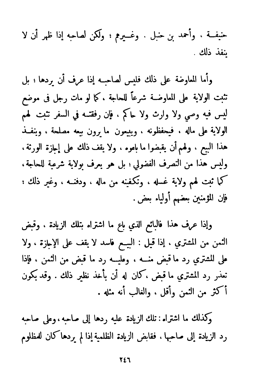 حَنِيفَةَ وَأَحْمَد بْنِ حَنْبَلٍ وَغَيْرِهِمْ؛ وَلَكِنْ لِصَاحِبِهِ إذَا ظَهَرَ أَنْ لَا يَنْفُذَ ذَلِكَ. وَأَمَّا الْمُعَاوَضَةُ عَلَى ذَلِكَ فَلَيْسَ لِصَاحِبِهِ إذَا عَرَفَ أَنْ يَرُدَّهَا؛ بَلْ تَثْبُتُ الْوِلَايَةُ عَلَى الْمُعَاوَضَةِ شَرْعًا لِلْحَاجَةِ كَمَا لَوْ مَاتَ رَجُلٌ فِي مَوْضِعٍ لَيْسَ فِيهِ وَصِيٌّ وَلَا وَارِثٌ وَلَا حَاكِمٌ فَإِنَّ رُفْقَتَهُ فِي السَّفَرِ تَثْبُتُ لَهُمْ الْوِلَايَةُ عَلَى مَالِهِ فَيَحْفَظُونَهُ وَيَبِيعُونَ مَا يَرَوْنَ بَيْعَهُ مَصْلَحَةً وَيَنْفُذُ هَذَا الْبَيْعُ وَلَهُمْ أَنَّ يَقْبِضُوا مَا بَاعُوهُ وَلَا يَقِفُ ذَلِكَ عَلَى إجَازَةِ الْوَرَثَةِ وَلَيْسَ هَذَا مِنْ التَّصَرُّفِ الْفُضُولِيِّ؛ بَلْ هُوَ يُعْرَفُ بِوِلَايَةٍ شَرْعِيَّةٍ لِلْحَاجَةِ كَمَا ثَبَتَ لَهُمْ وِلَايَةُ غُسْلِهِ وَتَكْفِينِهِ مِنْ مَالِهِ وَدَفْنِهِ وَغَيْرِ ذَلِكَ؛ فَإِنَّ الْمُؤْمِنِينَ بَعْضُهُمْ أَوْلِيَاءُ بَعْضٍ. وَإِذَا عُرِفَ هَذَا فَالْبَائِعُ الَّذِي بَاعَ مَا اشْتَرَاهُ بِتِلْكَ الزِّيَادَةِ وَقَبَضَ الثَّمَنَ مِنْ الْمُشْتَرِي إذَا قِيلَ: الْبَيْعُ فَاسِدٌ لَا يَقِفُ عَلَى الْإِجَازَةِ وَلَا عَلَى الْمُشْتَرِي رَدَّ مَا قَبَضَ مِنْهُ وَعَلَيْهِ رَدُّ مَا قَبَضَ مِنْ الثَّمَنِ فَإِذَا تَعَذَّرَ رَدَّ الْمُشْتَرِي مَا قَبَضَ كَانَ لَهُ أَنْ يَأْخُذَ نَظِيرَ ذَلِكَ. وَقَدْ يَكُونُ أَكْثَرَ مِنْ الثَّمَنِ وَأَقَلَّ وَالْغَالِبُ أَنَّهُ مِثْلُهُ. وَكَذَلِكَ مَا اشْتَرَاهُ: تِلْكَ الزِّيَادَةُ عَلَيْهِ رَدَّهَا إلَى صَاحِبِهِ وَعَلَى صَاحِبِهِ رَدُّ الزِّيَادَةِ إلَى صَاحِبِهَا فَقَابِضُ الزِّيَادَةِ الظلمية إذَا لَمْ يَرُدَّهَا كَانَ لِلْمَظْلُومِ