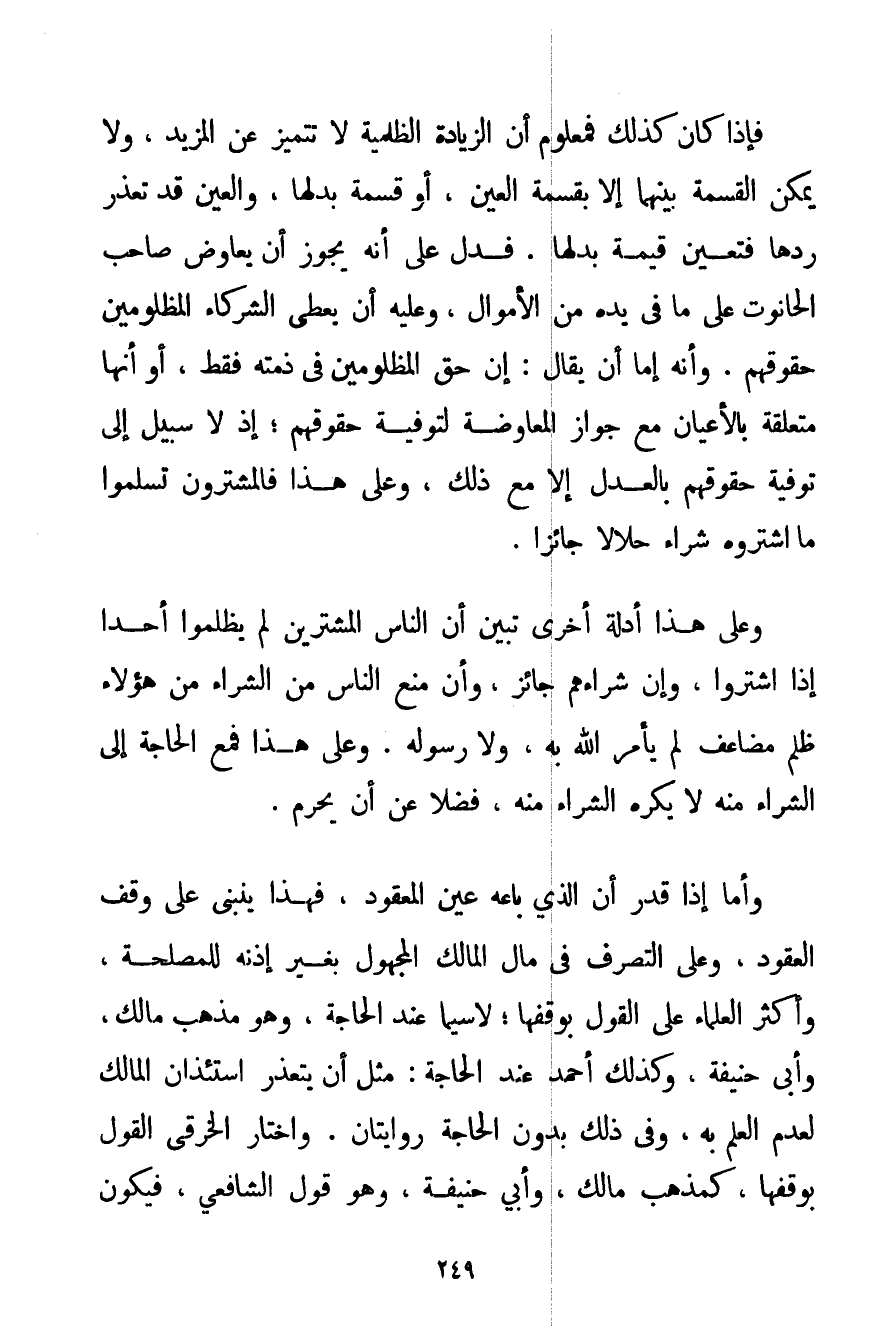 فَإِذَا كَانَ كَذَلِكَ فَمَعْلُومٌ أَنَّ الزِّيَادَةَ الظلمية لَا تَتَمَيَّزُ عَنْ الْمَزِيدِ وَلَا يُمْكِنُ الْقِسْمَةُ بَيْنَهُمَا إلَّا بِقِسْمَةِ الْعَيْنِ أَوْ قِسْمَةِ بَدَلِهَا وَالْعَيْنُ قَدْ تَعَذَّرَ رَدُّهَا فَتَعَيَّنَ قِيمَةُ بَدَلِهَا. فَدَلَّ عَلَى أَنَّهُ يَجُوزُ أَنْ يُعَاوِضَ صَاحِبَ الْحَانُوتِ عَلَى مَا فِي يَدِهِ مِنْ الْأَمْوَالِ وَعَلَيْهِ أَنْ يُعْطِيَ الشُّرَكَاءَ الْمَظْلُومِينَ حُقُوقَهُمْ. وَأَنَّهُ إمَّا أَنْ يُقَالَ: أَنَّ حَقَّ الْمَظْلُومِينَ فِي ذِمَّتِهِ فَقَطْ أَوْ أَنَّهَا مُتَعَلِّقَةٌ بِالْأَعْيَانِ مَعَ جَوَازِ الْمُعَاوَضَةِ لِتَوْفِيَةِ حُقُوقِهِمْ؛ إذْ لَا سَبِيلَ إلَى تَوْفِيَةِ حُقُوقِهِمْ بِالْعَدْلِ إلَّا مَعَ ذَلِكَ وَعَلَى هَذَا فَالْمُشْتَرُونَ تَسَلَّمُوا مَا اشْتَرَوْهُ شِرَاءً حَلَالًا جَائِزًا. وَعَلَى هَذَا أَدِلَّةٌ أُخْرَى تُبَيِّنُ أَنَّ النَّاسَ الْمُشْتَرِينَ لَمْ يَظْلِمُوا أَحَدًا إذَا اشْتَرَوْا وَإِنَّ شِرَاءَهُمْ جَائِزٌ وَأَنَّ مَنْعَ النَّاسِ مِنْ الشِّرَاءِ مِنْ هَؤُلَاءِ ظُلْمٌ مُضَاعَفٌ لَمْ يَأْمُرْ اللَّهُ بِهِ وَلَا رَسُولُهُ. وَعَلَى هَذَا فَمَعَ الْحَاجَةِ إلَى الشِّرَاءِ مِنْهُ لَا يُكْرَهُ الشِّرَاءُ مِنْهُ فَضْلًا عَنْ أَنْ يَحْرُمَ. وَأَمَّا إذَا قُدِّرَ أَنَّ الَّذِي بَاعَهُ عَيْنَ الْمَعْقُودِ فَهَذَا يَنْبَنِي عَلَى وَقْفِ الْعُقُودِ وَعَلَى التَّصَرُّفِ فِي مَالِ الْمَالِكِ الْمَجْهُولِ بِغَيْرِ إذْنِهِ لِلْمَصْلَحَةِ وَأَكْثَرُ الْعُلَمَاءِ عَلَى الْقَوْلِ بِوَقْفِهَا؛ لَا سِيَّمَا عِنْدَ الْحَاجَةِ وَهُوَ مَذْهَبُ مَالِكٍ وَأَبِي حَنِيفَةَ وَكَذَلِكَ أَحْمَد عِنْدَ الْحَاجَةِ: مِثْلُ أَنْ يَتَعَذَّرَ اسْتِئْذَانُ الْمَالِكِ لِعَدَمِ الْعِلْمِ بِهِ وَفِي ذَلِكَ بِدُونِ الْحَاجَةِ رِوَايَتَانِ. وَاخْتَارَ الخرقي الْقَوْلَ بِوَقْفِهَا كَمَذْهَبِ مَالِكٍ وَأَبِي حَنِيفَةَ وَهُوَ قَوْلُ الشَّافِعِيِّ فَيَكُونُ