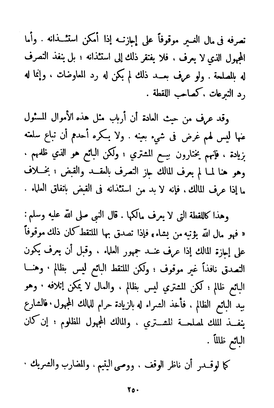 تَصَرُّفُهُ فِي مَالِ الْغَيْرِ مَوْقُوفًا عَلَى إجَازَتِهِ إذَا أَمْكَنَ اسْتِئْذَانُهُ. وَأَمَّا الْمَجْهُولُ الَّذِي لَا يُعْرَفُ فَلَا يَفْتَقِرُ ذَلِكَ إلَى اسْتِئْذَانِهِ؛ بَلْ يَنْفُذُ التَّصَرُّفُ لَهُ بِالْمَصْلَحَةِ. وَلَوْ عُرِفَ بَعْدَ ذَلِكَ لَمْ يَكُنْ لَهُ رَدُّ الْمُعَاوَضَاتِ وَإِنَّمَا لَهُ رَدُّ التَّبَرُّعَاتِ كَصَاحِبِ اللُّقَطَةِ. وَقَدْ عُرِفَ مِنْ حَيْثُ الْعَادَةُ أَنَّ أَرْبَابَ مِثْلِ هَذِهِ الْأَمْوَالِ الْمَسْئُولِ عَنْهَا لَيْسَ لَهُمْ غَرَضٌ فِي شَيْءٍ بِعَيْنِهِ. وَلَا يَكْرَهُ أَحَدُهُمْ أَنْ تُبَاعَ سِلْعَتُهُ بِزِيَادَةِ فَإِنَّهُمْ يَخْتَارُونَ بَيْعَ الْمُشْتَرِي؛ وَلَكِنَّ الْبَائِعَ هُوَ الَّذِي ظَلَمَهُمْ وَهُوَ هُنَا لَمَّا لَمْ يُعْرَفْ الْمَالِكُ جَازَ التَّصَرُّفُ بِالْعَقْدِ وَالْقَبْضِ؛ بِخِلَافِ مَا إذَا عُرِفَ الْمَالِكُ فَإِنَّهُ لَا بُدَّ مِنْ اسْتِئْذَانِهِ فِي الْقَبْضِ بِاتِّفَاقِ الْعُلَمَاءِ. وَهَذَا كَاللُّقَطَةِ الَّتِي لَا يُعْرَفُ مَالِكُهَا. قَالَ النَّبِيُّ صَلَّى اللَّهُ عَلَيْهِ وَسَلَّمَ {فَهُوَ مَالُ اللَّهِ يُؤْتِيهِ مَنْ يَشَاءُ} فَإِذَا تَصَدَّقَ بِهَا الْمُلْتَقِطُ كَانَ ذَلِكَ مَوْقُوفًا عَلَى إجَازَةِ الْمَالِكِ إذَا عُرِفَ عِنْدَ جُمْهُورِ الْعُلَمَاءِ وَقَبْلَ أَنْ يُعْرَفَ يَكُونُ التَّصَدُّقُ نَافِذًا غَيْرَ مَوْقُوفٍ؛ وَلَكِنَّ الْمُلْتَقِطَ الْبَائِعَ لَيْسَ بِظَالِمِ وَهُنَا الْبَائِعُ ظَالِمٌ؛ لَكِنَّ الْمُشْتَرِيَ لَيْسَ بِظَالِمِ وَالْمَالُ لَا يُمْكِنُ إتْلَافُهُ وَهُوَ بِيَدِ الْبَائِعِ الظَّالِمِ فَأَخْذُ الشِّرَاءِ لَهُ بِالزِّيَادَةِ حَرَامٌ لِلْمَالِكِ الْمَجْهُولِ فَالشَّارِعُ يُنَفِّذُ الْمِلْكَ لِمَصْلَحَةِ الْمُشْتَرِي وَالْمَالِكِ الْمَجْهُولِ الْمَظْلُومِ؛ إنْ كَانَ الْبَائِعُ ظَالِمًا. كَمَا لَوْ قُدِّرَ أَنَّ نَاظِرَ الْوَقْفِ وَوَصِيَّ الْيَتِيمِ وَالْمُضَارِبَ وَالشَّرِيكَ