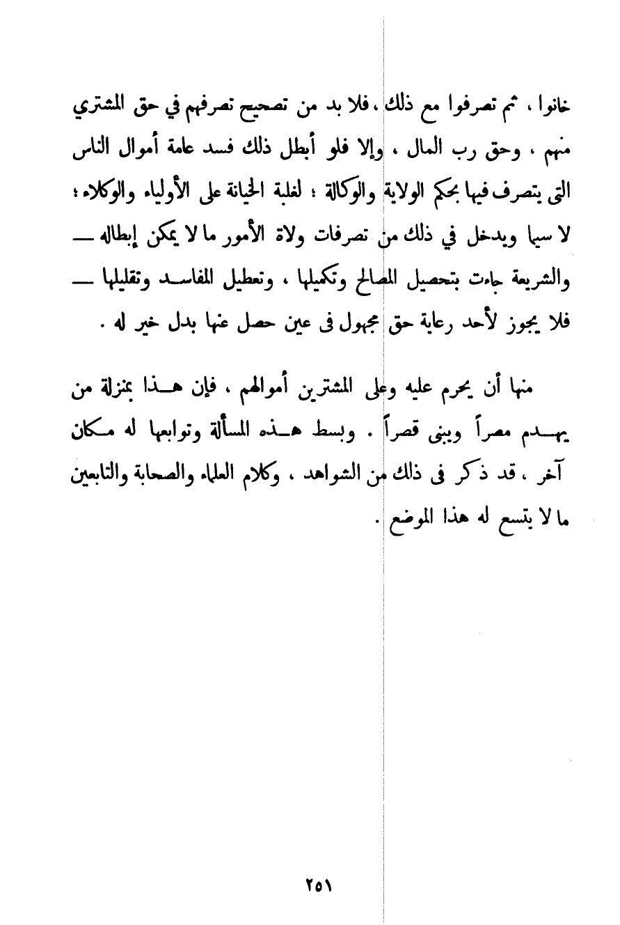 خَانُوا ثُمَّ تَصَرَّفُوا مَعَ ذَلِكَ فَلَا بُدَّ مِنْ تَصْحِيحِ تَصَرُّفِهِمْ فِي حَقِّ الْمُشْتَرِي مِنْهُمْ وَحَقِّ رَبِّ الْمَالِ وَإِلَّا فَلَوْ أَبْطَلَ ذَلِكَ فَسَدَ عَامَّةُ أَمْوَالِ النَّاسِ الَّتِي يَتَصَرَّفُ فِيهَا بِحُكْمِ الْوِلَايَةِ وَالْوِكَالَةِ؛ لِغَلَبَةِ الْخِيَانَةِ عَلَى الْأَوْلِيَاءِ وَالْوُكَلَاءِ؛ لَا سِيَّمَا وَيَدْخُلُ فِي ذَلِكَ مِنْ تَصَرُّفَاتِ وُلَاةِ الْأُمُورِ مَا لَا يُمْكِنُ إبْطَالُهُ - وَالشَّرِيعَةُ جَاءَتْ بِتَحْصِيلِ الْمَصَالِحِ وَتَكْمِيلِهَا وَتَعْطِيلِ الْمَفَاسِدِ وَتَقْلِيلِهَا - فَلَا يَجُوزُ لِأَحَدِ رِعَايَةُ حَقٍّ مَجْهُولٍ فِي عَيْنٍ حَصَلَ عَنْهَا بَدَلٌ خَيْرٌ لَهُ. مِنْهَا أَنْ يَحْرُمَ عَلَيْهِ وَعَلَى الْمُشْتَرِينَ أَمْوَالُهُمْ فَإِنَّ هَذَا بِمَنْزِلَةِ مِنْ يَهْدِمُ مِصْرًا وَيَبْنِي قَصْرًا. وَبَسْطُ هَذِهِ الْمَسْأَلَةِ وَتَوَابِعِهَا لَهُ مَكَانٌ آخَرُ قَدْ ذُكِرَ فِي ذَلِكَ مِنْ الشَّوَاهِدِ وَكَلَامِ الْعُلَمَاءِ وَالصَّحَابَةِ وَالتَّابِعِينَ مَا لَا يَتَّسِعُ لَهُ هَذَا الْمَوْضِعُ.