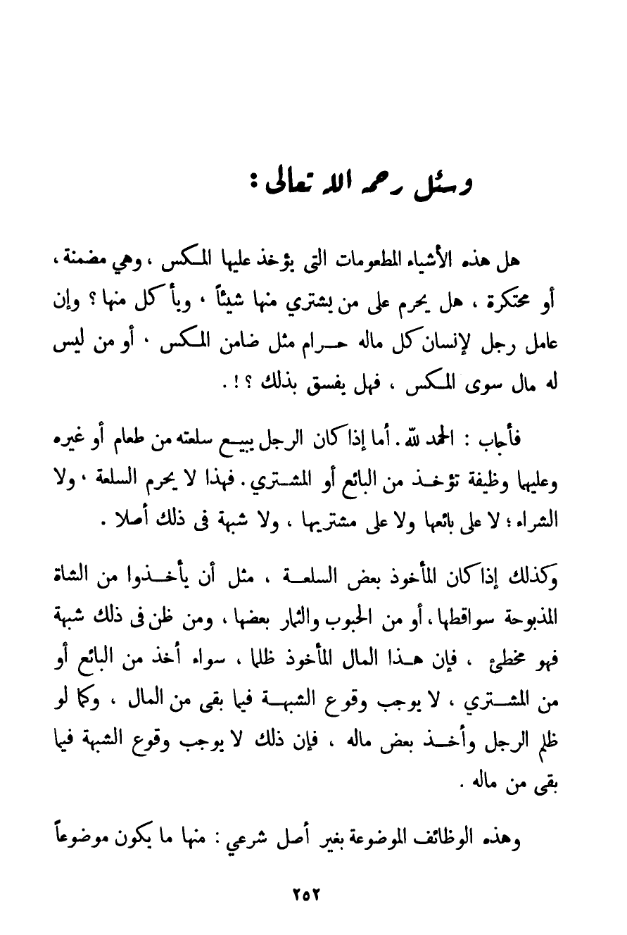 الْحَمْدُ لِلَّهِ، أَمَّا إذَا كَانَ الرَّجُلُ يَبِيعُ سِلْعَتَهُ مِنْ طَعَامٍ أَوْ غَيْرِهِ وَعَلَيْهِمَا وَظِيفَةٌ تُؤْخَذُ مِنْ الْبَائِعِ أَوْ الْمُشْتَرِي. فَهَذَا لَا يُحَرِّمُ السِّلْعَةَ وَلَا الشِّرَاءَ؛ لَا عَلَى بَائِعِهَا وَلَا عَلَى مُشْتَرِيهَا وَلَا شُبْهَةَ فِي ذَلِكَ أَصْلًا. وَكَذَلِكَ إذَا كَانَ الْمَأْخُوذُ بَعْضَ السِّلْعَةِ مِثْلُ أَنْ يَأْخُذُوا مِنْ الشَّاةِ الْمَذْبُوحَةِ سَوَاقِطَهَا أَوْ مِنْ الْحُبُوبِ وَالثِّمَارِ بَعْضَهَا وَمَنْ ظَنَّ فِي ذَلِكَ شُبْهَةً فَهُوَ مُخْطِئٌ فَإِنَّ هَذَا الْمَالَ الْمَأْخُوذَ ظُلْمًا سَوَاءٌ أُخِذَ مِنْ الْبَائِعِ أَوْ مِنْ الْمُشْتَرِي لَا يُوجِبُ وُقُوعَ الشُّبْهَةِ فِيمَا بَقِيَ مِنْ الْمَالِ وَكَمَا لَوْ ظَلَمَ الرَّجُلُ وَأَخَذَ بَعْضَ مَالِهِ فَإِنَّ ذَلِكَ لَا يُوجِبُ وُقُوعَ الشُّبْهَةِ فِيمَا بَقِيَ مِنْ مَالِهِ. وَهَذِهِ الْوَظَائِفُ الْمَوْضُوعَةُ بِغَيْرِ أَصْلٍ شَرْعِيٍّ: مِنْهَا مَا يَكُونُ مَوْضُوعًا
