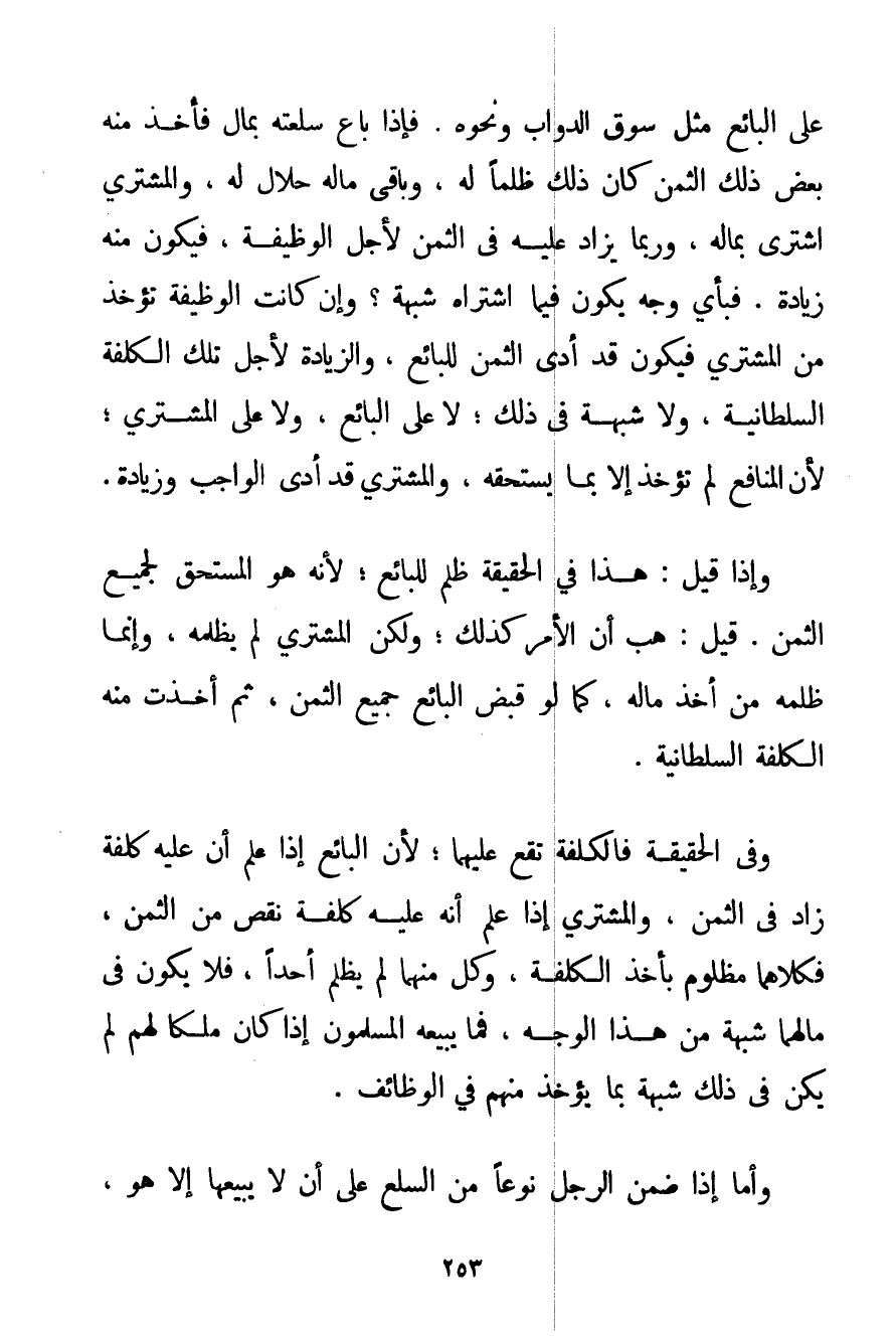 عَلَى الْبَائِعِ مِثْلُ سُوقِ الدَّوَابِّ وَنَحْوِهِ. فَإِذَا بَاعَ سِلْعَتَهُ بِمَالٍ فَأُخِذَ مِنْهُ بَعْضُ ذَلِكَ الثَّمَنِ كَانَ ذَلِكَ ظُلْمًا لَهُ وَبَاقِي مَالِهِ حَلَالٌ لَهُ وَالْمُشْتَرِي اشْتَرَى بِمَالِهِ وَرُبَّمَا يُزَادُ عَلَيْهِ فِي الثَّمَنِ لِأَجْلِ الْوَظِيفَةِ فَيَكُونُ مِنْهُ زِيَادَةٌ. فَبِأَيِّ وَجْهٍ يَكُونُ فِيمَا اشْتَرَاهُ شُبْهَةٌ؟ وَإِنْ كَانَتْ الْوَظِيفَةُ تُؤْخَذُ مِنْ الْمُشْتَرِي فَيَكُونُ قَدْ أَدَّى الثَّمَنَ لِلْبَائِعِ وَالزِّيَادَةُ لِأَجْلِ تِلْكَ الْكُلْفَةِ السُّلْطَانِيَّةِ وَلَا شُبْهَةَ فِي ذَلِكَ؛ لَا عَلَى الْبَائِعِ وَلَا عَلَى الْمُشْتَرِي؛ لِأَنَّ الْمَنَافِعَ لَمْ تُؤْخَذْ إلَّا بِمَا يَسْتَحِقُّهُ وَالْمُشْتَرِي قَدْ أَدَّى الْوَاجِبَ وَزِيَادَةً. وَإِذَا قِيلَ: هَذَا فِي الْحَقِيقَةِ ظُلْمٌ لِلْبَائِعِ؛ لِأَنَّهُ هُوَ الْمُسْتَحِقُّ جَمِيعَ الثَّمَنِ. قِيلَ: هَبْ أَنَّ الْأَمْرَ كَذَلِكَ؛ وَلَكِنَّ الْمُشْتَرِيَ لَمْ يَظْلِمْهُ وَإِنَّمَا ظَلَمَهُ مَنْ أَخَذَ مَالَهُ كَمَا لَوْ قَبَضَ الْبَائِعُ جَمِيعَ الثَّمَنِ ثُمَّ أُخِذَتْ مِنْهُ الْكُلْفَةُ السُّلْطَانِيَّةُ. وَفِي الْحَقِيقَةِ فَالْكُلْفَةُ تَقَعُ عَلَيْهِمَا؛ لِأَنَّ الْبَائِعَ إذَا عَلِمَ أَنَّ عَلَيْهِ كُلْفَةً زَادَ فِي الثَّمَنِ وَالْمُشْتَرِي إذَا عَلِمَ أَنَّ عَلَيْهِ كُلْفَةً نَقَصَ مِنْ الثَّمَنِ فَكِلَاهُمَا مَظْلُومٌ بِأَخْذِ الْكُلْفَةِ وَكُلٌّ مِنْهُمَا لَمْ يَظْلِمْ أَحَدًا فَلَا يَكُونُ فِي مَالِهِمَا شُبْهَةٌ مِنْ هَذَا الْوَجْهِ فَمَا يَبِيعُهُ الْمُسْلِمُونَ إذَا كَانَ مِلْكًا لَهُمْ لَمْ يَكُنْ فِي ذَلِكَ شُبْهَةٌ بِمَا يُؤْخَذُ مِنْهُمْ فِي الْوَظَائِفِ. وَأَمَّا إذَا ضَمِنَ الرَّجُلُ نَوْعًا مِنْ السِّلَعِ عَلَى أَنْ لَا يَبِيعَهَا إلَّا هُوَ