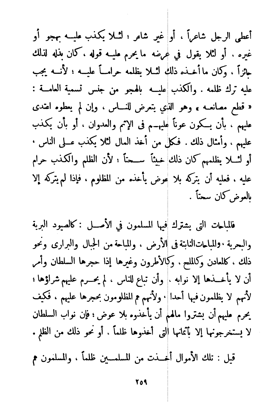أَعْطَى الرَّجُلُ شَاعِرًا أَوْ غَيْرَ شَاعِرٍ؛ لِئَلَّا يَكْذِبَ عَلَيْهِ بِهَجْوٍ أَوْ غَيْرِهِ أَوْ لِئَلَّا يَقُولَ فِي عِرْضِهِ مَا يَحْرُمُ عَلَيْهِ قَوْلُهُ كَانَ بَذْلُهُ لِذَلِكَ جَائِزًا وَكَانَ مَا أَخَذَهُ ذَلِكَ لِئَلَّا يَظْلِمَهُ حَرَامًا عَلَيْهِ؛ لِأَنَّهُ يَجِبُ عَلَيْهِ تَرْكُ ظُلْمِهِ. وَالْكَذِبُ عَلَيْهِ بِالْهَجْوِ مِنْ جِنْسِ تَسْمِيَةِ الْعَامَّةِ: " قَطَعَ مَصَانِعَهُ " وَهُوَ الَّذِي يَتَعَرَّضُ لِلنَّاسِ وَإِنْ لَمْ يُعْطُوهُ اعْتَدَى عَلَيْهِمْ بِأَنْ يَكُونَ عَوْنًا عَلَيْهِمْ فِي الْإِثْمِ وَالْعُدْوَانِ أَوْ بِأَنْ يَكْذِبَ عَلَيْهِمْ وَأَمْثَالُ ذَلِكَ. فَكُلُّ مَنْ أَخَذَ الْمَالَ لِئَلَّا يَكْذِبَ عَلَى النَّاسِ أَوْ لِئَلَّا يَظْلِمَهُمْ كَانَ ذَلِكَ خَبِيثًا سُحْتًا؛ لِأَنَّ الظُّلْمَ وَالْكَذِبَ حَرَامٌ عَلَيْهِ فَعَلَيْهِ أَنْ يَتْرُكَهُ بِلَا عِوَضٍ يَأْخُذُهُ مِنْ الْمَظْلُومِ فَإِذَا لَمْ يَتْرُكْهُ إلَّا بِالْعِوَضِ كَانَ سُحْتًا.