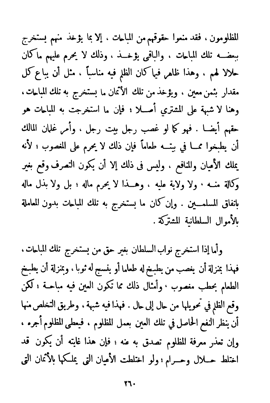 الْمَظْلُومُونَ فَقَدْ مُنِعُوا حُقُوقَهُمْ مِنْ الْمُبَاحَاتِ إلَّا بِمَا يُؤْخَذُ مِنْهُمْ يُسْتَخْرَجُ بِبَعْضِهِ تِلْكَ الْمُبَاحَاتُ وَالْبَاقِي يُؤْخَذُ وَذَلِكَ لَا يَحْرُمُ عَلَيْهِمْ مَا كَانَ حَلَالًا لَهُمْ وَهَذَا ظَاهِرٌ فِيمَا كَانَ الظُّلْمُ فِيهِ مُنَاسِبًا مِثْلَ أَنْ يُبَاعَ كُلُّ مِقْدَارٍ بِثَمَنٍ مُعَيَّنٍ وَيُؤْخَذُ مِنْ تِلْكَ الْأَثْمَانِ مَا يُسْتَخْرَجُ بِهِ تِلْكَ الْمُبَاحَاتُ وَهُنَا لَا شُبْهَةَ عَلَى الْمُشْتَرِي أَصْلًا؛ فَإِنَّ مَا اُسْتُخْرِجَتْ بِهِ الْمُبَاحَاتُ هُوَ حَقُّهُمْ أَيْضًا. فَهُوَ كَمَا لَوْ غَصَبَ رَجُلٌ بَيْتَ رَجُلٍ وَأَمَرَ غِلْمَانَ الْمَالِكِ أَنْ يَطْبُخُوا مِمَّا فِي بَيْتِهِ طَعَامًا فَإِنَّ ذَلِكَ لَا يَحْرُمُ عَلَى الْمَغْصُوبِ؛ لِأَنَّهُ يَمْلِكُ الْأَعْيَانَ وَالْمَنَافِعَ وَلَيْسَ فِي ذَلِكَ إلَّا أَنْ يَكُونَ التَّصَرُّفُ وَقَعَ بِغَيْرِ وِكَالَةٍ مِنْهُ وَلَا وِلَايَةٍ عَلَيْهِ وَهَذَا لَا يَحْرُمُ مَالُهُ؛ بَلْ وَلَا بَذْلُ مَالِهِ بِاتِّفَاقِ الْمُسْلِمِينَ. وَإِنْ كَانَ مَا يُسْتَخْرَجُ بِهِ تِلْكَ الْمُبَاحَاتُ بِدُونِ الْمُعَامَلَةِ بِالْأَمْوَالِ السُّلْطَانِيَّةِ الْمُشْتَرَكَةِ.