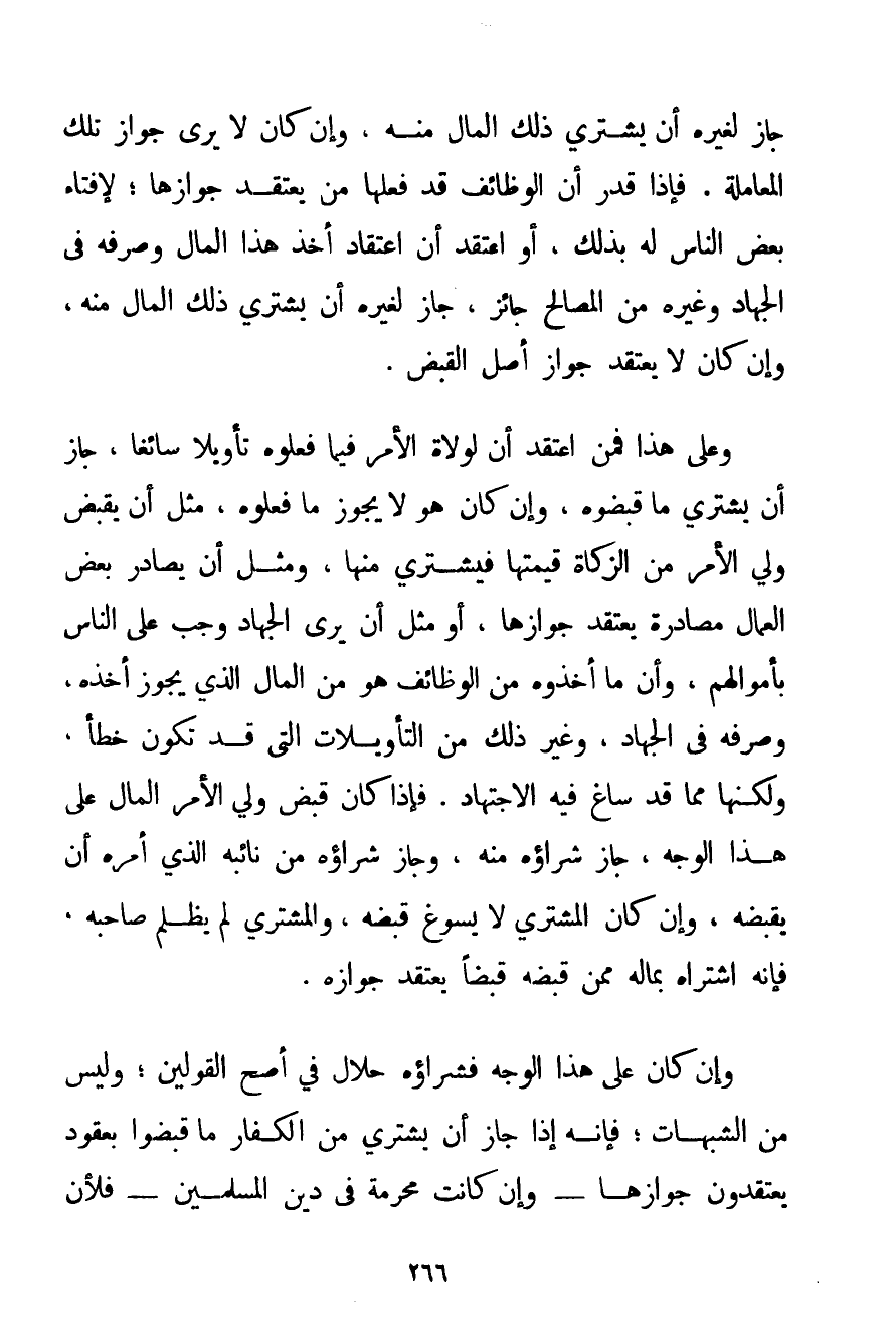 جَازَ لِغَيْرِهِ أَنْ يَشْتَرِيَ ذَلِكَ الْمَالَ مِنْهُ وَإِنْ كَانَ لَا يَرَى جَوَازَ تِلْكَ الْمُعَامَلَةِ. فَإِذَا قُدِّرَ أَنَّ الْوَظَائِفَ قَدْ فَعَلَهَا مَنْ يَعْتَقِدُ جَوَازَهَا؛ لِإِفْتَاءِ بَعْضِ النَّاسِ لَهُ بِذَلِكَ أَوْ اعْتَقَدَ أَنَّ اعْتِقَادَ أَخْذِ هَذَا الْمَالِ وَصَرْفَهُ فِي الْجِهَادِ وَغَيْرِهِ مِنْ الْمَصَالِحِ جَائِزٌ جَازَ لِغَيْرِهِ أَنْ يَشْتَرِيَ ذَلِكَ الْمَالَ مِنْهُ وَإِنْ كَانَ لَا يَعْتَقِدُ جَوَازَ أَصْلِ الْقَبْضِ. وَعَلَى هَذَا فَمَنْ اعْتَقَدَ أَنَّ لِوُلَاةِ الْأَمْرِ فِيمَا فَعَلُوهُ تَأْوِيلًا سَائِغًا جَازَ أَنْ يَشْتَرِيَ مَا قَبَضُوهُ وَإِنْ كَانَ هُوَ لَا يَجُوزُ مَا فَعَلُوهُ مِثْلَ أَنْ يَقْبِضَ وَلِيُّ الْأَمْرِ مِنْ الزَّكَاةِ قِيمَتَهَا فَيَشْتَرِي مِنْهَا وَمِثْلَ أَنْ يُصَادِرَ بَعْضَ الْعُمَّالِ مُصَادَرَةً يَعْتَقِدُ جَوَازَهَا أَوْ مِثْلَ أَنْ يَرَى الْجِهَادَ وَجَبَ عَلَى النَّاسِ بِأَمْوَالِهِمْ وَأَنَّ مَا أَخَذُوهُ مِنْ الْوَظَائِفِ هُوَ مِنْ الْمَالِ الَّذِي يَجُوزُ أَخْذُهُ وَصَرْفُهُ فِي الْجِهَادِ وَغَيْرُ ذَلِكَ مِنْ التَّأْوِيلَاتِ الَّتِي قَدْ تَكُونُ خَطَأً وَلَكِنَّهَا مِمَّا قَدْ سَاغَ فِيهِ الِاجْتِهَادُ. فَإِذَا كَانَ قَبَضَ وَلِيُّ الْأَمْرِ الْمَالَ عَلَى هَذَا الْوَجْهِ جَازَ شِرَاؤُهُ مِنْهُ وَجَازَ شِرَاؤُهُ مِنْ نَائِبِهِ الَّذِي أَمَرَهُ أَنْ يَقْبِضَهُ وَإِنْ كَانَ الْمُشْتَرِي لَا يُسَوِّغُ قَبْضَهُ وَالْمُشْتَرِي لَمْ يَظْلِمْ صَاحِبَهُ فَإِنَّهُ اشْتَرَاهُ بِمَالِهِ مِمَّنْ قَبَضَهُ قَبْضًا يَعْتَقِدُ جَوَازَهُ. وَإِنْ كَانَ عَلَى هَذَا الْوَجْهِ فَشِرَاؤُهُ حَلَالٌ فِي أَصَحِّ الْقَوْلَيْنِ؛ وَلَيْسَ مِنْ الشُّبُهَاتِ؛ فَإِنَّهُ إذَا جَازَ أَنْ يَشْتَرِيَ مِنْ الْكُفَّارِ مَا قَبَضُوا بِعُقُودٍ يَعْتَقِدُونَ جَوَازَهَا - وَإِنْ كَانَتْ مُحَرَّمَةً فِي دِينِ الْمُسْلِمِينَ - فَلِأَنْ