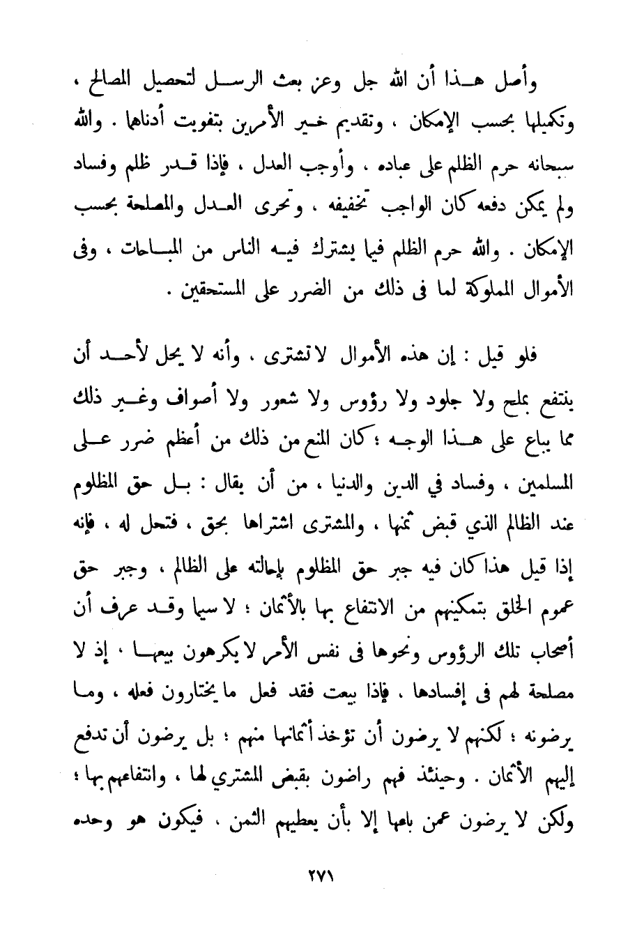 وَأَصْلُ هَذَا أَنَّ اللَّهَ جَلَّ وَعَزَّ بَعَثَ الرُّسُلَ لِتَحْصِيلِ الْمَصَالِحِ وَتَكْمِيلِهَا بِحَسَبِ الْإِمْكَانِ وَتَقْدِيمِ خَيْرِ الْأَمْرَيْنِ بِتَفْوِيتِ أَدْنَاهُمَا. وَاَللَّهُ سُبْحَانَهُ حَرَّمَ الظُّلْمَ عَلَى عِبَادِهِ وَأَوْجَبَ الْعَدْلَ فَإِذَا قُدِّرَ ظُلْمٌ وَفَسَادٌ وَلَمْ يُمْكِنْ دَفْعُهُ كَانَ الْوَاجِبُ تَخْفِيفَهُ وَتَحَرِّي الْعَدْلِ وَالْمَصْلَحَةِ بِحَسَبِ الْإِمْكَانِ. وَاَللَّهُ حَرَّمَ الظُّلْمَ فِيمَا يَشْتَرِكُ فِيهِ النَّاسُ مِنْ الْمُبَاحَاتِ وَفِي الْأَمْوَالِ الْمَمْلُوكَةِ لِمَا فِي ذَلِكَ مِنْ الضَّرَرِ عَلَى الْمُسْتَحِقِّينَ. فَلَوْ قِيلَ: إنَّ هَذِهِ الْأَمْوَالَ لَا تُشْتَرَى وَأَنَّهُ لَا يَحِلُّ لِأَحَدٍ أَنْ يَنْتَفِعَ بِمِلْحِ وَلَا جُلُودٍ وَلَا رُءُوسٍ وَلَا شُعُورٍ وَلَا أَصْوَافٍ وَغَيْرِ ذَلِكَ مِمَّا يُبَاعُ عَلَى هَذَا الْوَجْهِ؛ كَانَ الْمَنْعُ مِنْ ذَلِكَ مِنْ أَعْظَمِ ضَرَرٍ عَلَى الْمُسْلِمِينَ وَفَسَادٍ فِي الدِّينِ وَالدُّنْيَا مِنْ أَنْ يُقَالَ: بَلْ حَقُّ الْمَظْلُومِ عِنْدَ الظَّالِمِ الَّذِي قَبَضَ ثَمَنَهَا وَالْمُشْتَرِي اشْتَرَاهَا بِحَقِّ فَتَحِلُّ لَهُ فَإِنَّهُ إذَا قِيلَ هَذَا كَانَ فِيهِ جَبْرُ حَقِّ الْمَظْلُومِ بِإِحَالَتِهِ عَلَى الظَّالِمِ وَجَبْرُ حَقِّ عُمُومِ الْخَلْقِ بِتَمْكِينِهِمْ مِنْ الِانْتِفَاعِ بِهَا بِالْأَثْمَانِ؛ لَا سِيَّمَا وَقَدْ عُرِفَ أَنَّ أَصْحَابَ تِلْكَ الرُّءُوسِ وَنَحْوِهَا فِي نَفْسِ الْأَمْرِ لَا يَكْرَهُونَ بَيْعَهَا إذْ لَا مَصْلَحَةَ لَهُمْ فِي إفْسَادِهَا فَإِذَا بِيعَتْ فَقَدْ فَعَلَ مَا يَخْتَارُونَ فِعْلَهُ وَمَا يَرْضَوْنَهُ؛ لَكِنَّهُمْ لَا يَرْضَوْنَ أَنْ تُؤْخَذَ أَثْمَانُهَا مِنْهُمْ؛ بَلْ يَرْضَوْنَ أَنْ تُدْفَعَ إلَيْهِمْ الْأَثْمَانُ. وَحِينَئِذٍ فَهُمْ رَاضُونَ بِقَبْضِ الْمُشْتَرِي لَهَا وَانْتِفَاعِهِمْ بِهَا؛ وَلَكِنْ لَا يَرْضَوْنَ عَمَّنْ بَاعَهَا إلَّا بِأَنْ يُعْطِيَهُمْ الثَّمَنَ فَيَكُونُ هُوَ وَحْدَهُ