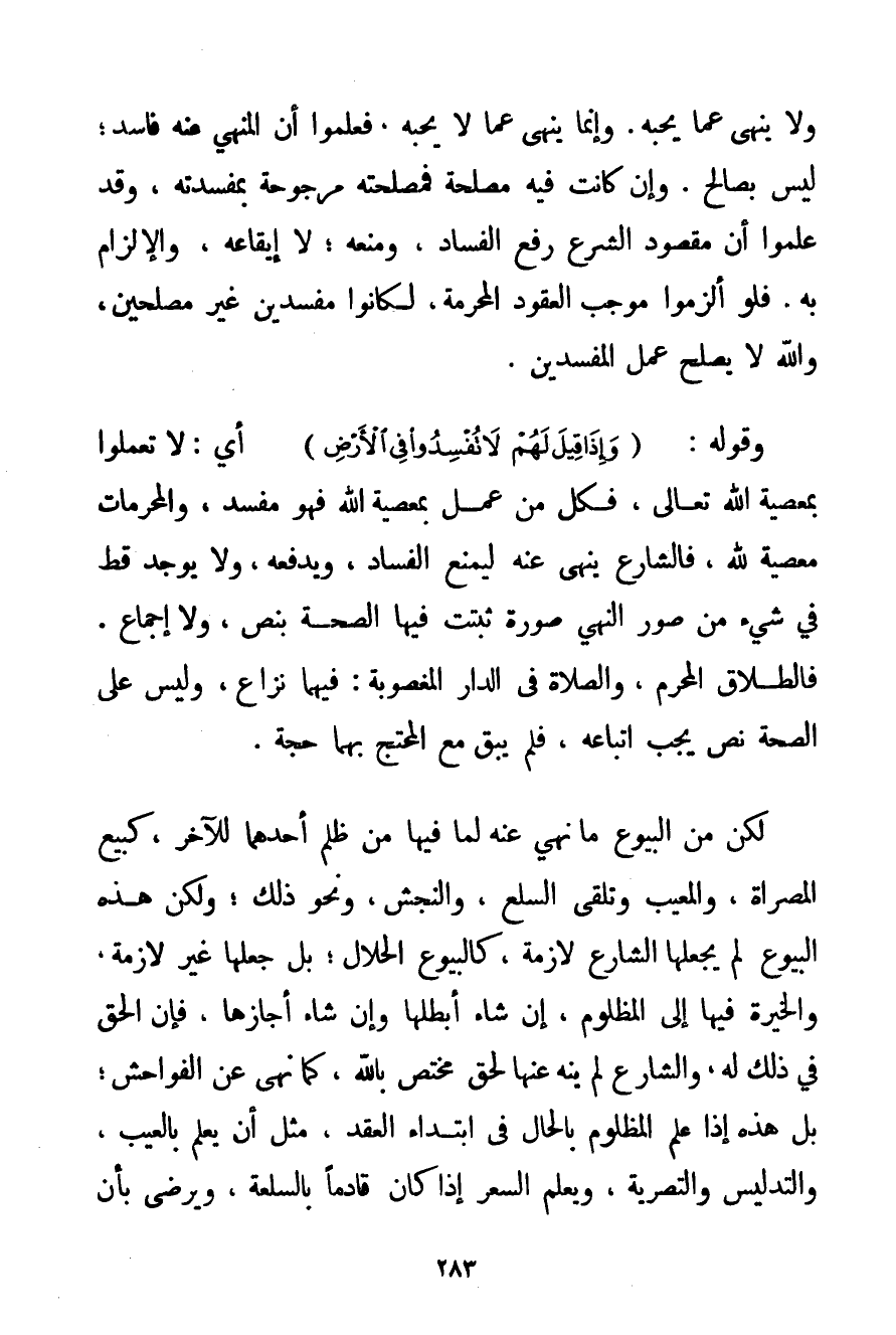 وَلَا يَنْهَى عَمَّا يُحِبُّهُ. وَإِنَّمَا يَنْهَى عَمَّا لَا يُحِبُّهُ فَعَلِمُوا أَنَّ الْمَنْهِيَّ عَنْهُ فَاسِدٌ؛ لَيْسَ بِصَالِحِ. وَإِنْ كَانَتْ فِيهِ مَصْلَحَةٌ فَمَصْلَحَتُهُ مَرْجُوحَةٌ بِمَفْسَدَتِهِ وَقَدْ عَلِمُوا أَنَّ مَقْصُودَ الشَّرْعِ رَفْعُ الْفَسَادِ وَمَنْعُهُ؛ لَا إيقَاعُهُ وَالْإِلْزَامُ بِهِ. فَلَوْ أُلْزِمُوا مُوجِبَ الْعُقُودِ الْمُحَرَّمَةِ لَكَانُوا مُفْسِدِينَ غَيْرَ مُصْلِحِينَ وَاَللَّهُ لَا يُصْلِحُ عَمَلَ الْمُفْسِدِينَ. وَقَوْلُهُ: {وَإِذَا قِيلَ لَهُمْ لَا تُفْسِدُوا فِي الْأَرْضِ} أَيْ: لَا تَعْمَلُوا بِمَعْصِيَةِ اللَّهِ تَعَالَى فَكُلُّ مَنْ عَمِلَ بِمَعْصِيَةِ اللَّهِ فَهُوَ مُفْسِدٌ وَالْمُحَرَّمَاتُ مَعْصِيَةٌ لِلَّهِ فَالشَّارِعُ يَنْهَى عَنْهُ لِيَمْنَعَ الْفَسَادَ وَيَدْفَعَهُ وَلَا يُوجَدُ قَطُّ فِي شَيْءٍ مِنْ صُوَرِ النَّهْيِ صُورَةٌ ثَبَتَتْ فِيهَا الصِّحَّةُ بِنَصِّ وَلَا إجْمَاعٍ. فَالطَّلَاقُ الْمُحَرَّمُ وَالصَّلَاةُ فِي الدَّارِ الْمَغْصُوبَةِ: فِيهِمَا نِزَاعٌ وَلَيْسَ عَلَى الصِّحَّةِ نَصٌّ يَجِبُ اتِّبَاعُهُ فَلَمْ يَبْقَ مَعَ الْمُحْتَجِّ بِهِمَا حُجَّةٌ. لَكِنْ مِنْ الْبُيُوعِ مَا نُهِيَ عَنْهُ لِمَا فِيهَا مِنْ ظُلْمِ أَحَدِهِمَا لِلْآخَرِ كَبَيْعِ الْمُصَرَّاةِ وَالْمَعِيبِ وَتَلَقِّي السِّلَعَ وَالنَّجْش وَنَحْوِ ذَلِكَ؛ وَلَكِنَّ هَذِهِ الْبُيُوعَ لَمْ يَجْعَلْهَا الشَّارِعُ لَازِمَةً كَالْبُيُوعِ الْحَلَالِ؛ بَلْ جَعَلَهَا غَيْرَ لَازِمَةٍ وَالْخِيَرَةُ فِيهَا إلَى الْمَظْلُومِ إنْ شَاءَ أَبْطَلَهَا وَإِنْ شَاءَ أَجَازَهَا فَإِنَّ الْحَقَّ فِي ذَلِكَ لَهُ وَالشَّارِعُ لَمْ يَنْهَ عَنْهَا لِحَقٍّ مُخْتَصٍّ بِاَللَّهِ كَمَا نَهَى عَنْ الْفَوَاحِشِ؛ بَلْ هَذِهِ إذَا عَلِمَ الْمَظْلُومُ بِالْحَالِ فِي ابْتِدَاءِ الْعَقْدِ مِثْلَ أَنْ يَعْلَمَ بِالْعَيْبِ وَالتَّدْلِيسِ وَالتَّصْرِيَةِ وَيَعْلَمَ السِّعْرَ إذَا كَانَ قَادِمًا بِالسِّلْعَةِ وَيَرْضَى بِأَنْ