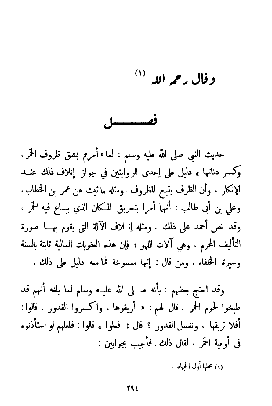 حَدِيثُ النَّبِيِّ صَلَّى اللَّهُ عَلَيْهِ وَسَلَّمَ لَمَّا {أَمَرَهُمْ بِشَقِّ ظُرُوفِ الْخَمْرِ وَكَسْرِ دِنَانِهَا} دَلِيلٌ عَلَى إحْدَى الرِّوَايَتَيْنِ فِي جَوَازِ إتْلَافِ ذَلِكَ عِنْدَ الْإِنْكَارِ وَأَنَّ الظَّرْفَ يَتْبَعُ الْمَظْرُوفَ. وَمِثْلُهُ مَا ثَبَتَ عَنْ عُمَرَ بْنِ الْخَطَّابِ وَعَلِيِّ بْنِ أَبِي طَالِبٍ: أَنَّهُمَا أَمَرَا بِتَحْرِيقِ الْمَكَانِ الَّذِي يُبَاعُ فِيهِ الْخَمْرُ وَقَدْ نَصَّ أَحْمَد عَلَى ذَلِكَ. وَمِثْلُهُ إتْلَافُ الْآلَةِ الَّتِي يَقُومُ بِهَا صُورَةُ التَّأْلِيفِ الْمُحَرَّمِ وَهِيَ آلَاتُ اللَّهْوِ؛ فَإِنَّ هَذِهِ الْعُقُوبَاتِ الْمَالِيَّةَ ثَابِتَةٌ بِالسُّنَّةِ وَسِيرَةِ الْخُلَفَاءِ. وَمَنْ قَالَ: إنَّهَا مَنْسُوخَةٌ فَمَا مَعَهُ دَلِيلٌ عَلَى ذَلِكَ. وَقَدْ احْتَجَّ بَعْضُهُمْ: {بِأَنَّهُ صَلَّى اللَّهُ عَلَيْهِ وَسَلَّمَ لَمَّا بَلَغَهُ أَنَّهُمْ قَدْ طَبَخُوا لُحُومَ الْحُمُرِ. قَالَ لَهُمْ: أَرِيقُوهَا وَاكْسِرُوا الْقُدُورَ. قَالُوا: أَفَلَا نُرِيقُهَا وَنَغْسِلُ الْقُدُورَ؟ قَالَ: افْعَلُوا} قَالُوا: فَلَعَلَّهُمْ لَوْ اسْتَأْذَنُوهُ فِي أَوْعِيَةِ الْخَمْرِ لَقَالَ ذَلِكَ. فَأُجِيبَ بِجَوَابَيْنِ: