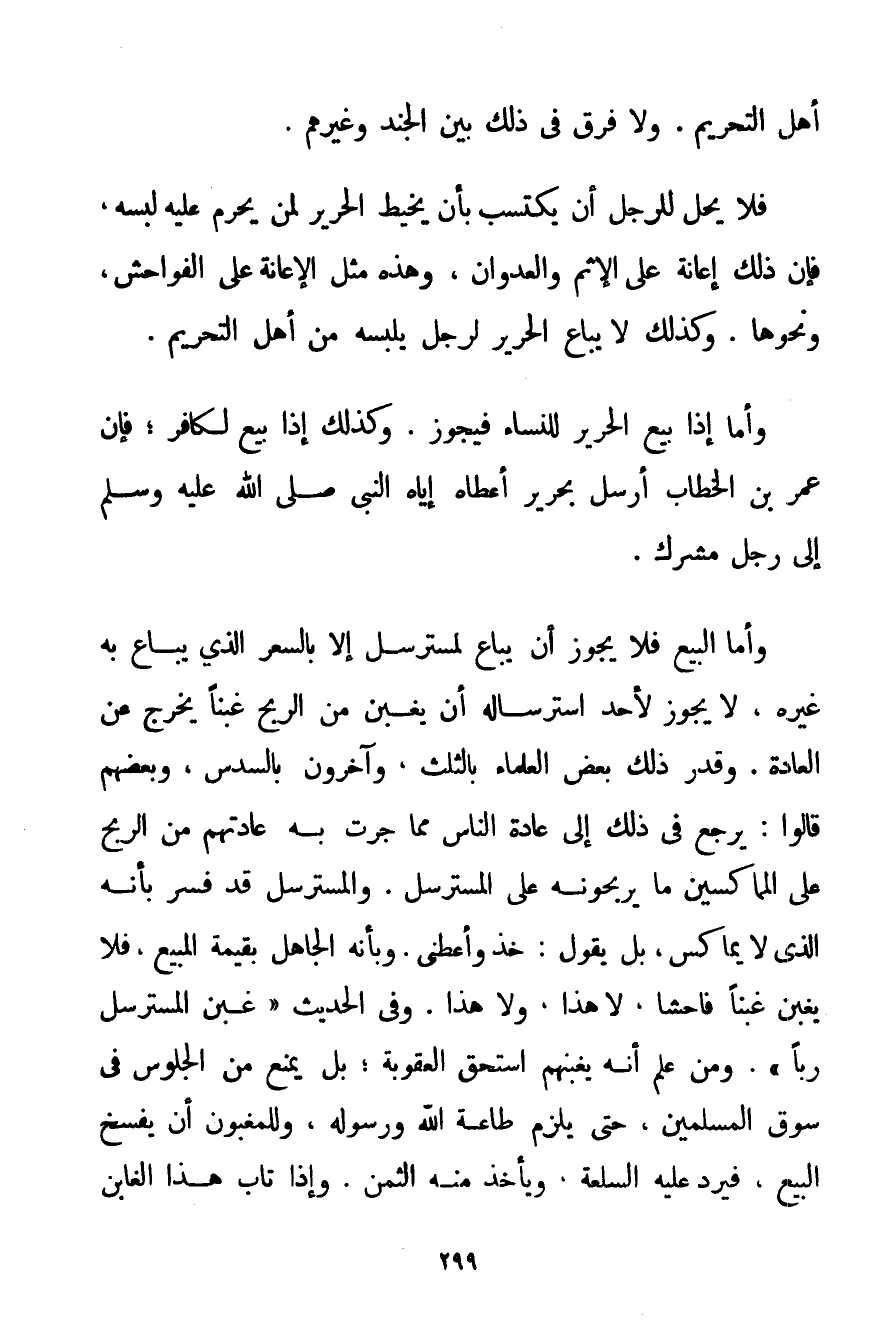 أَهْلِ التَّحْرِيمِ. وَلَا فَرْقَ فِي ذَلِكَ بَيْنَ الْجُنْدِ وَغَيْرِهِمْ. فَلَا يَحِلُّ لِلرَّجُلِ أَنْ يَكْتَسِبَ بِأَنْ يَخِيطَ الْحَرِيرَ لِمَنْ يَحْرُمُ عَلَيْهِ لُبْسُهُ فَإِنَّ ذَلِكَ إعَانَةٌ عَلَى الْإِثْمِ وَالْعُدْوَانِ وَهَذِهِ مِثْلُ الْإِعَانَةِ عَلَى الْفَوَاحِشِ وَنَحْوِهَا. وَكَذَلِكَ لَا يُبَاعُ الْحَرِيرُ لِرَجُلٍ يَلْبَسُهُ مِنْ أَهْلِ التَّحْرِيمِ. وَأَمَّا إذَا بِيعَ الْحَرِيرُ لِلنِّسَاءِ فَيَجُوزُ. وَكَذَلِكَ إذَا بِيعَ لِكَافِرِ؛ فَإِنَّ عُمَرَ بْنَ الْخَطَّابِ أَرْسَلَ بِحَرِيرٍ أَعْطَاهُ إيَّاهُ النَّبِيُّ صَلَّى اللَّهُ عَلَيْهِ وَسَلَّمَ إلَى رَجُلٍ مُشْرِكٍ. وَأَمَّا الْبَيْعُ فَلَا يَجُوزُ أَنْ يُبَاعَ لِمُسْتَرْسِلٍ إلَّا بِالسِّعْرِ الَّذِي يُبَاعُ بِهِ غَيْرُهُ لَا يَجُوزُ لِأَحَدِ اسْتِرْسَالُهُ أَنْ يَغْبِنَ مِنْ الرِّبْحِ غَبْنًا يُخْرِجُ عَنْ الْعَادَةِ. وَقَدَّرَ ذَلِكَ بَعْضُ الْعُلَمَاءِ بِالثُّلُثِ وَآخَرُونَ بِالسُّدُسِ وَبَعْضُهُمْ قَالُوا: يَرْجِعُ فِي ذَلِكَ إلَى عَادَةِ النَّاسِ مِمَّا جَرَتْ بِهِ عَادَتُهُمْ مِنْ الرِّبْحِ عَلَى المماكسين مَا يَرْبَحُونَهُ عَلَى الْمُسْتَرْسِلِ. وَالْمُسْتَرْسِلُ قَدْ فُسِّرَ بِأَنَّهُ الَّذِي لَا يُمَاكِسُ بَلْ يَقُولُ: خُذْ وَأَعْطِنِي. وَبِأَنَّهُ الْجَاهِلُ بِقِيمَةِ الْمَبِيعِ فَلَا يَغْبِنُ غَبْنًا فَاحِشًا لَا هَذَا وَلَا هَذَا. وَفِي الْحَدِيثِ {غَبْنُ الْمُسْتَرْسِلِ رِبًا} . وَمَنْ عُلِمَ أَنَّهُ يَغْبِنُهُمْ اسْتَحَقَّ الْعُقُوبَةَ؛ بَلْ يُمْنَعُ مِنْ الْجُلُوسَ فِي سُوقِ الْمُسْلِمِينَ حَتَّى يُلْزَمَ طَاعَةَ اللَّهِ وَرَسُولِهِ وَلِلْمَغْبُونِ أَنْ يَفْسَخَ الْبَيْعَ فَيَرُدَّ عَلَيْهِ السِّلْعَةَ وَيَأْخُذَ مِنْهُ الثَّمَنَ. وَإِذَا تَابَ هَذَا الْغَابِنُ