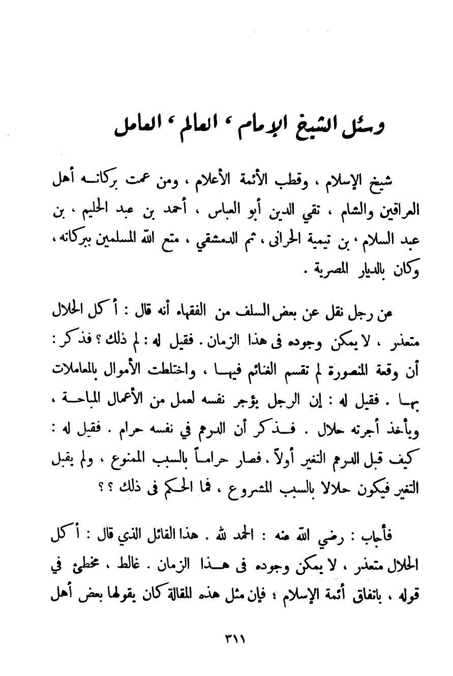عَنْ رَجُلٍ نَقَلَ عَنْ بَعْضِ السَّلَفِ مِنْ الْفُقَهَاءِ أَنَّهُ قَالَ: أَكْلُ الْحَلَالِ مُتَعَذَّرٌ لَا يُمْكِنُ وُجُودُهُ فِي هَذَا الزَّمَانِ. فَقِيلَ لَهُ: لِمَ ذَلِكَ؟ فَذَكَرَ: إنَّ وَقْعَةَ الْمَنْصُورَةِ لَمْ تُقَسَّمْ الْغَنَائِمُ فِيهَا وَاخْتَلَطَتْ الْأَمْوَالُ بِالْمُعَامَلَاتِ بِهَا. فَقِيلَ لَهُ: إنَّ الرَّجُلَ يُؤَجِّرُ نَفْسَهُ لِعَمَلٍ مِنْ الْأَعْمَالِ الْمُبَاحَةِ وَيَأْخُذُ أُجْرَتَهُ حَلَالٌ. فَذَكَرَ إنَّ الدِّرْهَمَ فِي نَفْسِهِ حَرَامٌ. فَقِيلَ لَهُ: كَيْفَ قَبِلَ الدِّرْهَمُ التَّغَيُّرَ أَوَّلًا فَصَارَ حَرَامًا بِالسَّبَبِ الْمَمْنُوعِ وَلَمْ يَقْبَلْ التَّغَيُّرَ فَيَكُونُ حَلَالًا بِالسَّبَبِ الْمَشْرُوعِ فَمَا الْحُكْمُ فِي ذَلِكَ؟ ؟