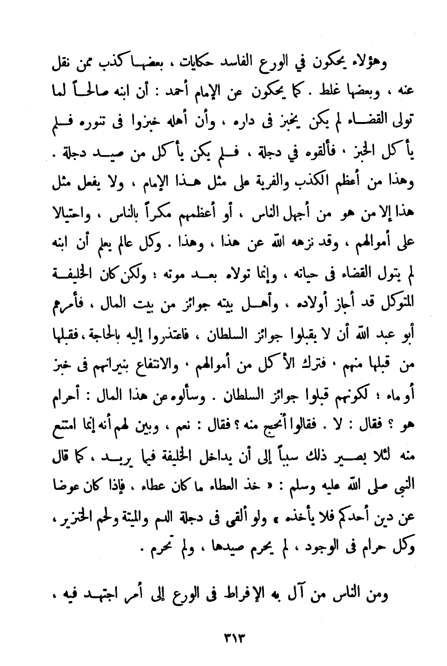 وَهَؤُلَاءِ يَحْكُونَ فِي الْوَرَعِ الْفَاسِدِ حِكَايَاتٍ بَعْضُهَا كَذِبٌ مِمَّنْ نُقِلَ عَنْهُ وَبَعْضُهَا غَلَطٌ. كَمَا يَحْكُونَ عَنْ الْإِمَامِ أَحْمَد: أَنَّ ابْنَهُ صَالِحًا لَمَّا تَوَلَّى الْقَضَاءَ لَمْ يَكُنْ يَخْبِزُ فِي دَارِهِ وَأَنَّ أَهْلَهُ خَبَزُوا فِي تَنُّورِهِ فَلَمْ يَأْكُلْ الْخُبْزَ فَأَلْقَوْهُ فِي دِجْلَةَ فَلَمْ يَكُنْ يَأْكُلُ مِنْ صَيْدِ دِجْلَةَ. وَهَذَا مِنْ أَعْظَمِ الْكَذِبِ وَالْفِرْيَةِ عَلَى مِثْلِ هَذَا الْإِمَامِ وَلَا يَفْعَلُ مِثْلَ هَذَا إلَّا مَنْ هُوَ مِنْ أَجْهَلِ النَّاسِ أَوْ أَعْظَمِهِمْ مَكْرًا بِالنَّاسِ وَاحْتِيَالًا عَلَى أَمْوَالِهِمْ وَقَدْ نَزَّهَهُ اللَّهُ عَنْ هَذَا وَهَذَا. وَكُلُّ عَالِمٍ يَعْلَمُ أَنَّ ابْنَهُ لَمْ يَتَوَلَّ الْقَضَاءَ فِي حَيَاتِهِ وَإِنَّمَا تَوَلَّاهُ بَعْدَ مَوْتِهِ؛ وَلَكِنْ كَانَ الْخَلِيفَةُ الْمُتَوَكِّلُ قَدْ أَجَازَ أَوْلَادَهُ وَأَهْلَ بَيْتِهِ جَوَائِزَ مِنْ بَيْتِ الْمَالِ فَأَمَرَهُمْ أَبُو عَبْدِ اللَّهِ أَنْ لَا يَقْبَلُوا جَوَائِزَ السُّلْطَانِ فَاعْتَذَرُوا إلَيْهِ بِالْحَاجَةِ فَقَبِلَهَا مَنْ قَبِلَهَا مِنْهُمْ فَتَرَكَ الْأَكْلَ مِنْ أَمْوَالِهِمْ وَالِانْتِفَاعَ بِنِيرَانِهِمْ فِي خُبْزٍ أَوْ مَاءٍ؛ لِكَوْنِهِمْ قَبِلُوا جَوَائِزَ السُّلْطَانِ. وَسَأَلُوهُ عَنْ هَذَا الْمَالِ: أَحَرَامٌ هُوَ؟ فَقَالَ: لَا. فَقَالُوا أَنَحُجُّ مِنْهُ؟ فَقَالَ: نَعَمْ وَبَيَّنَ لَهُمْ أَنَّهُ إنَّمَا امْتَنَعَ مِنْهُ لِئَلَّا يَصِيرَ ذَلِكَ سَبَبًا إلَى أَنْ يُدَاخِلَ الْخَلِيفَةَ فِيمَا يُرِيدُ كَمَا قَالَ النَّبِيُّ صَلَّى اللَّهُ عَلَيْهِ وَسَلَّمَ {خُذْ الْعَطَاءَ مَا كَانَ عَطَاءً فَإِذَا كَانَ عِوَضًا عَنْ دِينِ أَحَدِكُمْ فَلَا يَأْخُذْهُ} وَلَوْ أُلْقِيَ فِي دِجْلَةَ الدَّمُ وَالْمَيْتَةُ وَلَحْمُ الْخِنْزِيرِ وَكُلُّ حَرَامٍ فِي الْوُجُودِ لَمْ يَحْرُمْ صَيْدُهَا وَلَمْ تَحْرُمْ. وَمِنْ النَّاسِ مَنْ آلَ بِهِ الْإِفْرَاطُ فِي الْوَرَعِ إلَى أَمْرٍ اجْتَهَدَ فِيهِ