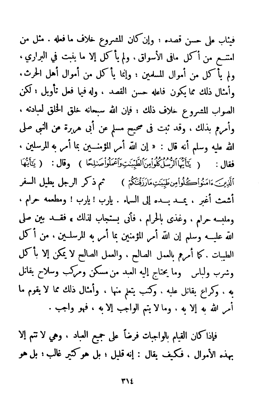 فَيُثَابُ عَلَى حُسْنِ قَصْدِهِ؛ وَإِنْ كَانَ الْمَشْرُوعُ خِلَافَ مَا فَعَلَهُ. مِثْلَ مَنْ امْتَنَعَ مِنْ أَكْلِ مَا فِي الْأَسْوَاقِ وَلَمْ يَأْكُلْ إلَّا مَا يَنْبُتُ فِي الْبَرَارِي وَلَمْ يَأْكُلْ مِنْ أَمْوَالِ الْمُسْلِمِينَ؛ وَإِنَّمَا يَأْكُلُ مِنْ أَمْوَالِ أَهْلِ الْحَرْثِ وَأَمْثَالِ ذَلِكَ مِمَّا يَكُونُ فَاعِلُهُ حَسَنَ الْقَصْدِ وَلَا فِيمَا فَعَلَ تَأْوِيلٌ؛ لَكِنَّ الصَّوَابَ الْمَشْرُوعَ خِلَافُ ذَلِكَ؛ فَإِنَّ اللَّهَ سُبْحَانَهُ خَلَقَ الْخَلْقَ لِعِبَادَتِهِ وَأَمَرَهُمْ بِذَلِكَ وَقَدْ ثَبَتَ فِي صَحِيحِ مُسْلِمٍ عَنْ أَبِي هُرَيْرَةَ عَنْ النَّبِيِّ صَلَّى اللَّهُ عَلَيْهِ وَسَلَّمَ أَنَّهُ قَالَ: {إنَّ اللَّهَ أَمَرَ الْمُؤْمِنِينَ بِمَا أَمَرَ بِهِ الْمُرْسَلِينَ فَقَالَ: {يَا أَيُّهَا الرُّسُلُ كُلُوا مِنَ الطَّيِّبَاتِ وَاعْمَلُوا صَالِحًا} وَقَالَ: {يَا أَيُّهَا الَّذِينَ آمَنُوا كُلُوا مِنْ طَيِّبَاتِ مَا رَزَقْنَاكُمْ} ثُمَّ ذَكَرَ الرَّجُلُ يُطِيلُ السَّفَرَ أَشْعَثَ أَغْبَرَ يَمُدُّ يَدَهُ إلَى السَّمَاءِ. يَا رَبِّ يَا رَبِّ وَمَطْعَمُهُ حَرَامٌ وَمَلْبَسُهُ حَرَامٌ وَغُذِّيَ بِالْحَرَامِ فَأَنَّى يُسْتَجَابُ لِذَلِكَ} فَقَدْ بَيَّنَ صَلَّى اللَّهُ عَلَيْهِ وَسَلَّمَ أَنَّ اللَّهَ أَمَرَ الْمُؤْمِنِينَ بِمَا أَمَرَ بِهِ الْمُرْسَلِينَ مِنْ أَكْلِ الطَّيِّبَاتِ. كَمَا أَمَرَهُمْ بِالْعَمَلِ الصَّالِحِ وَالْعَمَلُ الصَّالِحُ لَا يُمْكِنُ إلَّا بِأَكْلِ وَشُرْبٍ وَلِبَاسٍ. وَمَا يَحْتَاجُ إلَيْهِ الْعَبْدُ مِنْ مَسْكَنٍ وَمَرْكَبٍ وَسِلَاحٍ يُقَاتِلُ بِهِ وَكُرَاعٍ يُقَاتِلُ عَلَيْهِ وَكُتُبٍ يَتَعَلَّمُ مِنْهَا وَأَمْثَالُ ذَلِكَ مِمَّا لَا يَقُومُ مَا أَمَرَ اللَّهُ بِهِ إلَّا بِهِ وَمَا لَا يَتِمُّ الْوَاجِبُ إلَّا بِهِ فَهُوَ وَاجِبٌ. فَإِذَا كَانَ الْقِيَامُ بِالْوَاجِبَاتِ فَرْضًا عَلَى جَمِيعِ الْعِبَادِ وَهِيَ لَا تَتِمُّ إلَّا بِهَذِهِ الْأَمْوَالِ فَكَيْفَ يُقَالُ: إنَّهُ قَلِيلٌ؛ بَلْ هُوَ كَثِيرٌ غَالِبٌ؛ بَلْ هُوَ