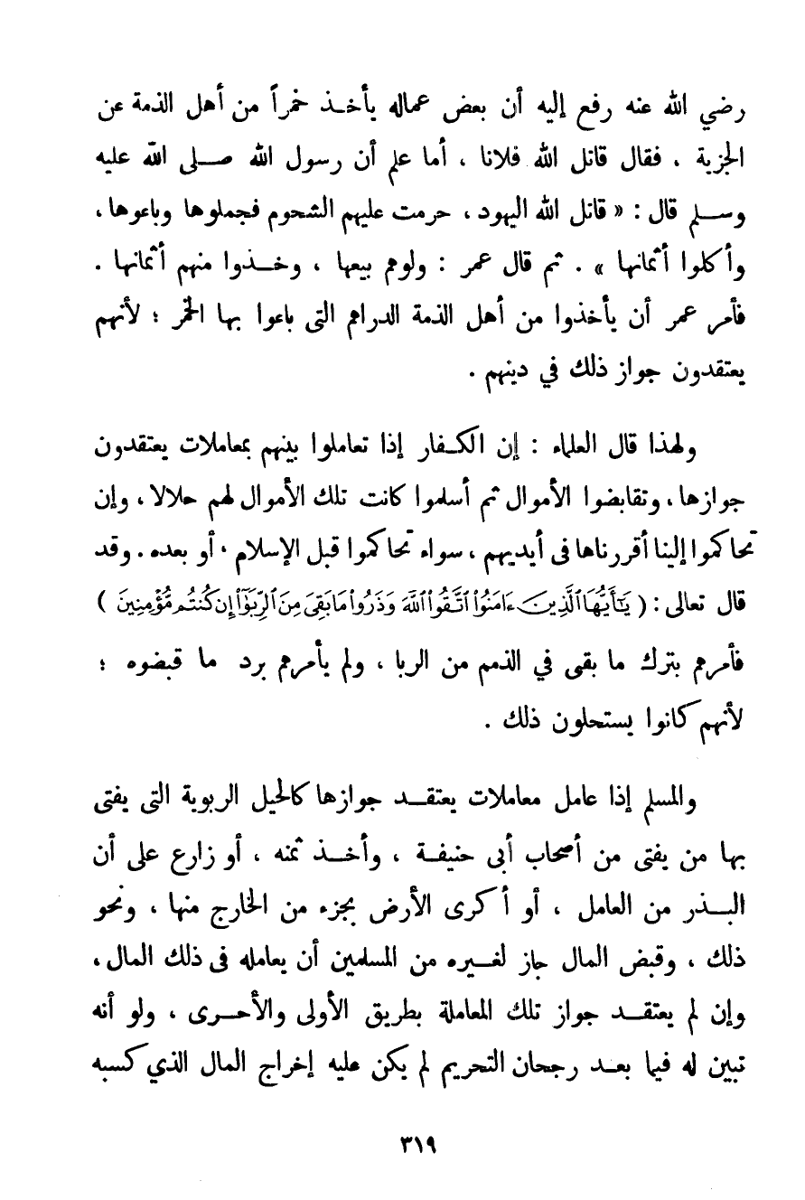 رَضِيَ اللَّهُ عَنْهُ رُفِعَ إلَيْهِ أَنَّ بَعْضَ عُمَّالِهِ يَأْخُذُ خَمْرًا مِنْ أَهْلِ الذِّمَّةِ عَنْ الْجِزْيَةِ فَقَالَ قَاتَلَ اللَّهُ فُلَانًا أَمَا عَلِمَ أَنَّ رَسُولَ اللَّهِ صَلَّى اللَّهُ عَلَيْهِ وَسَلَّمَ قَالَ: {قَاتَلَ اللَّهُ الْيَهُودَ حُرِّمَتْ عَلَيْهِمْ الشُّحُومُ فَجَمَّلُوهَا وَبَاعُوهَا وَأَكَلُوا أَثْمَانَهَا} . ثُمَّ قَالَ عُمَرُ: وَلُّوهُمْ بَيْعَهَا وَخُذُوا مِنْهُمْ أَثْمَانَهَا. فَأَمَرَ عُمَرُ أَنْ يَأْخُذُوا مِنْ أَهْلِ الذِّمَّةِ الدَّرَاهِمَ الَّتِي بَاعُوا بِهَا الْخَمْرَ؛ لِأَنَّهُمْ يَعْتَقِدُونَ جَوَازَ ذَلِكَ فِي دِينِهِمْ. وَلِهَذَا قَالَ الْعُلَمَاءُ: إنَّ الْكُفَّارَ إذَا تَعَامَلُوا بَيْنَهُمْ بِمُعَامَلَاتٍ يَعْتَقِدُونَ جَوَازَهَا وَتَقَابَضُوا الْأَمْوَالَ ثُمَّ أَسْلَمُوا كَانَتْ تِلْكَ الْأَمْوَالُ لَهُمْ حَلَالًا وَإِنْ تَحَاكَمُوا إلَيْنَا أَقْرَرْنَاهَا فِي أَيْدِيهِمْ سَوَاءٌ تَحَاكَمُوا قَبْلَ الْإِسْلَامِ أَوْ بَعْدَهُ. وَقَدْ قَالَ تَعَالَى: {يَا أَيُّهَا الَّذِينَ آمَنُوا اتَّقُوا اللَّهَ وَذَرُوا مَا بَقِيَ مِنَ الرِّبَا إنْ كُنْتُمْ مُؤْمِنِينَ} فَأَمَرَهُمْ بِتَرْكِ مَا بَقِيَ فِي الذِّمَمِ مِنْ الرِّبَا وَلَمْ يَأْمُرْهُمْ بِرَدِّ مَا قَبَضُوهُ لِأَنَّهُمْ كَانُوا يَسْتَحِلُّونَ ذَلِكَ.