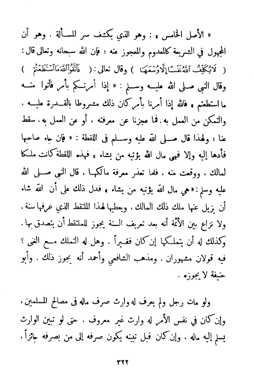 الْأَصْلَ الْخَامِسَ: وَهُوَ الَّذِي يَكْشِفُ سِرَّ الْمَسْأَلَةِ وَهُوَ أَنَّ الْمَجْهُولَ فِي الشَّرِيعَةِ كَالْمَعْدُومِ وَالْمَعْجُوزِ عَنْهُ؛ فَإِنَّ اللَّهَ سُبْحَانَهُ وَتَعَالَى قَالَ: {لَا يُكَلِّفُ اللَّهُ نَفْسًا إلَّا وُسْعَهَا} وَقَالَ تَعَالَى: {فَاتَّقُوا اللَّهَ مَا اسْتَطَعْتُمْ} وَقَالَ النَّبِيُّ صَلَّى اللَّهُ عَلَيْهِ وَسَلَّمَ {إذَا أَمَرْتُكُمْ بِأَمْرٍ فَأْتُوا مِنْهُ مَا اسْتَطَعْتُمْ} فَاَللَّهُ إذَا أَمَرَنَا بِأَمْرٍ كَانَ ذَلِكَ مَشْرُوطًا بِالْقُدْرَةِ عَلَيْهِ وَالتَّمَكُّنِ مِنْ الْعَمَلِ بِهِ. فَمَا عَجَزْنَا عَنْ مَعْرِفَتِهِ أَوْ عَنْ الْعَمَلِ بِهِ سَقَطَ عَنَّا؛ وَلِهَذَا {قَالَ صَلَّى اللَّهُ عَلَيْهِ وَسَلَّمَ فِي اللُّقَطَةِ: فَإِنْ جَاءَ صَاحِبُهَا فَأَدَّاهَا إلَيْهِ وَإِلَّا فَهِيَ مَالُ اللَّهِ يُؤْتِيهِ مَنْ يَشَاءُ} فَهَذِهِ اللُّقَطَةُ كَانَتْ مِلْكًا لِمَالِكٍ وَوَقَعَتْ مِنْهُ فَلَمَّا تَعَذَّرَ مَعْرِفَةُ مَالِكِهَا قَالَ النَّبِيُّ صَلَّى اللَّهُ عَلَيْهِ وَسَلَّمَ {هِيَ مَالُ اللَّهِ يُؤْتِيهِ مَنْ يَشَاءُ} فَدَلَّ ذَلِكَ عَلَى أَنَّ اللَّهَ شَاءَ أَنْ يُزِيلَ عَنْهَا مِلْكَ ذَلِكَ الْمَالِكِ وَيُعْطِيَهَا لِهَذَا الْمُلْتَقِطِ الَّذِي عَرَّفَهَا سَنَةً. وَلَا نِزَاعَ بَيْنَ الْأَئِمَّةِ أَنَّهُ بَعْدَ تَعْرِيفِ السَّنَةِ يَجُوزُ لِلْمُلْتَقِطِ أَنْ يَتَصَدَّقَ بِهَا. وَكَذَلِكَ لَهُ أَنْ يَتَمَلَّكَهَا إنْ كَانَ فَقِيرًا. وَهَلْ لَهُ التَّمَلُّكُ مَعَ الْغِنَى؟ . فِيهِ قَوْلَانِ مَشْهُورَانِ. وَمَذْهَبُ الشَّافِعِيِّ وَأَحْمَد أَنَّهُ يَجُوزُ ذَلِكَ. وَأَبُو حَنِيفَةَ لَا يُجَوِّزُهُ. وَلَوْ مَاتَ رَجُلٌ وَلَمْ يُعْرَفْ لَهُ وَارِثٌ صُرِفَ مَالُهُ فِي مَصَالِحِ الْمُسْلِمِينَ وَإِنْ كَانَ فِي نَفْسِ الْأَمْرِ لَهُ وَارِثٌ غَيْرُ مَعْرُوفٍ حَتَّى لَوْ تَبَيَّنَ الْوَارِثُ يُسَلِّمُ إلَيْهِ مَالَهُ وَإِنْ كَانَ قَبْلَ تَبَيُّنِهِ يَكُونُ صَرْفُهُ إلَى مَنْ يَصْرِفُهُ جَائِزًا