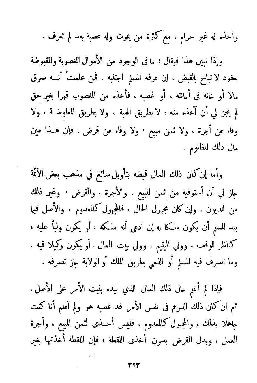 وَأَخْذُهُ لَهُ غَيْرَ حَرَامٍ مَعَ كَثْرَةِ مَنْ يَمُوتُ وَلَهُ عَصَبَةٌ بَعْدُ لَمْ تُعْرَفْ. وَإِذَا تَبَيَّنَ هَذَا فَيُقَالُ: مَا فِي الْوُجُودِ مِنْ الْأَمْوَالِ الْمَغْصُوبَةِ وَالْمَقْبُوضَةِ بِعُقُودٍ لَا تُبَاحُ بِالْقَبْضِ إنْ عَرَفَهُ الْمُسْلِمُ اجْتَنَبَهُ. فَمَنْ عَلِمْت أَنَّهُ سَرَقَ مَالًا أَوْ خَانَهُ فِي أَمَانَتِهِ أَوْ غَصَبَهُ فَأَخَذَهُ مِنْ الْمَغْصُوبِ قَهْرًا بِغَيْرِ حَقٍّ لَمْ يَجُزْ لِي أَنْ آخُذَهُ مِنْهُ؛ لَا بِطَرِيقِ الْهِبَةِ وَلَا بِطَرِيقِ الْمُعَاوَضَةِ وَلَا وَفَاءً عَنْ أُجْرَةٍ وَلَا ثَمَنَ مَبِيعٍ وَلَا وَفَاءً عَنْ قَرْضٍ فَإِنَّ هَذَا عَيْنُ مَالِ ذَلِكَ الْمَظْلُومِ. وَأَمَّا إنْ كَانَ ذَلِكَ الْمَالُ قَبَضَهُ بِتَأْوِيلٍ سَائِغٍ فِي مَذْهَبِ بَعْضِ الْأَئِمَّةِ جَازَ لِي أَنْ أَسْتَوْفِيَهُ مِنْ ثَمَنِ الْمَبِيعِ وَالْأُجْرَةِ وَالْقَرْضِ وَغَيْرِ ذَلِكَ مِنْ الدُّيُونِ. وَإِنْ كَانَ مَجْهُولَ الْحَالِ فَالْمَجْهُولُ كَالْمَعْدُومِ وَالْأَصْلُ فِيمَا بِيَدِ الْمُسْلِمِ أَنْ يَكُونَ مِلْكًا لَهُ إنْ ادَّعَى أَنَّهُ مَلَكَهُ أَوْ يَكُونَ وَلِيًّا عَلَيْهِ؛ كَنَاظِرِ الْوَقْفِ وَوَلِيِّ الْيَتِيمِ وَوَلِيِّ بَيْتِ الْمَالِ. أَوْ يَكُونَ وَكِيلًا فِيهِ. وَمَا تَصَرَّفَ فِيهِ الْمُسْلِمُ أَوْ الذِّمِّيُّ بِطَرِيقِ الْمِلْكِ أَوْ الْوِلَايَةِ جَازَ تَصَرُّفُهُ. فَإِذَا لَمْ أَعْلَمْ حَالَ ذَلِكَ الْمَالِ الَّذِي بِيَدِهِ بَنَيْت الْأَمْرَ عَلَى الْأَصْلِ ثُمَّ إنْ كَانَ ذَلِكَ الدِّرْهَمُ فِي نَفْسِ الْأَمْرِ قَدْ غَصَبَهُ هُوَ وَلَمْ أَعْلَمْ أَنَا كُنْت جَاهِلًا بِذَلِكَ وَالْمَجْهُولُ كَالْمَعْدُومِ فَلَيْسَ أَخْذِي لِثَمَنِ الْمَبِيعِ وَأُجْرَةِ الْعَمَلِ وَبَدَلِ الْقَرْضِ بِدُونِ أَخْذِي اللُّقَطَةَ؛ فَإِنَّ اللُّقَطَةَ أَخَذْتهَا بِغَيْرِ