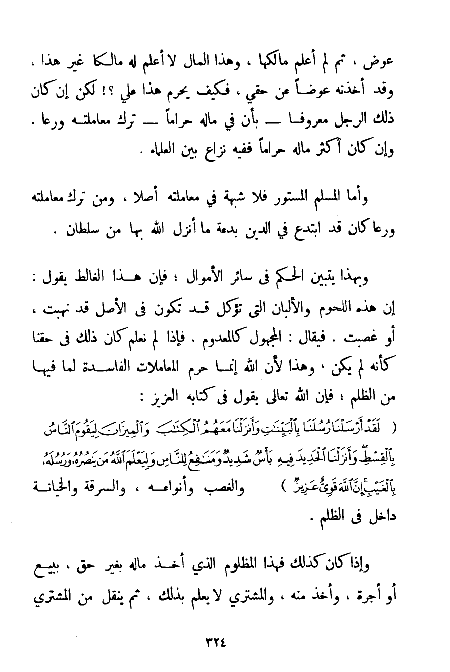 عِوَضٍ ثُمَّ لَمْ أَعْلَمْ مَالِكِهَا وَهَذَا الْمَالُ لَا أَعْلَمُ لَهُ مَالِكًا غَيْرَ هَذَا وَقَدْ أَخَذْته عِوَضًا عَنْ حَقِّي فَكَيْفَ يَحْرُمُ هَذَا عَلَيَّ لَكِنْ إنْ كَانَ ذَلِكَ الرَّجُلُ مَعْرُوفًا - بِأَنَّ فِي مَالِهِ حَرَامًا - تُرِكَ مُعَامَلَتُهُ وَرَعًا. وَإِنْ كَانَ أَكْثَرُ مَالِهِ حَرَامًا فَفِيهِ نِزَاعٌ بَيْنَ الْعُلَمَاءِ. وَأَمَّا الْمُسْلِمُ الْمَسْتُورُ فَلَا شُبْهَةَ فِي مُعَامَلَتِهِ أَصْلًا وَمَنْ تَرَكَ مُعَامَلَتَهُ وَرَعًا كَانَ قَدْ ابْتَدَعَ فِي الدِّينِ بِدْعَةً مَا أَنْزَلَ اللَّهُ بِهَا مِنْ سُلْطَانٍ. وَبِهَذَا يَتَبَيَّنُ الْحُكْمُ فِي سَائِرِ الْأَمْوَالِ؛ فَإِنَّ هَذَا الغالط يَقُولُ: إنَّ هَذِهِ اللُّحُومَ وَالْأَلْبَانَ الَّتِي تُؤْكَلُ قَدْ تَكُونُ فِي الْأَصْلِ قَدْ نُهِبَتْ أَوْ غُصِبَتْ. فَيُقَالُ: الْمَجْهُولُ كَالْمَعْدُومِ فَإِذَا لَمْ نَعْلَمْ كَانَ ذَلِكَ فِي حَقِّنَا كَأَنَّهُ لَمْ يَكُنْ وَهَذَا لِأَنَّ اللَّهَ إنَّمَا حَرَّمَ الْمُعَامَلَاتِ الْفَاسِدَةَ لِمَا فِيهَا مِنْ الظُّلْمِ؛ فَإِنَّ اللَّهَ تَعَالَى يَقُولُ فِي كِتَابِهِ الْعَزِيزِ: {لَقَدْ أَرْسَلْنَا رُسُلَنَا بِالْبَيِّنَاتِ وَأَنْزَلْنَا مَعَهُمُ الْكِتَابَ وَالْمِيزَانَ لِيَقُومَ النَّاسُ بِالْقِسْطِ وَأَنْزَلْنَا الْحَدِيدَ فِيهِ بَأْسٌ شَدِيدٌ وَمَنَافِعُ لِلنَّاسِ وَلِيَعْلَمَ اللَّهُ مَنْ يَنْصُرُهُ وَرُسُلَهُ بِالْغَيْبِ إنَّ اللَّهَ قَوِيٌّ عَزِيزٌ} وَالْغَصْبُ وَأَنْوَاعُهُ وَالسَّرِقَةُ وَالْخِيَانَةُ دَاخِلٌ فِي الظُّلْمِ. وَإِذَا كَانَ كَذَلِكَ فَهَذَا الْمَظْلُومُ الَّذِي أُخِذَ مَالُهُ بِغَيْرِ حَقٍّ بِبَيْعٍ أَوْ أُجْرَةٍ وَأُخِذَ مِنْهُ وَالْمُشْتَرِي لَا يَعْلَمُ بِذَلِكَ ثُمَّ يُنْقَلُ مِنْ الْمُشْتَرِي