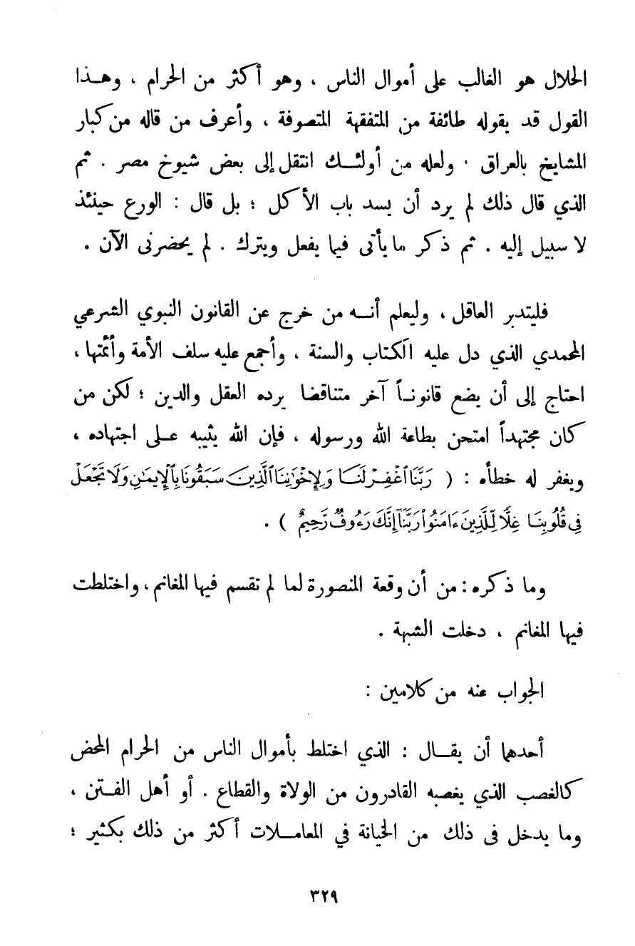 الْحَلَالُ هُوَ الْغَالِبُ عَلَى أَمْوَالِ النَّاسِ وَهُوَ أَكْثَرُ مِنْ الْحَرَامِ وَهَذَا الْقَوْلُ قَدْ يَقُولُهُ طَائِفَةٌ مِنْ الْمُتَفَقِّهَةِ الْمُتَصَوِّفَةِ وَأَعْرِفُ مَنْ قَالَهُ مِنْ كِبَارِ الْمَشَايِخِ بِالْعِرَاقِ وَلَعَلَّهُ مِنْ أُولَئِكَ انْتَقَلَ إلَى بَعْضِ شُيُوخِ مِصْرَ. ثُمَّ الَّذِي قَالَ ذَلِكَ لَمْ يُرِدْ أَنْ يَسُدَّ بَابَ الْأَكْلِ؛ بَلْ قَالَ: الْوَرَعُ حِينَئِذٍ لَا سَبِيلَ إلَيْهِ. ثُمَّ ذَكَرَ مَا يَأْتِي فِيمَا يَفْعَلُ وَيَتْرُكُ. لَمْ يَحْضُرْنِي الْآنَ. فَلْيَتَدَبَّرْ الْعَاقِلُ وَلْيَعْلَمْ أَنَّهُ مَنْ خَرَجَ عَنْ الْقَانُونِ النَّبَوِيِّ الشَّرْعِيِّ الْمُحَمَّدِيِّ الَّذِي دَلَّ عَلَيْهِ الْكِتَابُ وَالسُّنَّةُ وَأَجْمَعَ عَلَيْهِ سَلَفُ الْأُمَّةِ وَأَئِمَّتُهَا احْتَاجَ إلَى أَنْ يَضَعَ قَانُونًا آخَرَ مُتَنَاقِضًا يَرُدُّهُ الْعَقْلُ وَالدِّينُ؛ لَكِنْ مَنْ كَانَ مُجْتَهِدًا اُمْتُحِنَ بِطَاعَةِ اللَّهِ وَرَسُولِهِ فَإِنَّ اللَّهَ يُثِيبُهُ عَلَى اجْتِهَادِهِ وَيَغْفِرُ لَهُ خَطَأَهُ: {رَبَّنَا اغْفِرْ لَنَا وَلِإِخْوَانِنَا الَّذِينَ سَبَقُونَا بِالْإِيمَانِ وَلَا تَجْعَلْ فِي قُلُوبِنَا غِلًّا لِلَّذِينَ آمَنُوا رَبَّنَا إنَّكَ رَءُوفٌ رَحِيمٌ} .