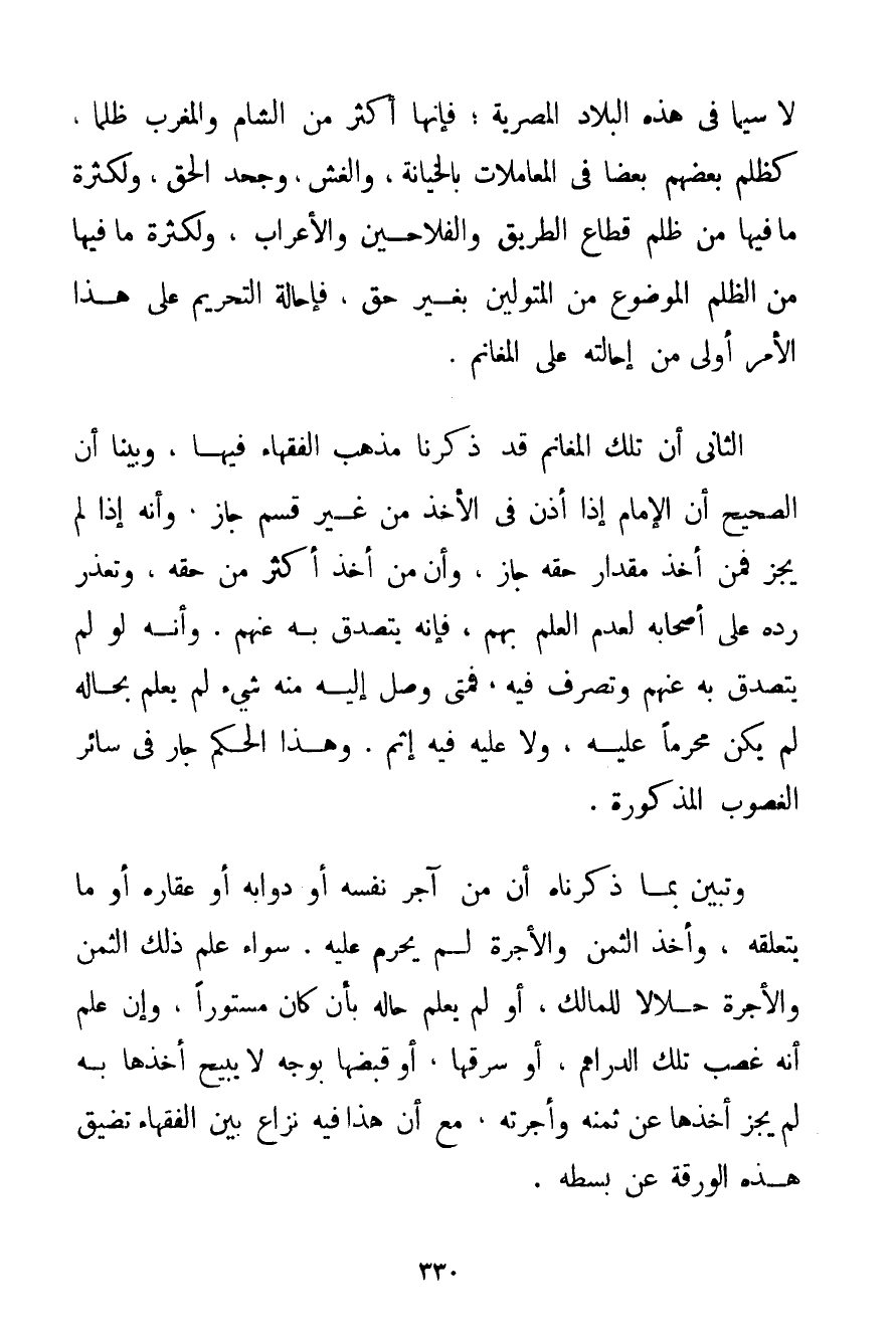 لَا سِيَّمَا فِي هَذِهِ الْبِلَادِ الْمِصْرِيَّةِ؛ فَإِنَّهَا أَكْثَرُ مِنْ الشَّامِ وَالْمَغْرِبِ ظُلْمًا كَظُلْمِ بَعْضِهِمْ بَعْضًا فِي الْمُعَامَلَاتِ بِالْخِيَانَةِ وَالْغِشِّ وَجَحْدِ الْحَقِّ وَلِكَثْرَةِ مَا فِيهَا مِنْ ظُلْمِ قُطَّاعِ الطَّرِيقِ وَالْفَلَّاحِينَ وَالْأَعْرَابِ وَلِكَثْرَةِ مَا فِيهَا مِنْ الظُّلْمِ الْمَوْضُوعِ مِنْ الْمُتَوَلِّينَ بِغَيْرِ حَقٍّ فَإِحَالَةُ التَّحْرِيمِ عَلَى هَذَا الْأَمْرِ أَوْلَى مِنْ إحَالَتِهِ عَلَى الْمَغَانِمِ. الثَّانِي أَنَّ تِلْكَ الْمَغَانِمِ قَدْ ذَكَرْنَا مَذْهَبَ الْفُقَهَاءِ فِيهَا وَبَيَّنَّا أَنَّ الصَّحِيحَ أَنَّ الْإِمَامَ إذَا أَذِنَ فِي الْأَخْذِ مِنْ غَيْرِ قَسْمٍ جَازَ. وَأَنَّهُ إذَا لَمْ يَجُزْ فَمَنْ أَخَذَ مِقْدَارَ حَقِّهِ جَازَ وَأَنَّ مَنْ أَخَذَ أَكْثَرَ مِنْ حَقِّهِ وَتَعَذَّرَ رَدُّهُ عَلَى أَصْحَابِهِ لِعَدَمِ الْعِلْمِ بِهِمْ فَإِنَّهُ يَتَصَدَّقُ بِهِ عَنْهُمْ. وَأَنَّهُ لَوْ لَمْ يَتَصَدَّقْ بِهِ عَنْهُمْ وَتَصَرَّفَ فِيهِ فَمَتَى وَصَلَ إلَيْهِ مِنْهُ شَيْءٌ لَمْ يَعْلَمْ بِحَالِهِ لَمْ يَكُنْ مُحَرَّمًا عَلَيْهِ وَلَا عَلَيْهِ فِيهِ إثْمٌ. وَهَذَا الْحُكْمُ جَازَ فِي سَائِرِ الغصوب الْمَذْكُورَةِ. وَتَبَيَّنَ بِمَا ذَكَرْنَاهُ أَنَّ مَنْ آجَرَ نَفْسَهُ أَوْ دَوَابَّهُ أَوْ عَقَارَهُ أَوْ مَا يَتَعَلَّقُهُ وَأَخَذَ الثَّمَنَ وَالْأُجْرَةَ لَمْ يَحْرُمْ عَلَيْهِ. سَوَاءٌ عَلِمَ ذَلِكَ الثَّمَنَ وَالْأُجْرَةَ حَلَالًا لِلْمَالِكِ أَوْ لَمْ يَعْلَمْ حَالَهُ بِأَنْ كَانَ مَسْتُورًا وَإِنْ عَلِمَ أَنَّهُ غَصَبَ تِلْكَ الدَّرَاهِمَ أَوْ سَرَقَهَا أَوْ قَبَضَهَا بِوَجْهٍ لَا يُبِيحُ أَخْذَهَا بِهِ لَمْ يَجُزْ أَخْذُهَا عَنْ ثَمَنِهِ وَأُجْرَتِهِ مَعَ أَنَّ هَذَا فِيهِ نِزَاعٌ بَيْنَ الْفُقَهَاءِ تَضِيقُ هَذِهِ الْوَرَقَةُ عَنْ بَسْطِهِ.