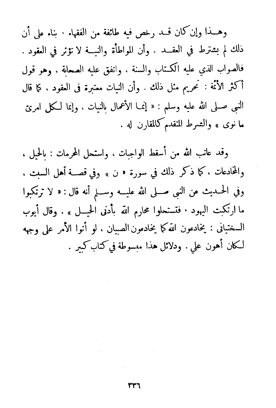 وَهَذَا وَإِنْ كَانَ قَدْ رَخَّصَ فِيهِ طَائِفَةٌ مِنْ الْفُقَهَاءِ بِنَاءً عَلَى أَنَّ ذَلِكَ لَمْ يُشْتَرَطْ فِي الْعَقْدِ وَأَنَّ الْمُوَاطَأَةَ وَالنِّيَّةَ لَا تُؤَثِّرُ فِي الْعُقُودِ. فَالصَّوَابُ الَّذِي عَلَيْهِ الْكِتَابُ وَالسُّنَّةُ وَاتَّفَقَ عَلَيْهِ الصَّحَابَةُ وَهُوَ قَوْلُ أَكْثَرِ الْأَئِمَّةِ: تَحْرِيمُ مِثْلِ ذَلِكَ. وَأَنَّ النِّيَّاتِ مُعْتَبَرَةٌ فِي الْعُقُودِ كَمَا قَالَ النَّبِيُّ صَلَّى اللَّهُ عَلَيْهِ وَسَلَّمَ {إنَّمَا الْأَعْمَالُ بِالنِّيَّاتِ وَإِنَّمَا لِكُلِّ امْرِئٍ مَا نَوَى} وَالشَّرْطُ الْمُتَقَدِّمُ كَالْمُقَارِنِ لَهُ. وَقَدْ عَاتَبَ اللَّهُ مَنْ أَسْقَطَ الْوَاجِبَاتِ وَاسْتَحَلَّ الْمُحَرَّمَاتِ: بِالْحِيَلِ وَالْمُخَادَعَاتِ كَمَا ذَكَرَ ذَلِكَ فِي سُورَةِ " ن " وَفِي قِصَّةِ أَهْلِ السَّبْتِ وَفِي الْحَدِيثِ عَنْ النَّبِيِّ صَلَّى اللَّهُ عَلَيْهِ وَسَلَّمَ أَنَّهُ قَالَ: {لَا تَرْتَكِبُوا مَا ارْتَكَبَتْ الْيَهُودُ فَتَسْتَحِلُّوا مَحَارِمَ اللَّهِ بِأَدْنَى الْحِيَلِ} . وَقَالَ أَيُّوبُ السختياني: يُخَادِعُونَ اللَّهَ كَمَا يُخَادِعُونَ الصِّبْيَانَ لَوْ أَتَوْا الْأَمْرَ عَلَى وَجْهِهِ لَكَانَ أَهْوَنَ عَلَيَّ. وَدَلَائِلُ هَذَا مَبْسُوطَةٌ فِي كِتَابٍ كَبِيرٍ.