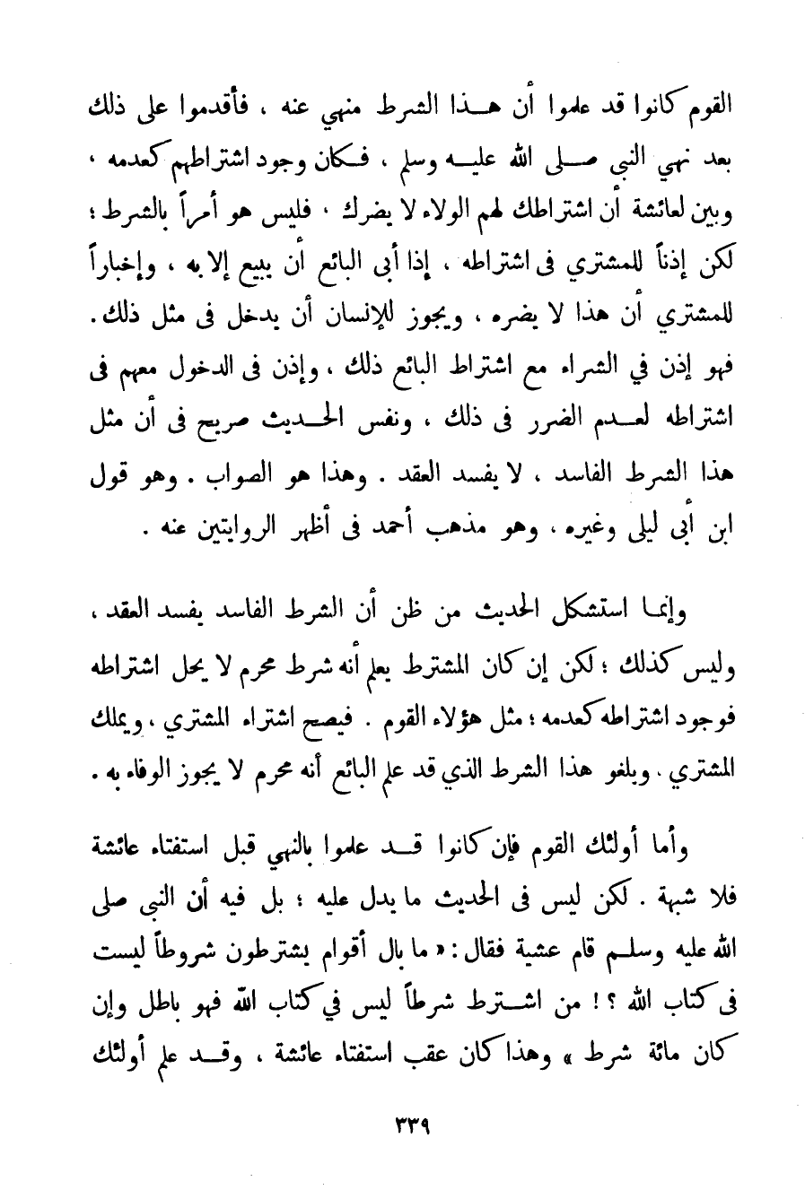 الْقَوْمَ كَانُوا قَدْ عَلِمُوا أَنَّ هَذَا الشَّرْطَ مَنْهِيٌّ عَنْهُ فَأَقْدَمُوا عَلَى ذَلِكَ بَعْدَ نَهْيِ النَّبِيِّ صَلَّى اللَّهُ عَلَيْهِ وَسَلَّمَ فَكَانَ وُجُودُ اشْتِرَاطِهِمْ كَعَدَمِهِ وَبَيَّنَ لِعَائِشَةَ أَنَّ اشْتِرَاطَك لَهُمْ الْوَلَاءَ لَا يَضُرُّك فَلَيْسَ هُوَ أَمْرًا بِالشَّرْطِ؛ لَكِنْ إذْنًا لِلْمُشْتَرِي فِي اشْتِرَاطِهِ إذَا أَبَى الْبَائِعُ أَنْ يَبِيعَ إلَّا بِهِ وَإِخْبَارًا لِلْمُشْتَرِي أَنَّ هَذَا لَا يَضُرُّهُ وَيَجُوزُ لِلْإِنْسَانِ أَنْ يَدْخُلَ فِي مِثْلِ ذَلِكَ. فَهُوَ إذْنٌ فِي الشِّرَاءِ مَعَ اشْتِرَاطِ الْبَائِعِ ذَلِكَ وَإِذْنٌ فِي الدُّخُولِ مَعَهُمْ فِي اشْتِرَاطِهِ لِعَدَمِ الضَّرَرِ فِي ذَلِكَ وَنَفْسُ الْحَدِيثِ صَرِيحٌ فِي أَنَّ مِثْلَ هَذَا الشَّرْطِ الْفَاسِدِ لَا يُفْسِدُ الْعَقْدَ. وَهَذَا هُوَ الصَّوَابُ. وَهُوَ قَوْلُ ابْنِ أَبِي لَيْلَى وَغَيْرِهِ وَهُوَ مَذْهَبُ أَحْمَد فِي أَظْهَرِ الرِّوَايَتَيْنِ عَنْهُ. وَإِنَّمَا اسْتَشْكَلَ الْحَدِيثَ مَنْ ظَنَّ أَنَّ الشَّرْطَ الْفَاسِدَ يُفْسِدُ الْعَقْدَ وَلَيْسَ كَذَلِكَ؛ لَكِنْ إنْ كَانَ الْمُشْتَرِطُ يَعْلَمُ أَنَّهُ شَرْطٌ مُحَرَّمٌ لَا يَحِلُّ اشْتِرَاطُهُ فَوُجُودُ اشْتِرَاطِهِ كَعَدَمِهِ؛ مِثْلَ هَؤُلَاءِ الْقَوْمِ. فَيَصِحُّ اشْتِرَاءُ الْمُشْتَرِي وَيَمْلِكُ الْمُشْتَرِي وَبِلَغْوِ هَذَا الشَّرْطِ الَّذِي قَدْ عَلِمَ الْبَائِعُ أَنَّهُ مُحَرَّمٌ لَا يَجُوزُ الْوَفَاءُ بِهِ. وَأَمَّا أُولَئِكَ الْقَوْمُ فَإِنْ كَانُوا قَدْ عَلِمُوا بِالنَّهْيِ قَبْلَ اسْتِفْتَاءِ عَائِشَةَ فَلَا شُبْهَةَ. لَكِنْ لَيْسَ فِي الْحَدِيثِ مَا يَدُلُّ عَلَيْهِ؛ بَلْ فِيهِ {أَنَّ النَّبِيَّ صَلَّى اللَّهُ عَلَيْهِ وَسَلَّمَ قَامَ عَشِيَّةً فَقَالَ: مَا بَالُ أَقْوَامٍ يَشْتَرِطُونَ شُرُوطًا لَيْسَتْ فِي كِتَابِ اللَّهِ مَنْ اشْتَرَطَ شَرْطًا لَيْسَ فِي كِتَابِ اللَّهِ فَهُوَ بَاطِلٌ وَإِنْ كَانَ مِائَةَ شَرْطٍ} وَهَذَا كَانَ عَقِبَ اسْتِفْتَاءِ عَائِشَةَ وَقَدْ عَلِمَ أُولَئِكَ