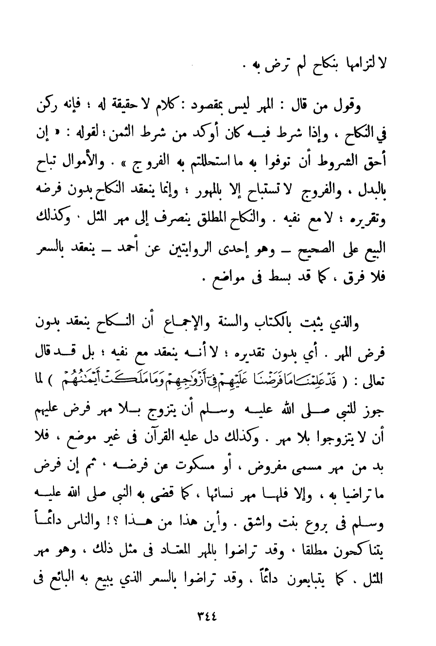 لِالْتِزَامِهَا بِنِكَاحٍ لَمْ تَرْضَ بِهِ. وَقَوْلُ مَنْ قَالَ: الْمَهْرُ لَيْسَ بِمَقْصُودِ: كَلَامٌ لَا حَقِيقَةَ لَهُ؛ فَإِنَّهُ رُكْنٌ فِي النِّكَاحِ وَإِذَا شُرِطَ فِيهِ كَانَ أَوْكَدَ مِنْ شَرْطِ الثَّمَنِ؛ لِقَوْلِهِ: {إنَّ أَحَقَّ الشُّرُوطِ أَنْ تُوَفُّوا بِهِ مَا اسْتَحْلَلْتُمْ بِهِ الْفُرُوجَ} . وَالْأَمْوَالُ تُبَاحُ بِالْبَدَلِ وَالْفُرُوجُ لَا تُسْتَبَاحُ إلَّا بِالْمُهُورِ؛ وَإِنَّمَا يَنْعَقِدُ النِّكَاحُ بِدُونِ فَرْضِهِ وَتَقْرِيرِهِ؛ لَا مَعَ نَفْيِهِ. وَالنِّكَاحُ الْمُطْلَقُ يَنْصَرِفُ إلَى مَهْرِ الْمِثْلِ وَكَذَلِكَ الْبَيْعُ عَلَى الصَّحِيحِ - وَهُوَ إحْدَى الرِّوَايَتَيْنِ عَنْ أَحْمَد - يَنْعَقِدُ بِالسِّعْرِ فَلَا فَرْقَ كَمَا قَدْ بُسِطَ فِي مَوَاضِعَ. وَاَلَّذِي يَثْبُتُ بِالْكِتَابِ وَالسُّنَّةِ وَالْإِجْمَاعِ أَنَّ النِّكَاحَ يَنْعَقِدُ بِدُونِ فَرْضِ الْمَهْرِ. أَيْ بِدُونِ تَقْدِيرِهِ؛ لَا أَنَّهُ يَنْعَقِدُ مَعَ نَفْيِهِ؛ بَلْ قَدْ قَالَ تَعَالَى: {قَدْ عَلِمْنَا مَا فَرَضْنَا عَلَيْهِمْ فِي أَزْوَاجِهِمْ وَمَا مَلَكَتْ أَيْمَانُهُمْ} لَمَّا جَوَّزَ لِلنَّبِيِّ صَلَّى اللَّهُ عَلَيْهِ وَسَلَّمَ أَنْ يَتَزَوَّجَ بِلَا مَهْرٍ فُرِضَ عَلَيْهِمْ أَنْ لَا يَتَزَوَّجُوا بِلَا مَهْرٍ. وَكَذَلِكَ دَلَّ عَلَيْهِ الْقُرْآنُ فِي غَيْرِ مَوْضِعٍ فَلَا بُدَّ مِنْ مَهْرٍ مُسَمًّى مَفْرُوضٍ أَوْ مَسْكُوتٍ عَنْ فَرْضِهِ ثُمَّ إنْ فُرِضَ مَا تَرَاضَيَا بِهِ وَإِلَّا فَلَهَا مَهْرُ نِسَائِهَا كَمَا قَضَى بِهِ النَّبِيُّ صَلَّى اللَّهُ عَلَيْهِ وَسَلَّمَ فِي بروع بِنْتِ وَاشِقٍ. وَأَيْنَ هَذَا مِنْ هَذَا وَالنَّاسُ دَائِمًا يَتَنَاكَحُونَ مُطْلَقًا وَقَدْ تَرَاضَوْا بِالْمَهْرِ الْمُعْتَادِ فِي مِثْلِ ذَلِكَ وَهُوَ مَهْرُ الْمِثْلِ كَمَا يَتَبَايَعُونَ دَائِمًا وَقَدْ تَرَاضَوْا بِالسِّعْرِ الَّذِي يَبِيعُ بِهِ الْبَائِعُ فِي