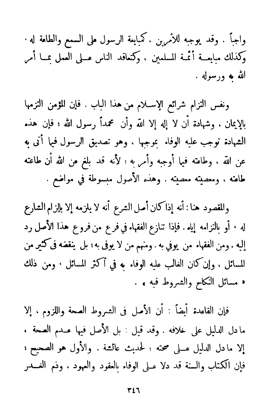 وَاجِبًا. وَقَدْ يُوجِبُهُ لِلْأَمْرَيْنِ كَمُبَايَعَةِ الرَّسُولِ عَلَى السَّمْعِ وَالطَّاعَةِ لَهُ وَكَذَلِكَ مُبَايَعَةُ أَئِمَّةِ الْمُسْلِمِينَ وَكَتَعَاقُدِ النَّاسِ عَلَى الْعَمَلِ بِمَا أَمَرَ اللَّهُ بِهِ وَرَسُولُهُ. وَنَفْسُ الْتِزَامِ شَرَائِعِ الْإِسْلَامِ مِنْ هَذَا الْبَابِ. فَإِنَّ الْمُؤْمِنَ الْتَزَمَهَا بِالْإِيمَانِ وَشَهَادَةِ أَنْ لَا إلَهَ إلَّا اللَّهُ وَأَنَّ مُحَمَّدًا رَسُولُ اللَّهِ؛ فَإِنَّ هَذِهِ الشَّهَادَةَ تُوجِبُ عَلَيْهِ الْوَفَاءَ بِمُوجِبِهَا وَهُوَ تَصْدِيقُ الرَّسُولِ فِيمَا أَتَى بِهِ عَنْ اللَّهِ وَطَاعَتِهِ فِيمَا أَوْجَبَهُ وَأَمَرَ بِهِ؛ لِأَنَّهُ قَدْ بَلَّغَ عَنْ اللَّهِ أَنَّ طَاعَتَهُ طَاعَتُهُ وَمَعْصِيَتَهُ مَعْصِيَتُهُ. وَهَذِهِ الْأُصُولُ مَبْسُوطَةٌ فِي مَوَاضِعَ. وَالْمَقْصُودُ هُنَا: أَنَّهُ إذَا كَانَ أَصْلُ الشَّرْعِ أَنَّهُ لَا يَلْزَمُهُ إلَّا بِإِلْزَامِ الشَّارِعِ لَهُ أَوْ بِالْتِزَامِهِ إيَّاهُ. فَإِذَا تَنَازَعَ الْفُقَهَاءُ فِي فَرْعٍ مِنْ فُرُوعِ هَذَا الْأَصْلِ رُدَّ إلَيْهِ. وَمِنْ الْفُقَهَاءِ مَنْ يُوَفِّي بِهِ. وَمِنْهُمْ مَنْ لَا يُوَفِّي بِهِ؛ بَلْ يَنْقُضُهُ فِي كَثِيرٍ مِنْ الْمَسَائِلِ وَإِنْ كَانَ الْغَالِبُ عَلَيْهِ الْوَفَاءَ بِهِ فِي أَكْثَرِ الْمَسَائِلِ وَمِنْ ذَلِكَ " مَسَائِلُ النِّكَاحِ وَالشُّرُوطِ فِيهِ ". فَإِنَّ الْقَاعِدَةَ أَيْضًا: أَنَّ الْأَصْلَ فِي الشُّرُوطِ الصِّحَّةُ وَاللُّزُومُ إلَّا مَا دَلَّ الدَّلِيلُ عَلَى خِلَافِهِ. وَقَدْ قِيلَ: بَلْ الْأَصْلُ فِيهَا عَدَمُ الصِّحَّةِ إلَّا مَا دَلَّ الدَّلِيلُ عَلَى صِحَّتِهِ؛ لِحَدِيثِ عَائِشَةَ. وَالْأَوَّلُ هُوَ الصَّحِيحُ؛ فَإِنَّ الْكِتَابَ وَالسُّنَّةَ قَدْ دَلَّا عَلَى الْوَفَاءِ بِالْعُقُودِ وَالْعُهُودِ وَذَمِّ الْغَدْرِ