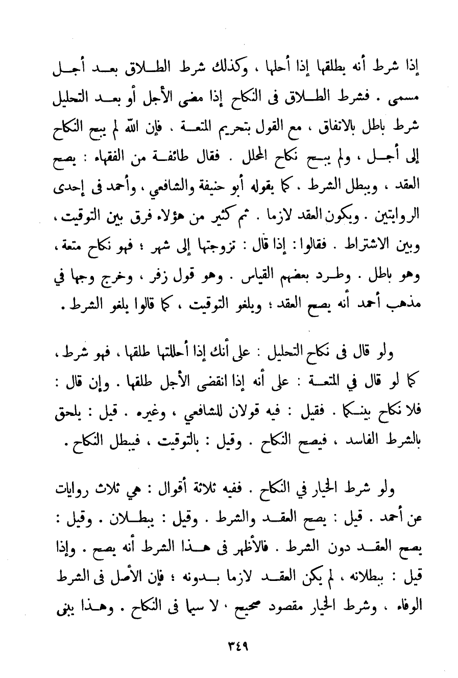 إذَا شَرَطَ أَنَّهُ يُطَلِّقُهَا إذَا أَحَلَّهَا وَكَذَلِكَ شَرْطُ الطَّلَاقِ بَعْدَ أَجَلٍ مُسَمًّى. فَشَرْطُ الطَّلَاقِ فِي النِّكَاحِ إذَا مَضَى الْأَجَلُ أَوْ بَعْدَ التَّحْلِيلِ شَرْطٌ بَاطِلٌ بِالِاتِّفَاقِ مَعَ الْقَوْلِ بِتَحْرِيمِ الْمُتْعَةِ فَإِنَّ اللَّهَ لَمْ يُبِحْ النِّكَاحَ إلَى أَجَلٍ وَلَمْ يُبِحْ نِكَاحَ الْمُحَلِّلِ. فَقَالَ طَائِفَةٌ مِنْ الْفُقَهَاءِ: يَصِحُّ الْعَقْدُ وَيَبْطُلُ الشَّرْطُ كَمَا يَقُولُهُ أَبُو حَنِيفَةَ وَالشَّافِعِيُّ وَأَحْمَد فِي إحْدَى الرِّوَايَتَيْنِ. وَيَكُونُ الْعَقْدُ لَازِمًا. ثُمَّ كَثِيرٌ مِنْ هَؤُلَاءِ فَرَّقَ بَيْنَ التَّوْقِيتِ وَبَيْنَ الِاشْتِرَاطِ. فَقَالُوا: إذَا قَالَ: تَزَوَّجْتهَا إلَى شَهْرٍ؛ فَهُوَ نِكَاحُ مُتْعَةٍ وَهُوَ بَاطِلٌ. وَطَرَدَ بَعْضُهُمْ الْقِيَاسَ. وَهُوَ قَوْلُ زُفَرَ وَخَرَّجَ وَجْهًا فِي مَذْهَبِ أَحْمَد أَنَّهُ يَصِحُّ الْعَقْدُ؛ وَيَلْغُو التَّوْقِيتُ كَمَا قَالُوا يَلْغُو الشَّرْطُ. وَلَوْ قَالَ فِي نِكَاحِ التَّحْلِيلِ: عَلَى أَنَّك إذَا أَحْلَلْتهَا طَلِّقْهَا فَهُوَ شَرْطٌ كَمَا لَوْ قَالَ فِي الْمُتْعَةِ: عَلَى أَنَّهُ إذَا انْقَضَى الْأَجَلُ طَلِّقْهَا. وَإِنْ قَالَ: فَلَا نِكَاحَ بَيْنَكُمَا. فَقِيلَ: فِيهِ قَوْلَانِ لِلشَّافِعِيِّ وَغَيْرِهِ قِيلَ: يُلْحَقُ بِالشَّرْطِ الْفَاسِدِ فَيَصِحُّ النِّكَاحُ. وَقِيلَ: بِالتَّوْقِيتِ فَيَبْطُلُ النِّكَاحُ. وَلَوْ شَرَطَ الْخِيَارَ فِي النِّكَاحِ، فَفِيهِ ثَلَاثَةُ أَقْوَالٍ: هِيَ ثَلَاثُ رِوَايَاتٍ عَنْ أَحْمَد. قِيلَ: يَصِحُّ الْعَقْدُ وَالشَّرْطُ. وَقِيلَ: يَبْطُلَانِ. وَقِيلَ: يَصِحُّ الْعَقْدُ دُونَ الشَّرْطِ. فَالْأَظْهَرُ فِي هَذَا الشَّرْطِ أَنَّهُ يَصِحُّ. وَإِذَا قِيلَ: بِبُطْلَانِهِ لَمْ يَكُنْ الْعَقْدُ لَازِمًا بِدُونِهِ؛ فَإِنَّ الْأَصْلَ فِي الشَّرْطِ الْوَفَاءُ وَشَرْطُ الْخِيَارِ مَقْصُودٌ صَحِيحٌ لَا سِيَّمَا فِي النِّكَاحِ. وَهَذَا يُبْنَى