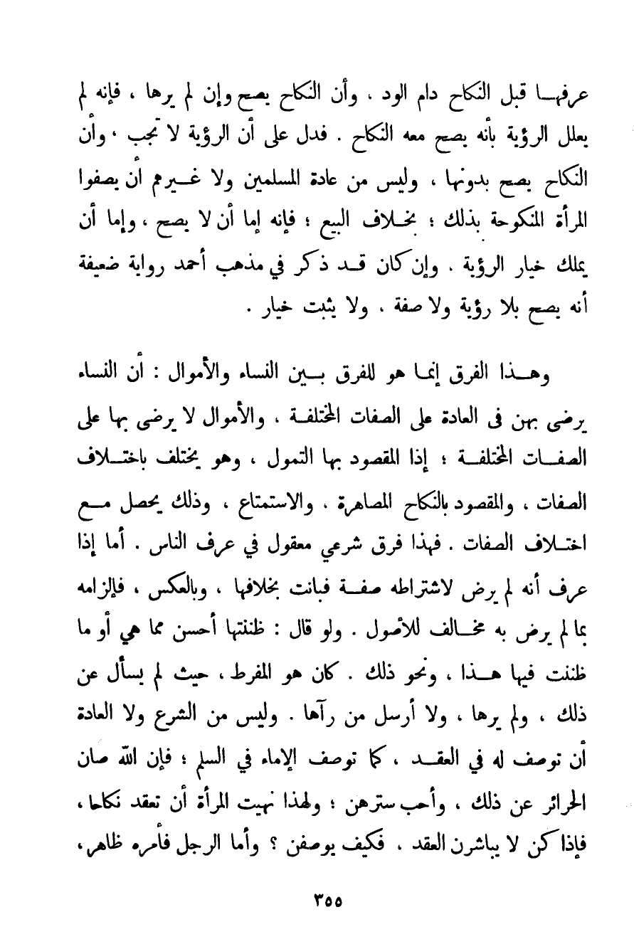 عَرَفَهَا قَبْلَ النِّكَاحِ دَامَ الْوُدُّ. وَأَنَّ النِّكَاحَ يَصِحُّ وَإِنْ لَمْ يَرَهَا فَإِنَّهُ لَمْ يُعَلِّلْ الرُّؤْيَةَ بِأَنَّهُ يَصِحُّ مَعَهُ النِّكَاحُ. فَدَلَّ عَلَى أَنَّ الرُّؤْيَةَ لَا تَجِبُ وَأَنَّ النِّكَاحَ يَصِحُّ بِدُونِهَا وَلَيْسَ مِنْ عَادَةِ الْمُسْلِمِينَ وَلَا غَيْرِهِمْ أَنْ يَصِفُوا الْمَرْأَةَ الْمَنْكُوحَةَ بِذَلِكَ؛ بِخِلَافِ الْبَيْعِ؛ فَإِنَّهُ إمَّا أَنْ لَا يَصِحَّ وَإِمَّا أَنْ يَمْلِكَ خِيَارَ الرُّؤْيَةِ. وَإِنْ كَانَ قَدْ ذَكَرَ فِي مَذْهَبِ أَحْمَد رِوَايَةً ضَعِيفَةً أَنَّهُ يَصِحُّ بِلَا رُؤْيَةٍ وَلَا صِفَةٍ وَلَا يَثْبُتُ خِيَارٌ. وَهَذَا الْفَرْقُ إنَّمَا هُوَ لِلْفَرْقِ بَيْنَ النِّسَاءِ وَالْأَمْوَالِ: أَنَّ النِّسَاءَ يُرْضَى بِهِنَّ فِي الْعَادَةِ عَلَى الصِّفَاتِ الْمُخْتَلِفَةِ وَالْأَمْوَالَ لَا يُرْضَى بِهَا عَلَى الصِّفَاتِ الْمُخْتَلِفَةِ؛ إذْ الْمَقْصُودُ بِهَا التَّمَوُّلُ وَهُوَ يَخْتَلِفُ بِاخْتِلَافِ الصِّفَاتِ وَالْمَقْصُودُ بِالنِّكَاحِ الْمُصَاهَرَةُ وَالِاسْتِمْتَاعُ وَذَلِكَ يَحْصُلُ مَعَ اخْتِلَافِ الصِّفَاتِ. فَهَذَا فَرْقٌ شَرْعِيٌّ مَعْقُولٌ فِي عُرْفِ النَّاسِ. أَمَّا إذَا عُرِفَ أَنَّهُ لَمْ يَرْضَ لِاشْتِرَاطِهِ صِفَةً فَبَانَتْ بِخِلَافِهَا وَبِالْعَكْسِ فَإِلْزَامُهُ بِمَا لَمْ يَرْضَ بِهِ مُخَالِفٌ لِلْأُصُولِ. وَلَوْ قَالَ: ظَنَنْتهَا أَحْسَنَ مِمَّا هِيَ أَوْ مَا ظَنَنْت فِيهَا هَذَا وَنَحْوَ ذَلِكَ. كَانَ هُوَ الْمُفَرِّطَ حَيْثُ لَمْ يَسْأَلْ عَنْ ذَلِكَ وَلَمْ يَرَهَا وَلَا أَرْسَلَ مَنْ رَآهَا. وَلَيْسَ مِنْ الشَّرْعِ وَلَا الْعَادَةِ أَنْ تُوصَفَ لَهُ فِي الْعَقْدِ كَمَا تُوصَفَ الْإِمَاءُ فِي السَّلَمِ؛ فَإِنَّ اللَّهَ صَانَ الْحَرَائِرَ عَنْ ذَلِكَ وَأَحَبَّ سَتْرَهُنَّ؛ وَلِهَذَا نُهِيَتْ الْمَرْأَةُ أَنْ تَعْقِدَ نِكَاحًا فَإِذَا كُنَّ لَا يُبَاشِرْنَ الْعَقْدَ فَكَيْفَ يُوصَفْنَ؟ وَأَمَّا الرَّجُل فَأَمْرُهُ ظَاهِرٌ