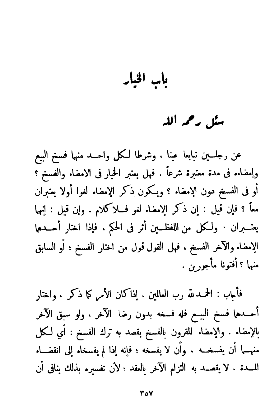 الْحَمْدُ لِلَّهِ رَبِّ الْعَالَمِينَ، إذَا كَانَ الْأَمْرُ كَمَا ذُكِرَ وَاخْتَارَ أَحَدُهُمَا فَسْخَ الْبَيْعِ فَلَهُ فَسْخُهُ بِدُونِ رِضَا الْآخَرِ وَلَوْ سَبَقَ الْآخَرَ بِالْإِمْضَاءِ. وَالْإِمْضَاءُ الْمَقْرُونُ بِالْفَسْخِ يُقْصَدُ بِهِ تَرْكُ الْفَسْخِ: أَيْ لِكُلٍّ مِنْهُمَا أَنْ يَفْسَخَهُ وَأَنْ لَا يَفْسَخَهُ؛ فَإِنَّهُ إذَا لَمْ يَفْسَخَاهُ إلَى انْقِضَاءِ الْمُدَّةِ لَا يَقْصِدُ بِهِ الْتِزَامَ الْآخَرِ بِالْعَقْدِ لِأَنَّ تَفْسِيرَهُ بِذَلِكَ يُنَافِي أَنْ