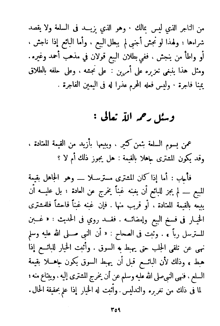 مِنْ التَّاجِرِ الَّذِي لَيْسَ بِمَالِكٍ وَهُوَ الَّذِي يَزِيدُ فِي السِّلْعَةِ وَلَا يَقْصِدُ شِرَاءَهَا؛ وَلِهَذَا لَوْ نَجَشَ أَجْنَبِيٌّ لَمْ يَبْطُلْ الْبَيْعُ وَأَمَّا الْبَائِعُ إذَا ناجش أَوْ وَاطَأَ مَنْ يَنْجُشُ فَفِي بُطْلَانِ الْبَيْعِ قَوْلَانِ فِي مَذْهَبِ أَحْمَد وَغَيْرِهِ. وَمِثْلُ هَذَا يَنْبَغِي تَعْزِيرُهُ عَلَى أَمْرَيْنِ: عَلَى نَجْشِهِ وَعَلَى حَلِفِهِ بِالطَّلَاقِ يَمِينًا فَاجِرَةً وَلَيْسَ فِعْلُهُ الْمُحَرَّمُ عُذْرًا لَهُ فِي الْيَمِينِ الْفَاجِرَةِ.