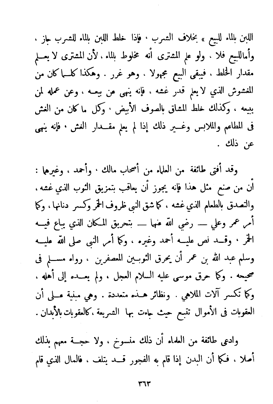 اللَّبَنُ بِالْمَاءِ لِلْبَيْعِ} بِخِلَافِ الشُّرْبِ فَإِذَا خُلِطَ اللَّبَنُ بِالْمَاءِ لِلشُّرْبِ جَازَ وَأَمَّا لِلْبَيْعِ فَلَا وَلَوْ عَلِمَ الْمُشْتَرِي أَنَّهُ مَخْلُوطٌ بِالْمَاءِ لِأَنَّ الْمُشْتَرِيَ لَا يَعْلَمُ مِقْدَارَ الْخَلْطِ فَيَبْقَى الْبَيْعُ مَجْهُولًا وَهُوَ غَرَرٌ. وَهَكَذَا كُلَّمَا كَانَ مِنْ الْمَغْشُوشِ الَّذِي لَا يُعْلَمُ قَدْرُ غِشِّهِ فَإِنَّهُ يُنْهَى عَنْ بَيْعِهِ وَعَنْ عَمَلِهِ لِمَنْ يَبِيعُهُ وَكَذَلِكَ خَلْطُ الْمُشَاقِّ بِالصُّوفِ الْأَبْيَضِ وَكُلُّ مَا كَانَ مِنْ الْغِشِّ فِي الْمَطَاعِمِ وَالْمَلَابِسِ وَغَيْرِ ذَلِكَ إذَا لَمْ يُعْلَمْ مِقْدَارُ الْغِشِّ فَإِنَّهُ يُنْهَى عَنْ ذَلِكَ. وَقَدْ أَفْتَى طَائِفَةٌ مِنْ الْعُلَمَاءِ مِنْ أَصْحَابِ مَالِكٍ وَأَحْمَد وَغَيْرِهِمَا: أَنَّ مَنْ صَنَعَ مِثْلَ هَذَا فَإِنَّهُ يَجُوزُ أَنْ يُعَاقَبَ بِتَمْزِيقِ الثَّوْبِ الَّذِي غَشَّهُ وَالتَّصَدُّقُ بِالطَّعَامِ الَّذِي غَشَّهُ كَمَا شَقَّ النَّبِيُّ ظُرُوفَ الْخَمْرِ وَكَسَرَ دِنَانَهَا وَكَمَا أَمَرَ عُمَرُ وَعَلِيٌّ - رَضِيَ اللَّهُ عَنْهُمَا - بِتَحْرِيقِ الْمَكَانِ الَّذِي يُبَاعُ فِيهِ الْخَمْرُ وَقَدْ نَصَّ عَلَيْهِ أَحْمَد وَغَيْرُهُ وَكَمَا {أَمَرَ النَّبِيُّ صَلَّى اللَّهُ عَلَيْهِ وَسَلَّمَ عَبْدَ اللَّهِ بْنَ عُمَرَ أَنْ يُحَرِّقَ الثَّوْبَيْنِ الْمُعَصْفَرَيْنِ} رَوَاهُ مُسْلِمٌ فِي صَحِيحِهِ. وَكَمَا حَرَّقَ مُوسَى عَلَيْهِ السَّلَامُ الْعِجْلَ وَلَمْ يُعِدْهُ إلَى أَهْلِهِ وَكَمَا تُكْسَرُ آلَاتُ الْمَلَاهِي، وَنَظَائِرُ هَذِهِ مُتَعَدِّدَةٌ، وَهِيَ مَبْنِيَّةٌ عَلَى أَنَّ الْعُقُوبَاتِ فِي الْأَمْوَالِ تَتْبَعُ حَيْثُ جَاءَتْ بِهَا الشَّرِيعَةُ كَالْعُقُوبَاتِ بِالْأَبْدَانِ. وَادَّعَى طَائِفَةٌ مِنْ الْعُلَمَاءِ أَنَّ ذَلِكَ مَنْسُوخٌ وَلَا حُجَّةَ مَعَهُمْ بِذَلِكَ أَصْلًا فَكَمَا أَنَّ الْبَدَنَ إذَا قَامَ بِهِ الْفُجُورُ قَدْ يَتْلَفُ فَالْمَالُ الَّذِي قَامَ