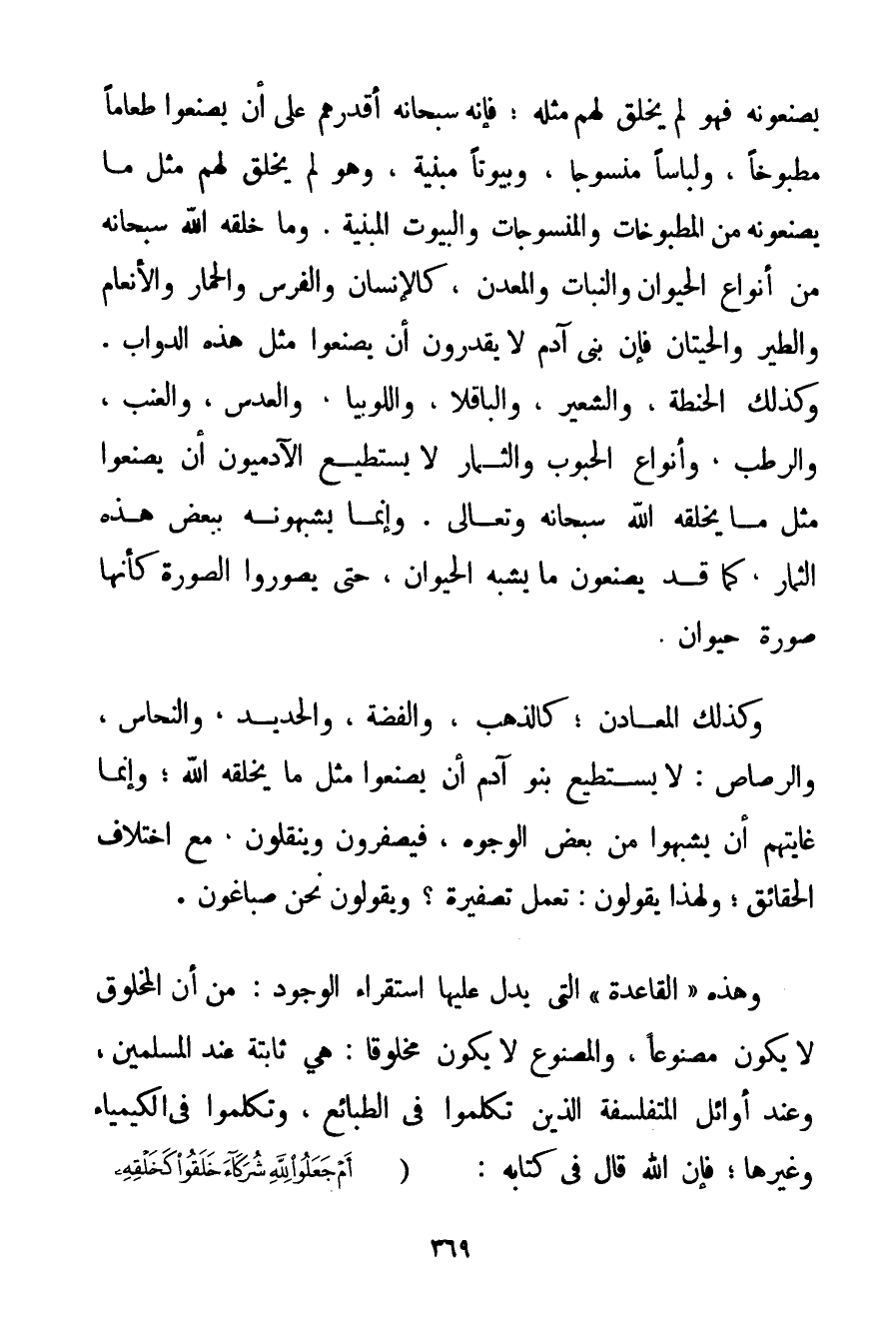 يَصْنَعُونَهُ فَهُوَ لَمْ يَخْلُقْ لَهُمْ مِثْلَهُ؛ فَإِنَّهُ سُبْحَانَهُ أَقْدَرَهُمْ عَلَى أَنْ يَصْنَعُوا طَعَامًا مَطْبُوخًا وَلِبَاسًا مَنْسُوجًا وَبُيُوتًا مَبْنِيَّةً وَهُوَ لَمْ يَخْلُقْ لَهُمْ مِثْلَ مَا يَصْنَعُونَهُ مِنْ الْمَطْبُوخَاتِ وَالْمَنْسُوجَاتِ وَالْبُيُوتِ الْمَبْنِيَّةِ. وَمَا خَلَقَهُ اللَّهُ سُبْحَانَهُ مِنْ أَنْوَاعِ الْحَيَوَانِ وَالنَّبَاتِ وَالْمَعْدِنِ كَالْإِنْسَانِ وَالْفَرَسِ وَالْحِمَارِ وَالْأَنْعَامِ وَالطَّيْرِ وَالْحِيتَانِ فَإِنَّ بَنِي آدَمَ لَا يَقْدِرُونَ أَنْ يَصْنَعُوا مِثْلَ هَذِهِ الدَّوَابِّ. وَكَذَلِكَ الْحِنْطَةُ وَالشَّعِيرُ والباقلا وَاللُّوبِيَا وَالْعَدَسُ وَالْعِنَبُ وَالرُّطَبُ وَأَنْوَاعُ الْحُبُوبِ وَالثِّمَارِ لَا يَسْتَطِيعُ الْآدَمِيُّونَ أَنْ يَصْنَعُوا مِثْلَ مَا يَخْلُقُهُ اللَّهُ سُبْحَانَهُ وَتَعَالَى. وَإِنَّمَا يُشَبِّهُونَهُ بِبَعْضِ هَذِهِ الثِّمَارِ كَمَا قَدْ يَصْنَعُونَ مَا يُشْبِهُ الْحَيَوَانَ حَتَّى يُصَوِّرُوا الصُّورَةَ كَأَنَّهَا صُورَةُ حَيَوَانٍ. وَكَذَلِكَ الْمَعَادِنُ. كَالذَّهَبِ وَالْفِضَّةِ وَالْحَدِيدِ وَالنُّحَاسِ وَالرَّصَاصِ: لَا يَسْتَطِيعُ بَنُو آدَمَ أَنْ يَصْنَعُوا مِثْلَ مَا يَخْلُقُهُ اللَّهُ؛ وَإِنَّمَا غَايَتُهُمْ أَنْ يُشَبِّهُوا مِنْ بَعْضِ الْوُجُوهِ فَيُصَفِّرُونَ وَيَنْقُلُونَ. مَعَ اخْتِلَافِ الْحَقَائِقِ؛ وَلِهَذَا يَقُولُونَ: تَعْمَلُ تصفيرة؟ وَيَقُولُونَ نَحْنُ صَبَّاغُونَ. وَهَذِهِ " الْقَاعِدَةُ " الَّتِي يَدُلُّ عَلَيْهَا اسْتِقْرَاءُ الْوُجُودِ: مِنْ أَنَّ الْمَخْلُوقَ لَا يَكُونُ مَصْنُوعًا وَالْمَصْنُوعُ لَا يَكُونُ مَخْلُوقًا: هِيَ ثَابِتَةٌ عِنْدَ الْمُسْلِمِينَ وَعِنْدَ أَوَائِلِ الْمُتَفَلْسِفَةِ الَّذِينَ تَكَلَّمُوا فِي الطَّبَائِعِ وَتَكَلَّمُوا فِي الْكِيمْيَاءِ وَغَيْرِهَا؛ فَإِنَّ اللَّهَ قَالَ فِي كِتَابِهِ: {أَمْ جَعَلُوا لِلَّهِ شُرَكَاءَ خَلَقُوا كَخَلْقِهِ