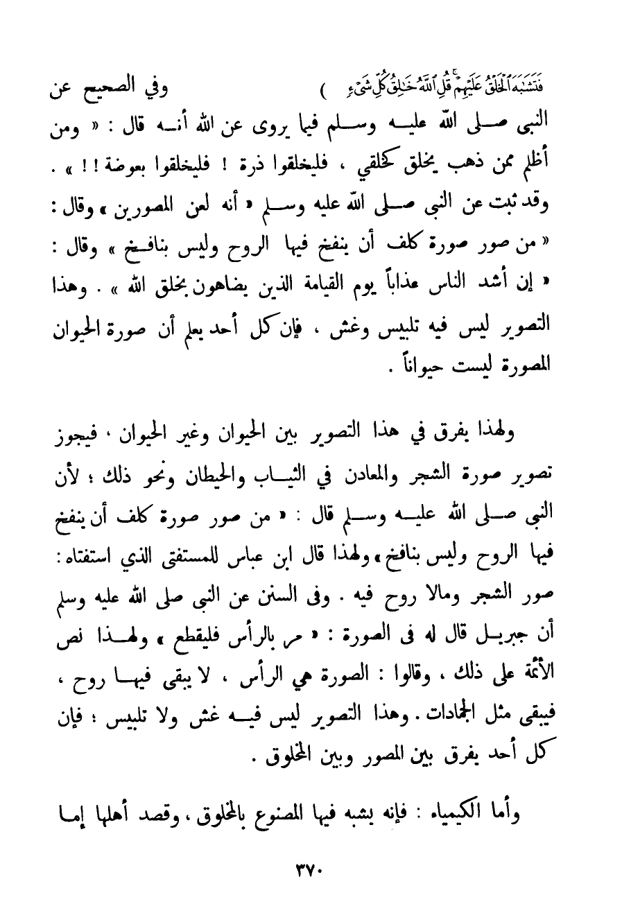 فَتَشَابَهَ الْخَلْقُ عَلَيْهِمْ قُلِ اللَّهُ خَالِقُ كُلِّ شَيْءٍ} وَفِي الصَّحِيحِ عَنْ النَّبِيِّ صَلَّى اللَّهُ عَلَيْهِ وَسَلَّمَ فِيمَا يَرْوِي عَنْ اللَّهِ أَنَّهُ قَالَ: {وَمَنْ أَظْلَمُ مِمَّنْ ذَهَبَ يَخْلُقُ كَخَلْقِي فَلْيَخْلُقُوا ذَرَّةً فَلْيَخْلُقُوا بَعُوضَةً} . وَقَدْ ثَبَتَ {عَنْ النَّبِيِّ صَلَّى اللَّهُ عَلَيْهِ وَسَلَّمَ أَنَّهُ لَعَنَ الْمُصَوِّرِينَ} وَقَالَ: {مَنْ صَوَّرَ صُورَةً كُلِّفَ أَنْ يَنْفُخَ فِيهَا الرُّوحَ وَلَيْسَ بِنَافِخِ} وَقَالَ: {إنَّ أَشَدَّ النَّاسِ عَذَابًا يَوْمَ الْقِيَامَةِ الَّذِينَ يُضَاهُونَ بِخَلْقِ اللَّهِ} . وَهَذَا التَّصْوِيرُ لَيْسَ فِيهِ تَلْبِيسٌ وَغِشٌّ فَإِنَّ كُلَّ أَحَدٍ يَعْلَمُ أَنَّ صُورَةَ الْحَيَوَانِ الْمُصَوَّرَةَ لَيْسَتْ حَيَوَانًا. وَلِهَذَا يُفَرَّقُ فِي هَذَا التَّصْوِيرِ بَيْنَ الْحَيَوَانِ وَغَيْرِ الْحَيَوَانِ فَيَجُوزُ تَصْوِيرُ صُورَةِ الشَّجَرِ وَالْمَعَادِنِ فِي الثِّيَابِ وَالْحِيطَانِ وَنَحْوِ ذَلِكَ؛ لِأَنَّ النَّبِيَّ صَلَّى اللَّهُ عَلَيْهِ وَسَلَّمَ قَالَ: {مَنْ صَوَّرَ صُورَةً كُلِّفَ أَنْ يَنْفُخَ فِيهَا الرُّوحَ وَلَيْسَ بِنَافِخِ} وَلِهَذَا قَالَ ابْنُ عَبَّاسٍ لِلْمُسْتَفْتِي الَّذِي اسْتَفْتَاهُ: صَوِّرْ الشَّجَرَ وَمَا لَا رُوحَ فِيهِ. وَفِي السُّنَنِ {عَنْ النَّبِيِّ صَلَّى اللَّهُ عَلَيْهِ وَسَلَّمَ أَنَّ جِبْرِيلَ قَالَ لَهُ فِي الصُّورَةِ: مُرْ بِالرَّأْسِ فَلْيُقْطَعْ} وَلِهَذَا نَصَّ الْأَئِمَّةُ عَلَى ذَلِكَ وَقَالُوا: الصُّورَةُ هِيَ الرَّأْسُ لَا يَبْقَى فِيهَا رُوحٌ فَيَبْقَى مِثْلُ الْجَمَادَاتِ. وَهَذَا التَّصْوِيرُ لَيْسَ فِيهِ غِشٌّ وَلَا تَلْبِيسٌ؛ فَإِنَّ كُلَّ أَحَدٍ يُفَرِّقُ بَيْنَ الْمُصَوَّرِ وَبَيْنَ الْمَخْلُوقِ. وَأَمَّا الْكِيمْيَاءُ: فَإِنَّهُ يُشَبِّهُ فِيهَا الْمَصْنُوعَ بِالْمَخْلُوقِ وَقَصَدَ أَهْلُهَا إمَّا