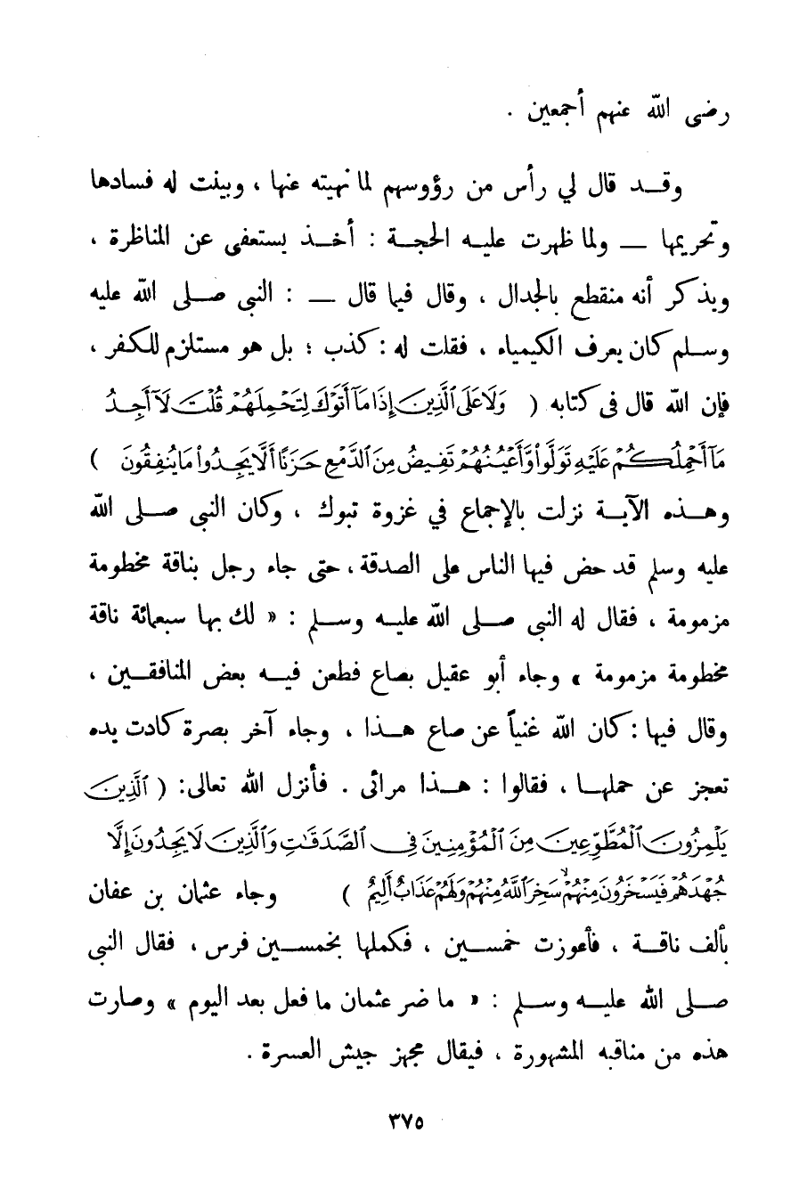 رَضِيَ اللَّهُ عَنْهُمْ أَجْمَعِينَ. وَقَدْ قَالَ لِي رَأْسٌ مِنْ رُؤُوسِهِمْ لَمَّا نَهَيْته عَنْهَا وَبَيَّنْت لَهُ فَسَادَهَا وَتَحْرِيمَهَا - وَلَمَّا ظَهَرَتْ عَلَيْهِ الْحُجَّةُ: أَخَذَ يَسْتَعْفِي عَنْ الْمُنَاظَرَةِ وَيَذْكُرُ أَنَّهُ مُنْقَطِعٌ بِالْجِدَالِ وَقَالَ فِيمَا قَالَ -: النَّبِيُّ صَلَّى اللَّهُ عَلَيْهِ وَسَلَّمَ كَانَ يَعْرِفُ الْكِيمْيَاءَ فَقُلْت لَهُ: كَذِبٌ؛ بَلْ هُوَ مُسْتَلْزِمٌ لِلْكُفْرِ فَإِنَّ اللَّهَ قَالَ فِي كِتَابِهِ {وَلَا عَلَى الَّذِينَ إذَا مَا أَتَوْكَ لِتَحْمِلَهُمْ قُلْتَ لَا أَجِدُ مَا أَحْمِلُكُمْ عَلَيْهِ تَوَلَّوْا وَأَعْيُنُهُمْ تَفِيضُ مِنَ الدَّمْعِ حَزَنًا أَلَّا يَجِدُوا مَا يُنْفِقُونَ} وَهَذِهِ الْآيَةُ نَزَلَتْ بِالْإِجْمَاعِ فِي غَزْوَةِ تَبُوكَ وَكَانَ النَّبِيُّ صَلَّى اللَّهُ عَلَيْهِ وَسَلَّمَ قَدْ حَضَّ فِيهَا النَّاسَ عَلَى الصَّدَقَةِ حَتَّى {جَاءَ رَجُلٌ بِنَاقَةٍ مَخْطُومَةٍ مَزْمُومَةٍ فَقَالَ النَّبِيُّ صَلَّى اللَّهُ عَلَيْهِ وَسَلَّمَ لَك بِهَا سَبْعُمِائَةِ نَاقَةٍ مَخْطُومَةٍ مَزْمُومَةٍ} وَجَاءَ أَبُو عَقِيلٍ بِصَاعٍ فَطَعَنَ فِيهِ بَعْضُ الْمُنَافِقِينَ وَقَالَ فِيهَا: كَانَ اللَّهُ غَنِيًّا عَنْ صَاعِ هَذَا وَجَاءَ آخَرُ بِصُرَّةٍ كَادَتْ يَدُهُ تَعْجِزُ عَنْ حَمْلِهَا فَقَالُوا: هَذَا مِرَاءٌ. فَأَنْزَلَ اللَّهُ تَعَالَى: {الَّذِينَ يَلْمِزُونَ الْمُطَّوِّعِينَ مِنَ الْمُؤْمِنِينَ فِي الصَّدَقَاتِ وَالَّذِينَ لَا يَجِدُونَ إلَّا جُهْدَهُمْ فَيَسْخَرُونَ مِنْهُمْ سَخِرَ اللَّهُ مِنْهُمْ وَلَهُمْ عَذَابٌ أَلِيمٌ} {وَجَاءَ عُثْمَانُ بْنُ عفان بِأَلْفِ نَاقَةٍ فَأَعْوَزَتْ خَمْسِينَ فَكَمَّلَهَا بِخَمْسِينَ فَرَسٍ فَقَالَ النَّبِيُّ صَلَّى اللَّهُ عَلَيْهِ وَسَلَّمَ مَا ضَرَّ عُثْمَانَ مَا فَعَلَ بَعْدَ الْيَوْمِ} وَصَارَتْ هَذِهِ مِنْ مَنَاقِبِهِ الْمَشْهُورَةِ فَيُقَالُ مُجَهِّزُ جَيْشِ الْعُسْرَةِ.