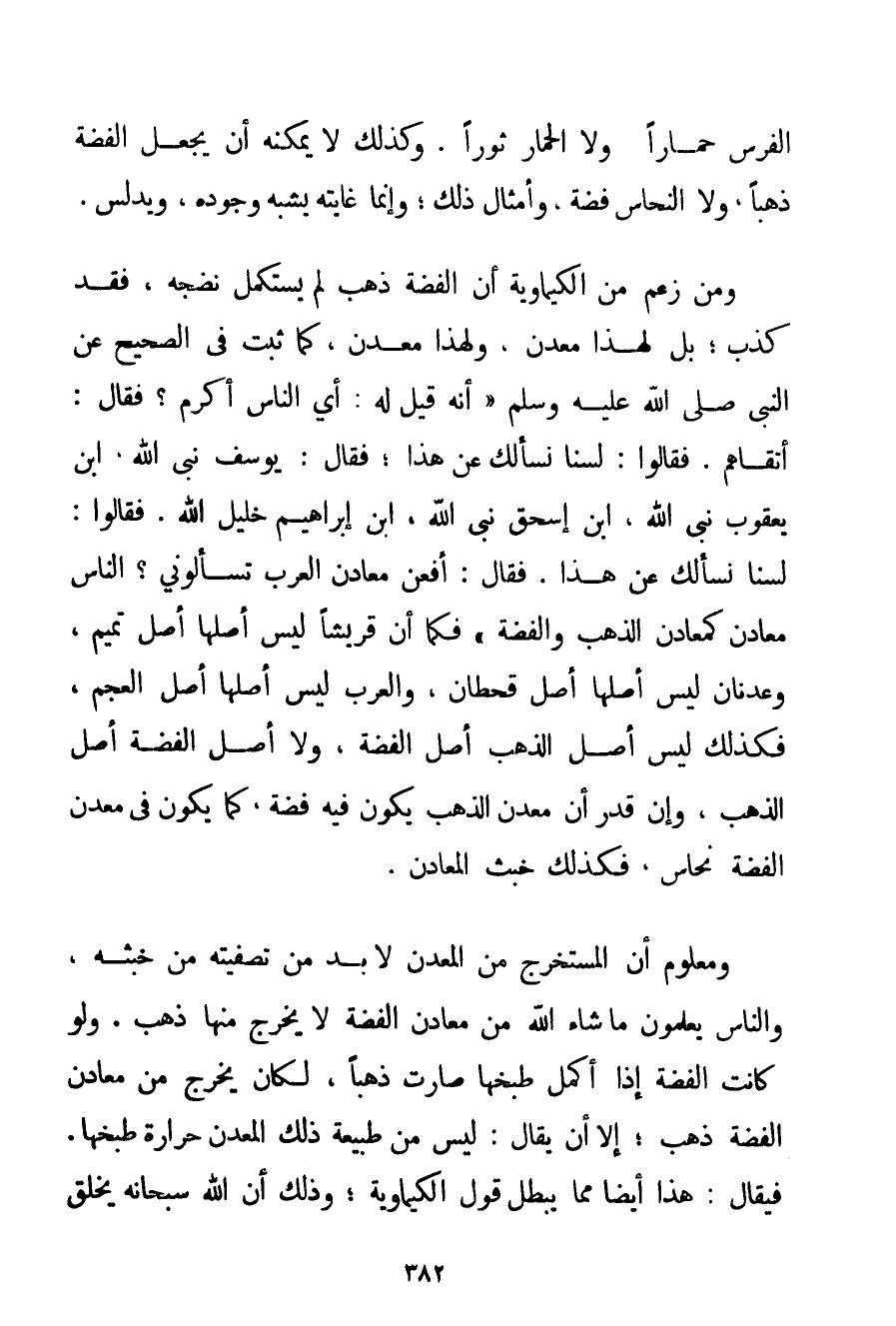 الْفَرَسَ حِمَارًا وَلَا الْحِمَارَ ثَوْرًا. وَكَذَلِكَ لَا يُمْكِنُهُ أَنْ يَجْعَلَ الْفِضَّةَ ذَهَبًا وَلَا النُّحَاسَ فِضَّةً وَأَمْثَالَ ذَلِكَ. وَإِنَّمَا غَايَتُهُ يُشْبِهُ وُجُودَهُ وَيُدَلِّسُ. وَمَنْ زَعَمَ مِنْ الْكِيمَاوِيَّةِ أَنَّ الْفِضَّةَ ذَهَبٌ لَمْ يَسْتَكْمِلْ نُضْجُهُ فَقَدْ كَذَبَ؛ بَلْ لِهَذَا مَعْدِنٌ وَلِهَذَا مَعْدِنٌ كَمَا ثَبَتَ فِي الصَّحِيحِ عَنْ النَّبِيِّ صَلَّى اللَّهُ عَلَيْهِ وَسَلَّمَ {أَنَّهُ قِيلَ لَهُ: أَيُّ النَّاسِ أَكْرَمُ؟ فَقَالَ: أَتْقَاهُمْ. فَقَالُوا: لَسْنَا نَسْأَلُك عَنْ هَذِهِ؛ فَقَالَ: يُوسُفُ نَبِيُّ اللَّهِ. ابْنُ يَعْقُوبَ نَبِيُّ اللَّهِ ابْنُ إسْحَاقَ نَبِيُّ اللَّهِ ابْنُ إبْرَاهِيمَ خَلِيلُ اللَّهِ. فَقَالُوا: لَسْنَا نَسْأَلُك عَنْ هَذَا. فَقَالَ: أَفَعَنْ مَعَادِنِ الْعَرَبِ تَسْأَلُونِي؟ النَّاسُ مَعَادِنُ كَمَعَادِنِ الذَّهَبِ وَالْفِضَّةِ} فَكَمَا أَنَّ قُرَيْشًا لَيْسَ أَصْلُهَا أَصْلَ تَمِيمٍ وَعَدْنَانُ لَيْسَ أَصْلُهَا أَصْلَ قَحْطَانَ وَالْعَرَبُ لَيْسَ أَصْلُهَا أَصْلَ الْعَجَمِ فَكَذَلِكَ لَيْسَ أَصْلُ الذَّهَبِ أَصْلَ الْفِضَّةِ وَلَا أَصْلُ الْفِضَّةِ أَصْلَ الذَّهَبِ وَإِنْ قُدِّرَ أَنَّ مَعْدِنَ الذَّهَبِ يَكُونُ فِيهِ فِضَّةٌ كَمَا يَكُونُ فِي مَعْدِنِ الْفِضَّةِ نُحَاسٌ فَكَذَلِكَ خَبَثُ الْمَعَادِنِ. وَمَعْلُومٌ أَنَّ الْمُسْتَخْرَجَ مِنْ الْمَعْدِنِ لَا بُدَّ مِنْ تَصْفِيَتِهِ مِنْ خُبْثِهِ وَالنَّاسُ يَعْلَمُونَ مَا شَاءَ اللَّهُ مِنْ مَعَادِنِ الْفِضَّةِ لَا يَخْرُجُ مِنْهَا ذَهَبٌ. وَلَوْ كَانَتْ الْفِضَّةُ إذَا أُكْمِلَ طَبْخُهَا صَارَتْ ذَهَبًا لَكَانَ يَخْرُجُ مِنْ مَعَادِنِ الْفِضَّةِ ذَهَبٌ؛ إلَّا أَنْ يُقَالَ: لَيْسَ مِنْ طَبِيعَةِ ذَلِكَ الْمَعْدِنِ حَرَارَةُ طَبْخِهَا. فَيُقَالُ: هَذَا أَيْضًا مِمَّا يُبْطِلُ قَوْلَ الْكِيمَاوِيَّةِ؛ وَذَلِكَ أَنَّ اللَّهَ سُبْحَانَهُ يَخْلُقُ