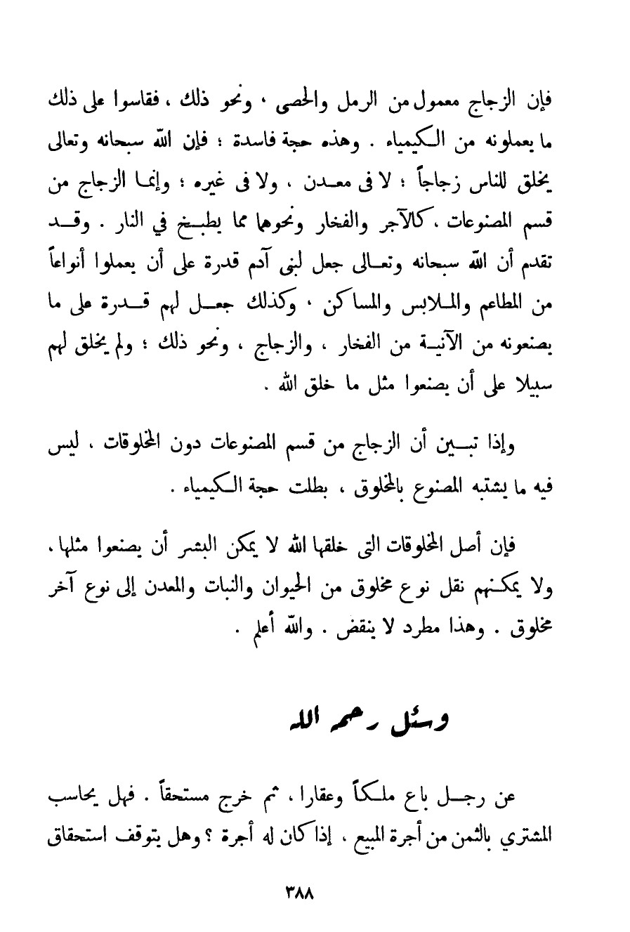 فَإِنَّ الزُّجَاجَ مَعْمُولٌ مِنْ الرَّمْلِ وَالْحَصَى وَنَحْوِ ذَلِكَ فَقَاسُوا عَلَى ذَلِكَ مَا يَعْمَلُونَهُ مِنْ الْكِيمْيَاءِ وَهَذِهِ حُجَّةٌ فَاسِدَةٌ؛ فَإِنَّ اللَّهَ سُبْحَانَهُ وَتَعَالَى يَخْلُقُ لِلنَّاسِ زُجَاجًا؛ لَا فِي مَعْدِنٍ وَلَا فِي غَيْرِهِ؛ وَإِنَّمَا الزُّجَاجُ مِنْ قِسْمِ الْمَصْنُوعَاتِ كَالْآجُرِّ وَالْفَخَّارِ وَنَحْوِهِمَا مِمَّا يُطْبَخُ فِي النَّارِ. وَقَدْ تَقَدَّمَ أَنَّ اللَّهَ سُبْحَانَهُ وَتَعَالَى جَعَلَ لِبَنِي آدَمَ قُدْرَةً عَلَى أَنْ يَعْمَلُوا أَنْوَاعًا مِنْ الْمَطَاعِمِ وَالْمَلَابِسِ وَالْمَسَاكِنِ وَكَذَلِكَ جَعَلَ لَهُمْ قُدْرَةً عَلَى مَا يَصْنَعُونَهُ مِنْ الْآنِيَةِ مِنْ الْفَخَّارِ وَالزُّجَاجِ وَنَحْوِ ذَلِكَ؛ وَلَمْ يَخْلُقْ لَهُمْ سَبِيلًا عَلَى أَنْ يَصْنَعُوا مِثْلَ مَا خَلَقَ اللَّهُ. وَإِذَا تَبَيَّنَ أَنَّ الزُّجَاجَ مِنْ قِسْمِ الْمَصْنُوعَاتِ دُونَ الْمَخْلُوقَاتِ لَيْسَ فِيهِ مَا يَشْتَبِهُ الْمَصْنُوعُ بِالْمَخْلُوقِ بَطَلَتْ حُجَّةُ الْكِيمْيَاءِ. فَإِنَّ أَصْلَ الْمَخْلُوقَاتِ الَّتِي خَلَقَهَا اللَّهُ لَا يُمْكِنُ الْبَشَرُ أَنْ يَصْنَعُوا مِثْلَهَا وَلَا يُمْكِنُهُمْ نَقْلُ نَوْعٍ مَخْلُوقٍ مِنْ الْحَيَوَانِ وَالنَّبَاتِ وَالْمَعْدِنِ إلَى نَوْعٍ آخَرَ مَخْلُوقٍ. وَهَذَا مُطَّرِدٌ لَا يُنْقَضُ. وَاَللَّهُ أَعْلَمُ.