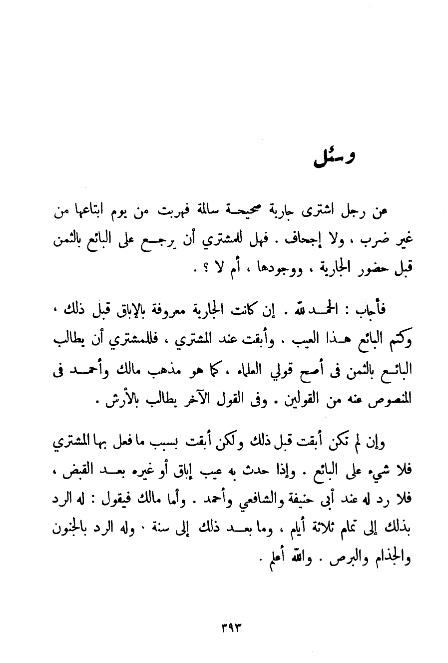 عَنْ رَجُلٍ اشْتَرَى جَارِيَةً صَحِيحَةً سَالِمَةً فَهَرَبَتْ مِنْ يَوْمِ ابْتَاعَهَا مِنْ غَيْرِ ضَرْبٍ وَلَا إجْحَافٍ. فَهَلْ لِلْمُشْتَرِي أَنْ يَرْجِعَ عَلَى الْبَائِعِ بِالثَّمَنِ قَبْلَ حُضُورِ الْجَارِيَةِ وَوُجُودِهَا أَمْ لَا؟ .