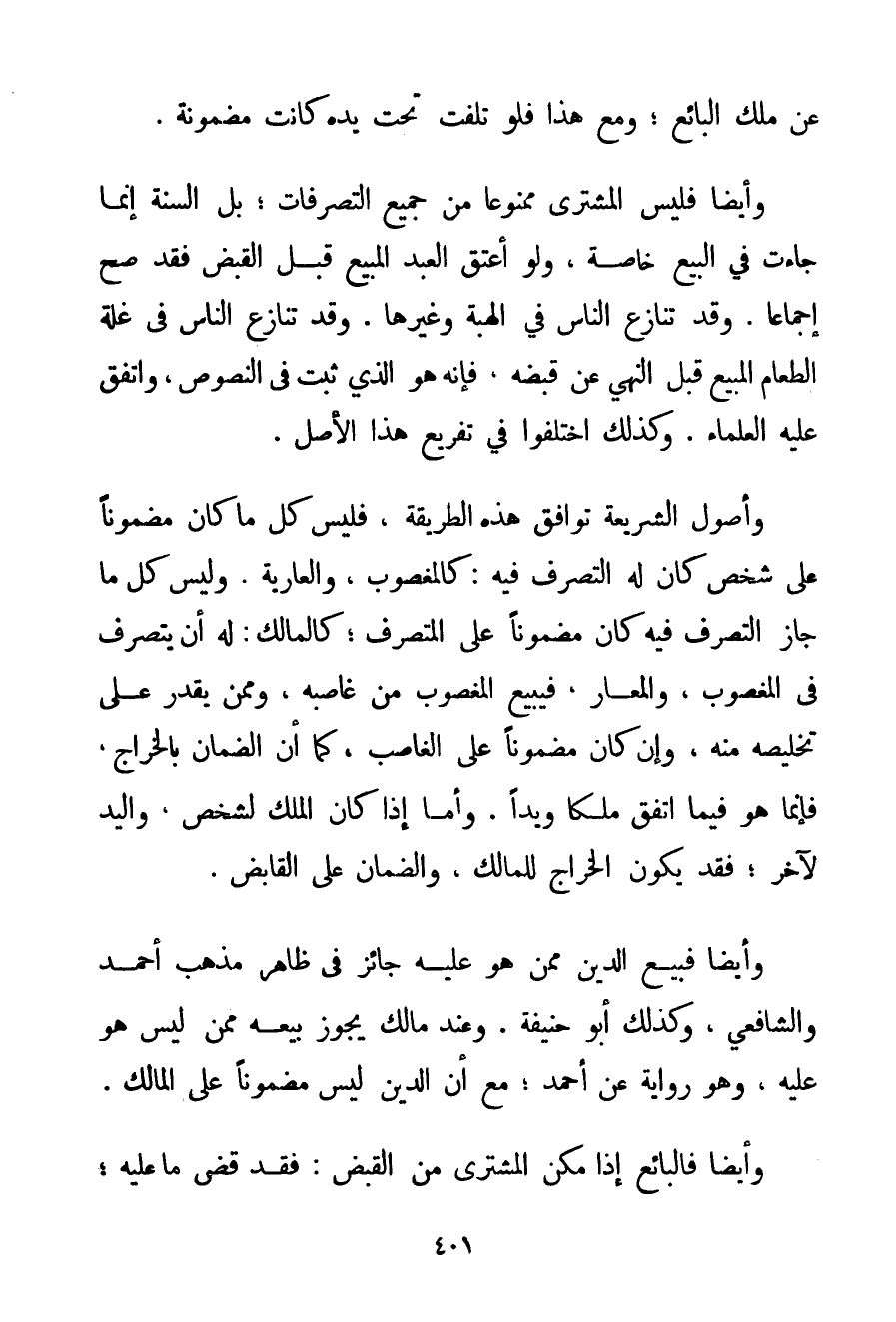 عَنْ مِلْكِ الْبَائِعِ؛ وَمَعَ هَذَا فَلَوْ تَلِفَتْ تَحْتَ يَدِهِ كَانَتْ مَضْمُونَةً. وَأَيْضًا فَلَيْسَ الْمُشْتَرِي مَمْنُوعًا مِنْ جَمِيعِ التَّصَرُّفَاتِ؛ بَلْ السُّنَّةُ إنَّمَا جَاءَتْ فِي الْبَيْعِ خَاصَّةً وَلَوْ أَعْتَقَ الْعَبْدُ الْمَبِيعَ قَبْلَ الْقَبْضِ فَقَدْ صَحَّ إجْمَاعًا. وَقَدْ تَنَازَعَ النَّاسُ فِي الْهِبَةِ وَغَيْرِهَا. وَقَدْ تَنَازَعَ النَّاسُ فِي غَلَّةِ الطَّعَامِ الْمَبِيعِ قَبْلَ النَّهْيِ عَنْ قَبْضِهِ فَإِنَّهُ هُوَ الَّذِي ثَبَتَ فِي النُّصُوصِ وَاتَّفَقَ عَلَيْهِ الْعُلَمَاءُ. وَكَذَلِكَ اخْتَلَفُوا فِي تَفْرِيعِ هَذَا الْأَصْلِ. وَأُصُولُ الشَّرِيعَةِ تُوَافِقُ هَذِهِ الطَّرِيقَةَ فَلَيْسَ كُلُّ مَا كَانَ مَضْمُونًا عَلَى شَخْصٍ كَانَ لَهُ التَّصَرُّفُ فِيهِ: كَالْمَغْصُوبِ وَالْعَارِيَةِ. وَلَيْسَ كُلُّ مَا جَازَ التَّصَرُّفُ فِيهِ كَانَ مَضْمُونًا عَلَى الْمُتَصَرِّفِ؛ كَالْمَالِكِ: لَهُ أَنْ يَتَصَرَّفَ فِي الْمَغْصُوبِ وَالْمُعَارِ فَيَبِيعُ الْمَغْصُوبَ مِنْ غَاصِبِهِ وَمِمَّنْ يَقْدِرُ عَلَى تَخْلِيصِهِ مِنْهُ وَإِنْ كَانَ مَضْمُونًا عَلَى الْغَاصِبِ كَمَا أَنَّ الضَّمَانَ بِالْخَرَاجِ فَإِنَّمَا هُوَ فِيمَا اُتُّفِقَ مِلْكًا وَيَدًا. وَأَمَّا إذَا كَانَ الْمِلْكُ لِشَخْصٍ وَالْيَدُ لِآخَرَ؛ فَقَدْ يَكُونُ الْخَرَاجُ لِلْمَالِكِ وَالضَّمَانُ عَلَى الْقَابِضِ. وَأَيْضًا فَبَيْعُ الدَّيْنِ مِمَّنْ هُوَ عَلَيْهِ جَائِزٌ فِي ظَاهِرِ مَذْهَبِ أَحْمَد وَالشَّافِعِيِّ وَكَذَلِكَ أَبُو حَنِيفَةَ. وَعِنْدَ مَالِكٍ يَجُوزُ بَيْعُهُ مِمَّنْ لَيْسَ هُوَ عَلَيْهِ وَهُوَ رِوَايَةٌ عَنْ أَحْمَد؛ مَعَ أَنَّ الدَّيْنَ لَيْسَ مَضْمُونًا عَلَى الْمَالِكِ. وَأَيْضًا فَالْبَائِعُ إذَا مَكَّنَ الْمُشْتَرِيَ مِنْ الْقَبْضِ: فَقَدْ قَضَى مَا عَلَيْهِ؛