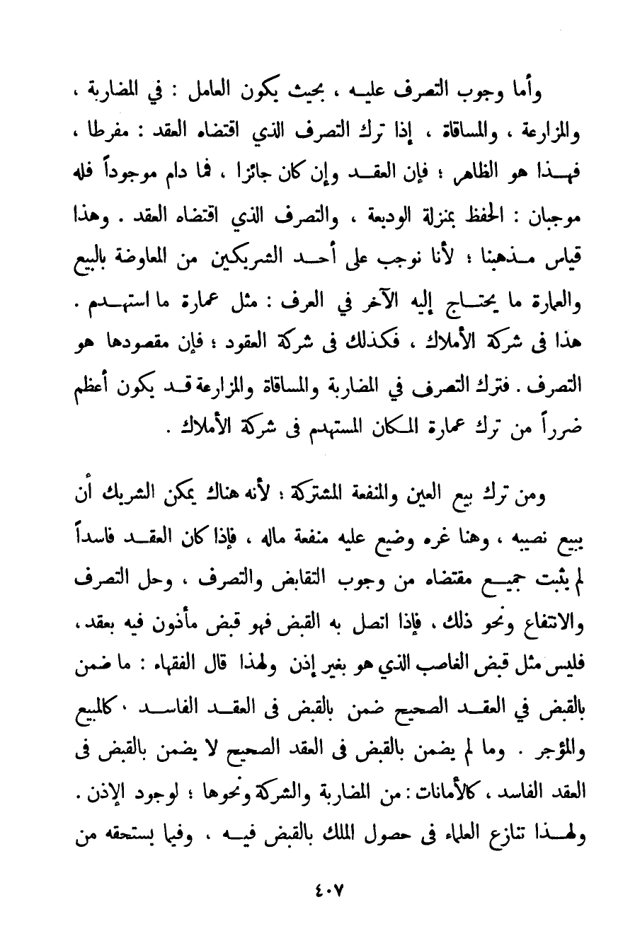 وَأَمَّا وُجُوبُ التَّصَرُّفِ عَلَيْهِ بِحَيْثُ يَكُونُ الْعَامِلُ: فِي الْمُضَارَبَةِ وَالْمُزَارَعَةِ وَالْمُسَاقَاةِ إذَا تَرَكَ التَّصَرُّفَ الَّذِي اقْتَضَاهُ الْعَقْدُ: مُفَرِّطًا فَهَذَا هُوَ الظَّاهِرُ؛ فَإِنَّ الْعَقْدَ وَإِنْ كَانَ جَائِزًا فَمَا دَامَ مَوْجُودًا فَلَهُ مُوجِبَانِ: الْحِفْظُ بِمَنْزِلَةِ الْوَدِيعَةِ وَالتَّصَرُّفُ الَّذِي اقْتَضَاهُ الْعَقْدُ. وَهَذَا قِيَاسُ مَذْهَبِنَا؛ لِأَنَّا نُوجِبُ عَلَى أَحَدِ الشَّرِيكَيْنِ مِنْ الْمُعَاوَضَةِ بِالْبَيْعِ وَالْعِمَارَةِ مَا يَحْتَاجُ إلَيْهِ الْآخَرُ فِي الْعُرْفِ: مِثْلُ عِمَارَةِ مَا استهدم. هَذَا فِي شَرِكَةِ الْأَمْلَاكِ فَكَذَلِكَ فِي شَرِكَةِ الْعُقُودِ؛ فَإِنَّ مَقْصُودَهَا هُوَ التَّصَرُّفُ. فَتَرْكُ التَّصَرُّفِ فِي الْمُضَارَبَةِ وَالْمُسَاقَاةِ وَالْمُزَارَعَةِ قَدْ يَكُونُ أَعْظَمَ ضَرَرًا مِنْ تَرْكِ عِمَارَةِ الْمَكَانِ المستهدم فِي شَرِكَةِ الْأَمْلَاكِ. وَمَنْ تَرَكَ بَيْعَ الْعَيْنِ وَالْمَنْفَعَةِ الْمُشْتَرَكَةِ؛ لِأَنَّهُ هُنَاكَ يُمْكِنُ الشَّرِيكَ أَنْ يَبِيعَ نَصِيبَهُ وَهُنَا غَرَّهُ وَضَيَّعَ عَلَيْهِ مَنْفَعَةَ مَالِهِ فَإِذَا كَانَ الْعَقْدُ فَاسِدًا لَمْ يَثْبُتْ جَمِيعُ مُقْتَضَاهُ مِنْ وُجُوبِ التَّقَابُضِ وَالتَّصَرُّفِ وَحِلِّ التَّصَرُّفِ وَالِانْتِفَاعِ وَنَحْوِ ذَلِكَ فَإِذَا اتَّصَلَ بِهِ الْقَبْضُ فَهُوَ قَبْضٌ مَأْذُونٌ فِيهِ بِعَقْدِ فَلَيْسَ مِثْلُ قَبْضِ الْغَاصِبِ الَّذِي هُوَ بِغَيْرِ إذْنٍ؟ وَلِهَذَا قَالَ الْفُقَهَاءُ: مَا ضُمِنَ بِالْقَبْضِ فِي الْعَقْدِ الصَّحِيحِ ضُمِنَ بِالْقَبْضِ فِي الْعَقْدِ الْفَاسِدِ كَالْمَبِيعِ وَالْمُؤَجَّرِ. وَمَا لَمْ يُضْمَنْ بِالْقَبْضِ فِي الْعَقْدِ الصَّحِيحِ لَا يُضْمَنُ بِالْقَبْضِ فِي الْعَقْدِ الْفَاسِدِ كَالْأَمَانَاتِ: مِنْ الْمُضَارَبَةِ وَالشَّرِكَةِ وَنَحْوِهَا؛ لِوُجُودِ الْإِذْنِ. وَلِهَذَا تَنَازَعَ الْعُلَمَاءُ فِي حُصُولِ الْمِلْكِ بِالْقَبْضِ فِيهِ وَفِيمَا يَسْتَحِقُّهُ