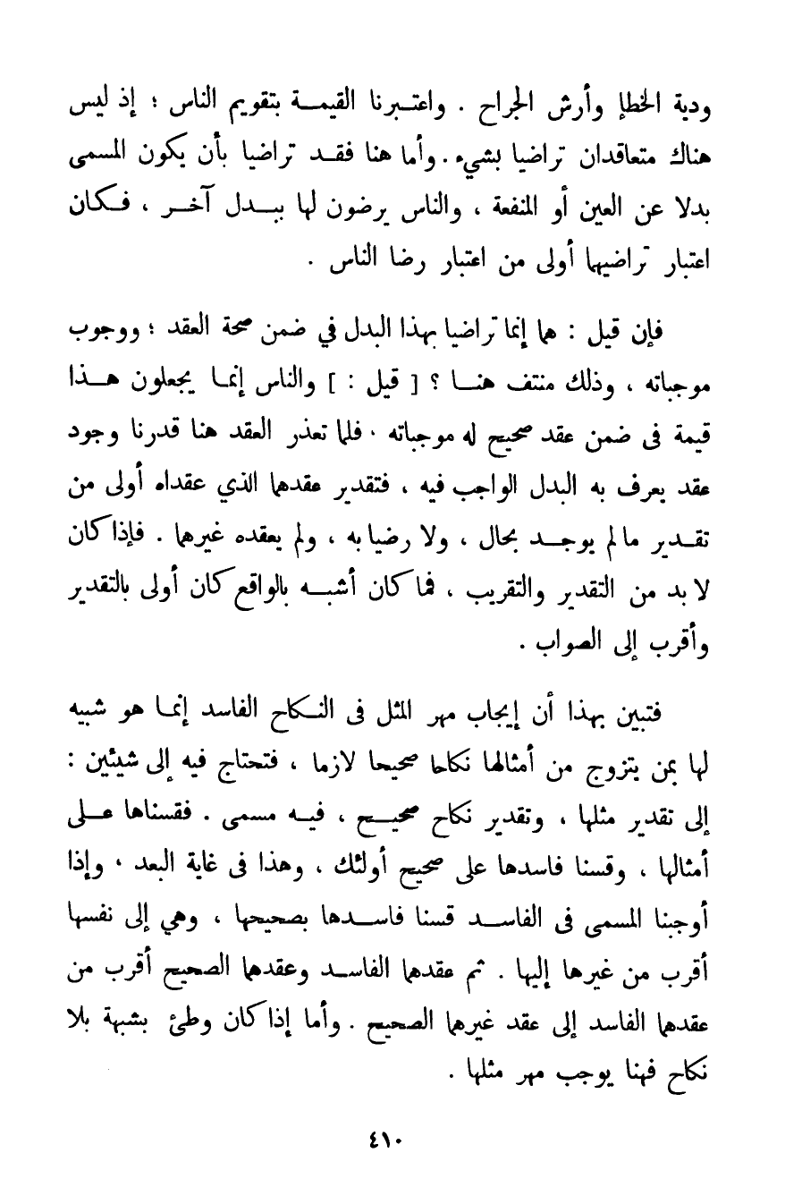 وَدِيَةِ الْخَطَأِ وَأَرْشِ الْجِرَاحِ. وَاعْتَبَرْنَا الْقِيمَةَ بِتَقْوِيمِ النَّاسِ؛ إذْ لَيْسَ هُنَاكَ مُتَعَاقِدَانِ تَرَاضَيَا بِشَيْءِ. وَأَمَّا هُنَا فَقَدْ تَرَاضَيَا بِأَنْ يَكُونَ الْمُسَمَّى بَدَلًا عَنْ الْعَيْنِ أَوْ الْمَنْفَعَةِ وَالنَّاسُ يَرْضَوْنَ لَهَا بِبَدَلٍ آخَرَ فَكَانَ اعْتِبَارُ تَرَاضِيهِمَا أَوْلَى مِنْ اعْتِبَارِ رِضَا النَّاسِ. فَإِنْ قِيلَ: هُمَا إنَّمَا تَرَاضَيَا بِهَذَا الْبَدَلِ فِي ضِمْنِ صِحَّةِ الْعَقْدِ؛ وَوُجُوبِ مُوجِبَاتِهِ وَذَلِكَ مُنْتَفٍ هُنَا؟ قِيلَ: وَالنَّاسُ إنَّمَا يَجْعَلُونَ هَذَا قِيمَةً فِي ضِمْنِ عَقْدٍ صَحِيحٍ لَهُ مُوجِبَاتُهُ فَلَمَّا تَعَذَّرَ الْعَقْدُ هُنَا قَدَّرْنَا وُجُودَ عَقْدٍ يُعْرَفُ بِهِ الْبَدَلُ الْوَاجِبُ فِيهِ فَتَقْدِيرُ عَقْدِهِمَا الَّذِي عَقَدَاهُ أَوْلَى مِنْ تَقْدِيرِ مَا لَمْ يُوجَدْ بِحَالِ وَلَا رَضِيَا بِهِ وَلَمْ يَعْقِدْهُ غَيْرُهُمَا. فَإِذَا كَانَ لَا بُدَّ مِنْ التَّقْدِيرِ وَالتَّقْرِيبِ فَمَا كَانَ أَشْبَهَ بِالْوَاقِعِ كَانَ أَوْلَى بِالتَّقْدِيرِ وَأَقْرَبَ إلَى الصَّوَابِ. فَتَبَيَّنَ بِهَذَا أَنَّ إيجَابَ مَهْرِ الْمِثْلِ فِي النِّكَاحِ الْفَاسِدِ إنَّمَا هُوَ شَبِيهٌ لَهَا بِمَنْ يَتَزَوَّجُ مِنْ أَمْثَالِهَا نِكَاحًا صَحِيحًا لَازِمًا فَتَحْتَاجُ فِيهِ إلَى شَيْئَيْنِ: إلَى تَقْدِيرِ مِثْلِهَا وَتَقْدِيرِ نِكَاحٍ صَحِيحٍ فِيهِ مُسَمًّى. فَقِسْنَاهَا عَلَى أَمْثَالِهَا وَقِسْنَا فَاسِدَهَا عَلَى صَحِيحِ أُولَئِكَ وَهَذَا فِي غَايَةِ الْبُعْدِ وَإِذَا أَوْجَبْنَا الْمُسَمَّى فِي الْفَاسِدِ قِسْنَا فَاسِدَهَا بِصَحِيحِهَا وَهِيَ إلَى نَفْسِهَا أَقْرَبُ مِنْ غَيْرِهَا إلَيْهَا. ثُمَّ عَقْدُهُمَا الْفَاسِدُ وَعَقْدُهُمَا الصَّحِيحُ أَقْرَبُ مِنْ عَقْدِهِمَا الْفَاسِدِ إلَى عَقْدِ غَيْرِهِمَا الصَّحِيحِ. وَأَمَّا إذَا كَانَ وَطِئَ بِشُبْهَةٍ بِلَا نِكَاحٍ فَهُنَا يُوجِبُ مَهْرَ مِثْلِهَا.