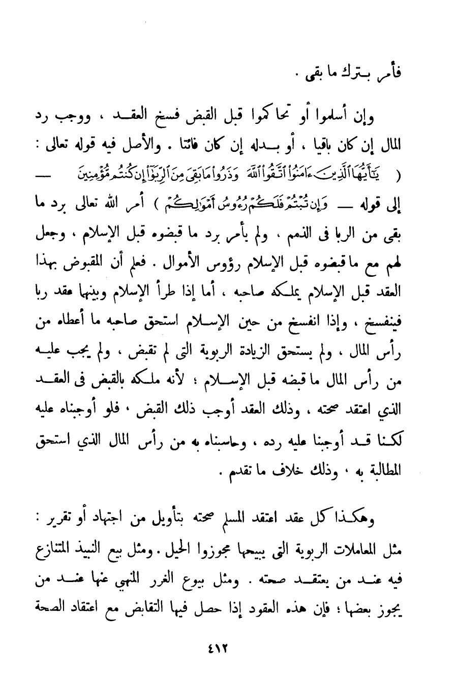 مُؤْمِنِينَ} فَأَمَرَ بِتَرْكِ مَا بَقِيَ. وَإِنْ أَسْلَمُوا أَوْ تَحَاكَمُوا قَبْلَ الْقَبْضِ فُسِخَ الْعَقْدُ وَوَجَبَ رَدُّ الْمَالِ إنْ كَانَ بَاقِيًا أَوْ بَدَلُهُ إنْ كَانَ فَائِتًا. وَالْأَصْلُ فِيهِ قَوْله تَعَالَى {يَا أَيُّهَا الَّذِينَ آمَنُوا اتَّقُوا اللَّهَ وَذَرُوا مَا بَقِيَ مِنَ الرِّبَا إنْ كُنْتُمْ مُؤْمِنِينَ} - إلَى قَوْلِهِ - {وَإِنْ تُبْتُمْ فَلَكُمْ رُءُوسُ أَمْوَالِكُمْ} أَمَرَ اللَّهُ تَعَالَى بِرَدِّ مَا بَقِيَ مِنْ الرِّبَا فِي الذِّمَمِ وَلَمْ يَأْمُرْ بِرَدِّ مَا قَبَضُوهُ قَبْلَ الْإِسْلَامِ وَجَعَلَ لَهُمْ مَعَ مَا قَبَضُوهُ قَبْلَ الْإِسْلَامِ رُءُوسَ الْأَمْوَالِ. فَعُلِمَ أَنَّ الْمَقْبُوضَ بِهَذَا الْعَقْدِ قَبْلَ الْإِسْلَامِ يَمْلِكُهُ صَاحِبُهُ أَمَّا إذَا طَرَأَ الْإِسْلَامُ وَبَيْنَهُمَا عَقْدُ رِبًا فَيَنْفَسِخُ وَإِذَا انْفَسَخَ مِنْ حِينِ الْإِسْلَامِ اسْتَحَقَّ صَاحِبُهُ مَا أَعْطَاهُ مِنْ رَأْسِ الْمَالِ وَلَمْ يَسْتَحِقَّ الزِّيَادَةَ الرِّبَوِيَّةَ الَّتِي لَمْ تُقْبَضْ وَلَمْ يَجِبْ عَلَيْهِ مِنْ رَأْسِ الْمَالِ مَا قَبَضَهُ قَبْلَ الْإِسْلَامِ؛ لِأَنَّهُ مَلَكَهُ بِالْقَبْضِ فِي الْعَقْدِ الَّذِي اعْتَقَدَ صِحَّتَهُ وَذَلِكَ الْعَقْدُ أَوْجَبَ ذَلِكَ الْقَبْضَ فَلَوْ أَوْجَبْنَاهُ عَلَيْهِ لَكُنَّا قَدْ أَوْجَبْنَا عَلَيْهِ رَدَّهُ وَحَاسَبْنَاهُ بِهِ مِنْ رَأْسِ الْمَالِ الَّذِي اسْتَحَقَّ الْمُطَالَبَةَ بِهِ وَذَلِكَ خِلَافُ مَا تَقَدَّمَ. وَهَكَذَا كُلُّ عَقْدٍ اعْتَقَدَ الْمُسْلِمُ صِحَّتَهُ بِتَأْوِيلٍ مِنْ اجْتِهَادٍ أَوْ تَقْرِيرٍ: مِثْلُ الْمُعَامَلَاتِ الرِّبَوِيَّةِ الَّتِي يُبِيحُهَا مُجَوِّزُو الْحِيَلِ. وَمِثْلُ بَيْعِ النَّبِيذِ الْمُتَنَازَعِ فِيهِ عِنْدَ مَنْ يَعْتَقِدُ صِحَّتَهُ. وَمِثْلُ بُيُوعِ الْغَرَرِ الْمَنْهِيِّ عَنْهَا عِنْدَ مَنْ يُجَوِّزُ بَعْضَهَا؛ فَإِنَّ هَذِهِ الْعُقُودَ إذَا حَصَلَ فِيهَا التَّقَابُضُ مَعَ اعْتِقَادِ الصِّحَّةِ