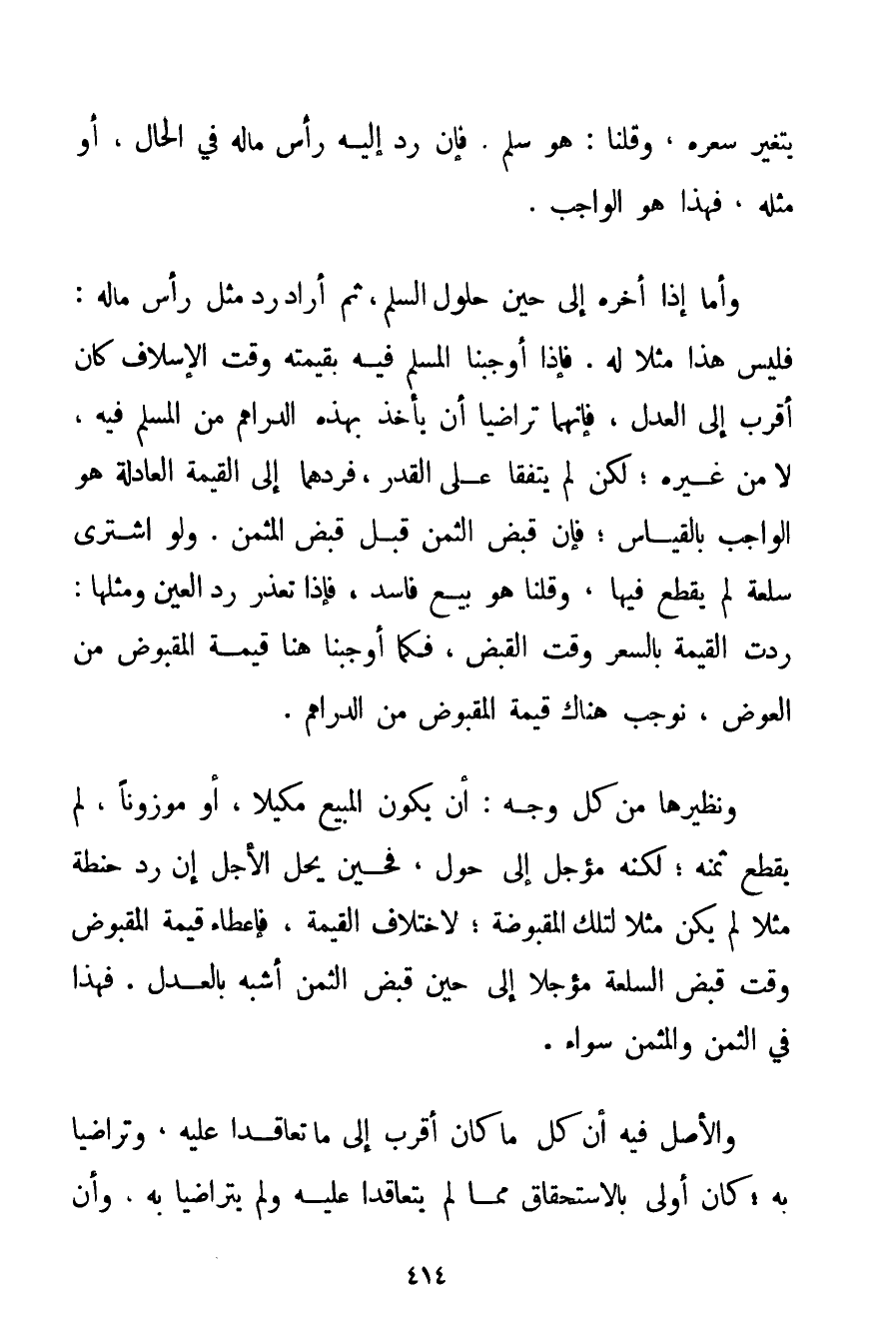 يَتَغَيَّرْ سِعْرُهُ وَقُلْنَا: هُوَ سَلَمٌ. فَإِنْ رَدَّ إلَيْهِ رَأْسَ مَالِهِ فِي الْحَالِ أَوْ مِثْلَهُ فَهَذَا هُوَ الْوَاجِبُ. وَأَمَّا إذَا أَخَّرَهُ إلَى حِينِ حُلُولِ السَّلَمِ ثُمَّ أَرَادَ رَدَّ مِثْلِ رَأْسِ مَالِهِ: فَلَيْسَ هَذَا مِثْلًا لَهُ. فَإِذَا أَوْجَبْنَا الْمُسْلَمَ فِيهِ بِقِيمَتِهِ وَقْتَ الْإِسْلَافِ كَانَ أَقْرَبَ إلَى الْعَدْلِ فَإِنَّهُمَا تَرَاضَيَا أَنْ يَأْخُذَ بِهَذِهِ الدَّرَاهِمِ مِنْ الْمُسْلَمِ فِيهِ لَا مِنْ غَيْرِهِ؛ لَكِنْ لَمْ يَتَّفِقَا عَلَى الْقَدْرِ فَرَدُّهُمَا إلَى الْقِيمَةِ الْعَادِلَةِ هُوَ الْوَاجِبُ بِالْقِيَاسِ؛ فَإِنَّ قَبْضَ الثَّمَنِ قَبْلَ قَبْضِ الْمُثَمَّنِ. وَلَوْ اشْتَرَى سِلْعَةً لَمْ يَقْطَعْ فِيهَا وَقُلْنَا هُوَ بَيْعٌ فَاسِدٌ فَإِذَا تَعَذَّرَ رَدُّ الْعَيْنِ وَمِثْلِهَا: رُدَّتْ الْقِيمَةُ بِالسِّعْرِ وَقْتَ الْقَبْضِ فَكَمَا أَوْجَبْنَا هُنَا قِيمَةَ الْمَقْبُوضِ مِنْ الْعِوَضِ نُوجِبُ هُنَاكَ قِيمَةَ الْمَقْبُوضِ مِنْ الدَّرَاهِمِ. وَنَظِيرُهَا مِنْ كُلِّ وَجْهٍ: أَنْ يَكُونَ الْمَبِيعُ مَكِيلًا أَوْ مَوْزُونًا لَمْ يُقْطَعْ ثَمَنُهُ؛ لَكِنَّهُ مُؤَجَّلٌ إلَى حَوْلٍ فَحِينَ يَحِلُّ الْأَجَلُ إنْ رَدَّ حِنْطَةً مِثْلًا لَمْ يَكُنْ مِثْلًا لِتِلْكَ الْمَقْبُوضَةِ؛ لِاخْتِلَافِ الْقِيمَةِ فَإِعْطَاءُ قِيمَةِ الْمَقْبُوضِ وَقْتَ قَبْضِ السِّلْعَةِ مُؤَجَّلًا إلَى حِينِ قَبْضِ الثَّمَنِ أَشْبَهُ بِالْعَدْلِ. فَهَذَا فِي الثَّمَنِ وَالْمُثَمَّنِ سَوَاءٌ. وَالْأَصْلُ فِيهِ أَنَّ كُلَّ مَا كَانَ أَقْرَبَ إلَى مَا تَعَاقَدَا عَلَيْهِ وَتَرَاضَيَا بِهِ؛ كَانَ أَوْلَى بِالِاسْتِحْقَاقِ مِمَّا لَمْ يَتَعَاقَدَا عَلَيْهِ وَلَمْ يَتَرَاضَيَا بِهِ وَأَنَّ