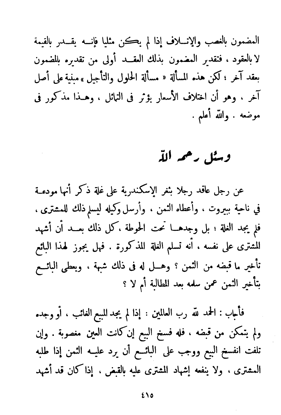 عَنْ رَجُلٍ عَاقَدَ رَجُلًا بِثَغْرِ الإسكندرية عَلَى غَلَّةٍ ذَكَرَ أَنَّهَا مُودَعَةٌ فِي نَاحِيَةٍ بِبَيْرُوتَ وَأَعْطَاهُ الثَّمَنَ وَأَرْسَلَ وَكِيلَهُ لِيُسَلِّمَ ذَلِكَ لِلْمُشْتَرِي فَلَمْ يَجِدْ الْغَلَّةَ؛ بَلْ وَجَدَهَا تَحْتَ الْحَوْطَةِ كُلُّ ذَلِكَ بَعْدَ أَنْ أَشْهَدَ الْمُشْتَرِي عَلَى نَفْسِهِ أَنَّهُ تَسَلَّمَ الْغَلَّةَ الْمَذْكُورَةَ. فَهَلْ يَجُوزُ لِهَذَا الْبَائِعِ تَأْخِيرُ مَا قَبَضَهُ مِنْ الثَّمَنِ؟ وَهَلْ لَهُ فِي ذَلِكَ شُبْهَةٌ وَيُعْطِي الْبَائِعَ بِتَأْخِيرِ الثَّمَنِ عَمَّنْ سَلَّمَهُ بَعْدَ الْمُطَالَبَةِ أَمْ لَا؟