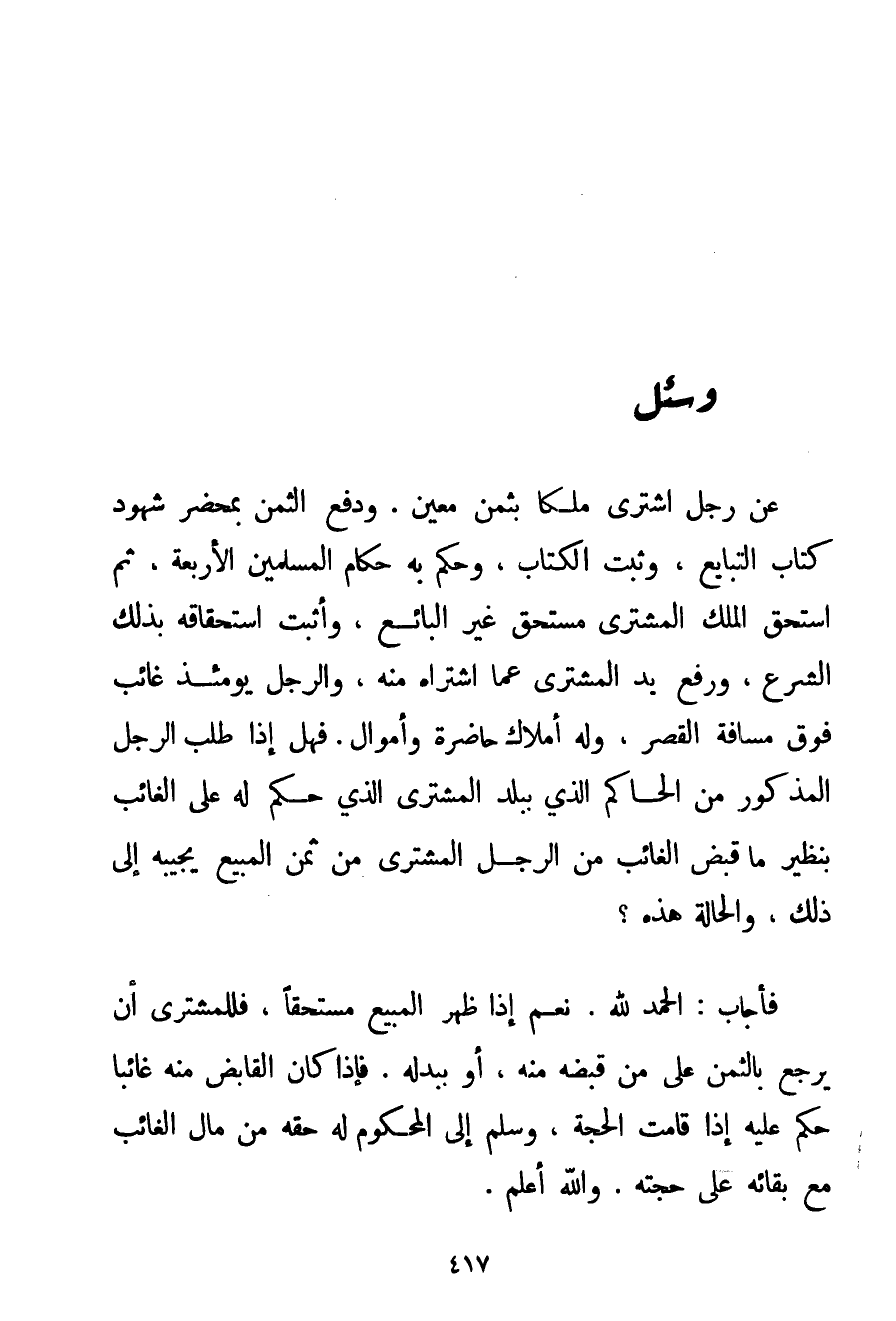 الْحَمْدُ لِلَّهِ، نَعَمْ إذَا ظَهَرَ الْمَبِيعُ مُسْتَحَقًّا فَلِلْمُشْتَرِي أَنْ يَرْجِعَ بِالثَّمَنِ عَلَى مَنْ قَبَضَهُ مِنْهُ أَوْ بِبَدَلِهِ. فَإِذَا كَانَ الْقَابِضُ مِنْهُ غَائِبًا حُكِمَ عَلَيْهِ إذَا قَامَتْ الْحُجَّةُ وَسَلَّمَ إلَى الْمَحْكُومِ لَهُ حَقَّهُ مِنْ مَالِ الْغَائِبِ مَعَ بَقَائِهِ عَلَى حُجَّتِهِ. وَاَللَّهُ أَعْلَمُ.