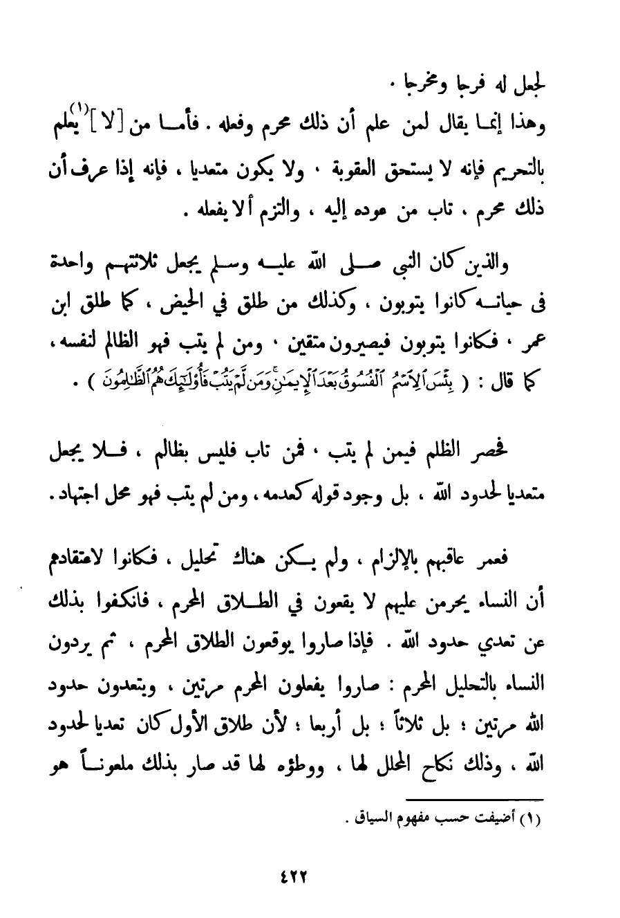 لَجَعَلَ لَهُ فَرَجًا وَمُخْرَجًا. وَهَذَا إنَّمَا يُقَالُ لِمَنْ عَلِمَ أَنَّ ذَلِكَ مُحَرَّمٌ وَفَعَلَهُ. فَأَمَّا مَنْ لَا يَعْلَمُ بِالتَّحْرِيمِ فَإِنَّهُ لَا يَسْتَحِقُّ الْعُقُوبَةَ وَلَا يَكُونُ مُتَعَدِّيًا فَإِنَّهُ إذَا عَرَفَ أَنَّ ذَلِكَ مُحَرَّمٌ تَابَ مِنْ عَوْدِهِ إلَيْهِ وَالْتَزَمَ أَلَّا يَفْعَلَهُ. وَاَلَّذِينَ كَانَ النَّبِيُّ صَلَّى اللَّهُ عَلَيْهِ وَسَلَّمَ يَجْعَلُ ثَلَاثَتَهُمْ وَاحِدَةً فِي حَيَاتِهِ كَانُوا يَتُوبُونَ وَكَذَلِكَ مَنْ طَلَّقَ فِي الْحَيْضِ كَمَا طَلَّقَ ابْنُ عُمَرَ فَكَانُوا يَتُوبُونَ فَيَصِيرُونَ مُتَّقِينَ وَمَنْ لَمْ يَتُبْ فَهُوَ الظَّالِمُ لِنَفْسِهِ كَمَا قَالَ: {بِئْسَ الِاسْمُ الْفُسُوقُ بَعْدَ الْإِيمَانِ وَمَنْ لَمْ يَتُبْ فَأُولَئِكَ هُمُ الظَّالِمُونَ} . فَحَصَرَ الظُّلْمَ فِيمَنْ لَمْ يَتُبْ فَمَنْ تَابَ فَلَيْسَ بِظَالِمِ فَلَا يُجْعَلُ مُتَعَدِّيًا لِحُدُودِ اللَّهِ بَلْ وُجُودُ قَوْلِهِ كَعَدَمِهِ وَمَنْ لَمْ يَتُبْ فَهُوَ مَحَلُّ اجْتِهَادٍ. فَعُمَرُ عَاقَبَهُمْ بِالْإِلْزَامِ وَلَمْ يَكُنْ هُنَاكَ تَحْلِيلٌ فَكَانُوا لِاعْتِقَادِهِمْ أَنَّ النِّسَاءَ يَحْرُمْنَ عَلَيْهِمْ لَا يَقَعُونَ فِي الطَّلَاقِ الْمُحَرَّمِ فَانْكَفُّوا بِذَلِكَ عَنْ تَعَدِّي حُدُودِ اللَّهِ. فَإِذَا صَارُوا يُوقِعُونَ الطَّلَاقَ الْمُحَرَّمَ ثُمَّ يَرُدُّونَ النِّسَاءَ بِالتَّحْلِيلِ الْمُحَرَّمِ: صَارُوا يَفْعَلُونَ الْمُحَرَّمَ مَرَّتَيْنِ وَيَتَعَدَّوْنَ حُدُودَ اللَّهِ مَرَّتَيْنِ؛ بَلْ ثَلَاثًا؛ بَلْ أَرْبَعًا؛ لِأَنَّ طَلَاقَ الْأَوَّلِ كَانَ تَعَدِّيًا لِحُدُودِ اللَّهِ وَذَلِكَ نِكَاحُ الْمُحَلَّلِ لَهَا وَوَطْؤُهُ لَهَا قَدْ صَارَ بِذَلِكَ مَلْعُونًا هُوَ