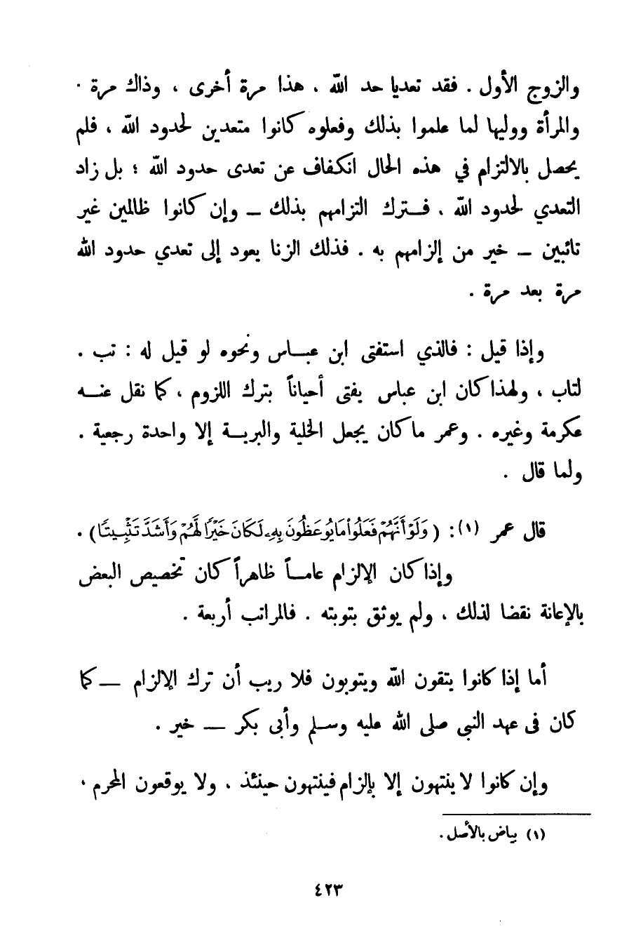 وَالزَّوْجُ الْأَوَّلُ. فَقَدْ تَعَدَّيَا حَدَّ اللَّهِ هَذَا مَرَّةً أُخْرَى وَذَاكَ مَرَّةً. وَالْمَرْأَةُ وَوَلِيُّهَا لَمَّا عَلِمُوا بِذَلِكَ وَفَعَلُوهُ كَانُوا مُتَعَدِّينَ لِحُدُودِ اللَّهِ فَلَمْ يَحْصُلْ بِالِالْتِزَامِ فِي هَذِهِ الْحَالِ انْكِفَافٌ عَنْ تَعَدِّي حُدُودِ اللَّهِ؛ بَلْ زَادَ التَّعَدِّي لِحُدُودِ اللَّهِ فَتَرَكَ الْتِزَامَهُمْ بِذَلِكَ - وَإِنْ كَانُوا ظَالِمِينَ غَيْرَ تَائِبِينَ - خَيْرٌ مِنْ إلْزَامِهِمْ بِهِ. فَذَلِكَ الزِّنَا يَعُودُ إلَى تَعَدِّي حُدُودِ اللَّهِ مَرَّةً بَعْدَ مَرَّةٍ. وَإِذَا قِيلَ: فَاَلَّذِي اسْتَفْتَى ابْنَ عَبَّاسٍ وَنَحْوَهُ لَوْ قِيلَ لَهُ: تُبْ. لَتَابَ وَلِهَذَا كَانَ ابْنُ عَبَّاسٍ يُفْتِي أَحْيَانًا بِتَرْكِ اللُّزُومِ كَمَا نَقَلَ عَنْهُ عِكْرِمَةُ وَغَيْرُهُ. وَعُمَرُ مَا كَانَ يَجْعَلُ الْخَلِيَّةَ وَالْبَرِيَّةَ إلَّا وَاحِدَةً رَجْعِيَّةً. وَلَمَّا قَالَ. قَالَ عُمَرُ (1) : {وَلَوْ أَنَّهُمْ فَعَلُوا مَا يُوعَظُونَ بِهِ لَكَانَ خَيْرًا لَهُمْ وَأَشَدَّ تَثْبِيتًا} . وَإِذَا كَانَ الْإِلْزَامُ عَامًّا ظَاهِرًا كَانَ تَخْصِيصُ الْبَعْضِ بِالْإِعَانَةِ نَقْضًا لِذَلِكَ وَلَمْ يُوثَقْ بِتَوْبَتِهِ. فَالْمَرَاتِبُ أَرْبَعَةٌ. أَمَّا إذَا كَانُوا يَتَّقُونَ اللَّهَ وَيَتُوبُونَ فَلَا رَيْبَ أَنَّ تَرْكَ الْإِلْزَامِ - كَمَا كَانَ فِي عَهْدِ النَّبِيِّ صَلَّى اللَّهُ عَلَيْهِ وَسَلَّمَ وَأَبِي بَكْرٍ - خَيْرٌ. وَإِنْ كَانُوا لَا يَنْتَهُونَ إلَّا بِإِلْزَامٍ فَيَنْتَهُونَ حِينَئِذٍ وَلَا يُوقِعُونَ الْمُحَرَّمَ