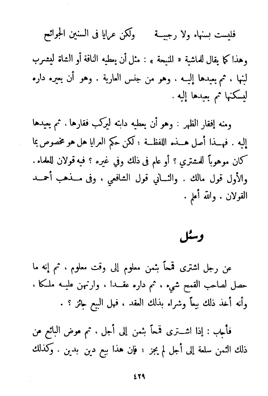 وَهَذَا كَمَا يُقَالُ لِلْمَاشِيَةِ " الْمَنِيحَةِ ": مِثْلُ أَنْ يُعْطِيَهُ النَّاقَةَ أَوْ الشَّاةَ لِيَشْرَبَ لَبَنَهَا ثُمَّ يُعِيدُهَا إلَيْهِ وَهُوَ مِنْ جِنْسِ الْعَارِيَةِ. وَهُوَ أَنْ يُعِيرَهُ دَارَهُ لِيَسْكُنَهَا ثُمَّ يُعِيدُهَا إلَيْهِ. وَمِنْهُ أَفَقَارُ الظَّهْرِ: وَهُوَ أَنْ يُعْطِيَهُ دَابَّتَهُ لِيَرْكَبَ فَقَارَهَا ثُمَّ يُعِيدُهَا إلَيْهِ. فَهَذَا أَصْلُ هَذِهِ اللَّفْظَةِ؛ لَكِنْ حُكْمُ الْعَرَايَا هَلْ هُوَ مَخْصُوصٌ بِمَا كَانَ مَوْهُوبًا لِلْمُشْتَرِي؟ أَوْ عَامٌّ فِي ذَلِكَ وَفِي غَيْرِهِ؟ فِيهِ قَوْلَانِ لِلْعُلَمَاءِ. وَالْأَوَّلُ قَوْلُ مَالِكٍ. وَالثَّانِي قَوْلُ الشَّافِعِيِّ وَفِي مَذْهَبِ أَحْمَد الْقَوْلَانِ. وَاَللَّهُ أَعْلَمُ.